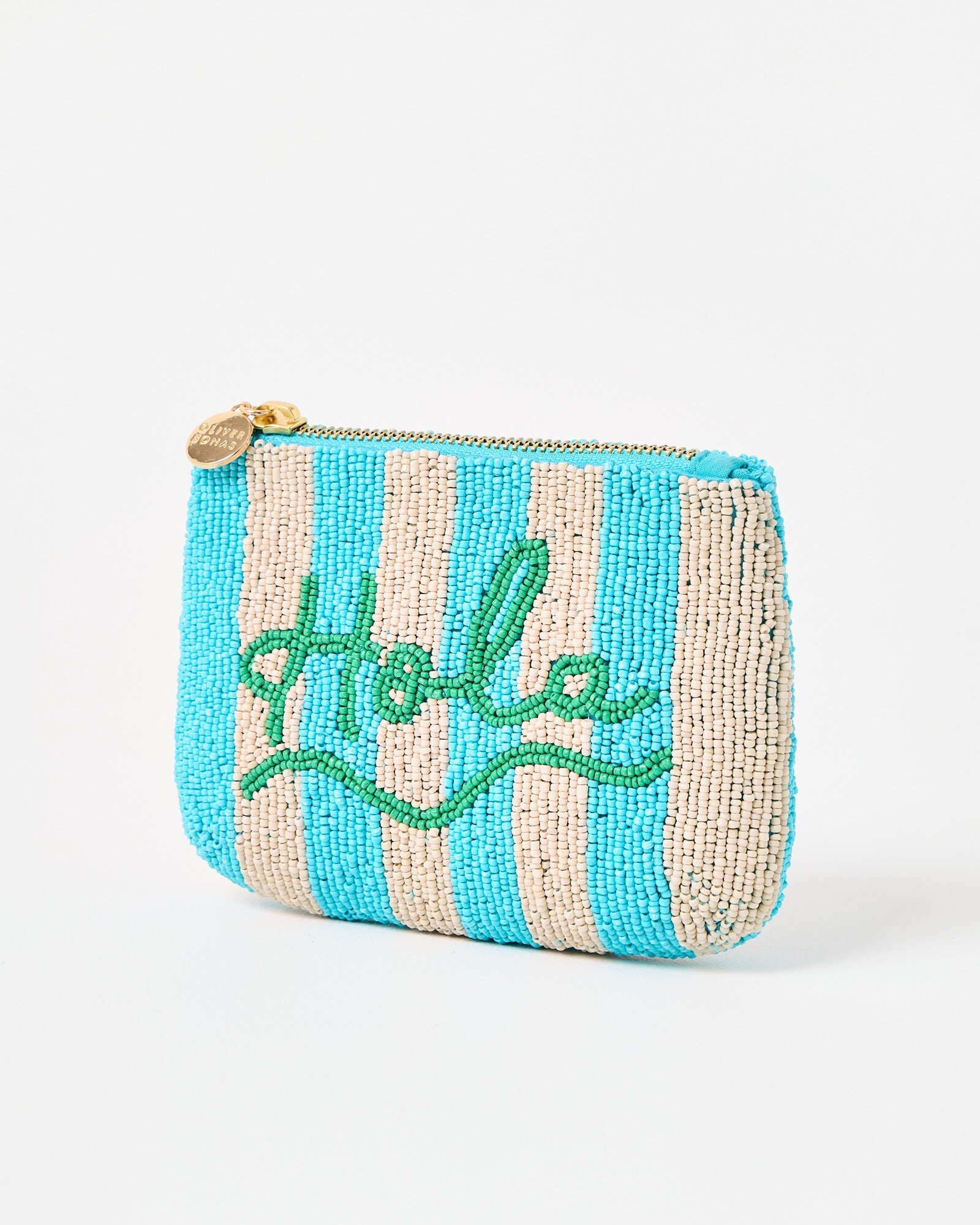 Hola! Keep your essentials stylishly secure this summer in our fun little zipped pouch that likes to say hello. In Spanish. Carefully crafted with intricate beadwork in a vivid aqua blue and cream striped pattern, we added a playful green beaded slogan because it's the little things that make us smile. Designed with a blue cotton lining and gold coloured zip with a gold tone Oliver Bonas logo charm, it's colourful, compact and can be used to keep lippy or hair grips in or as a holiday purse.