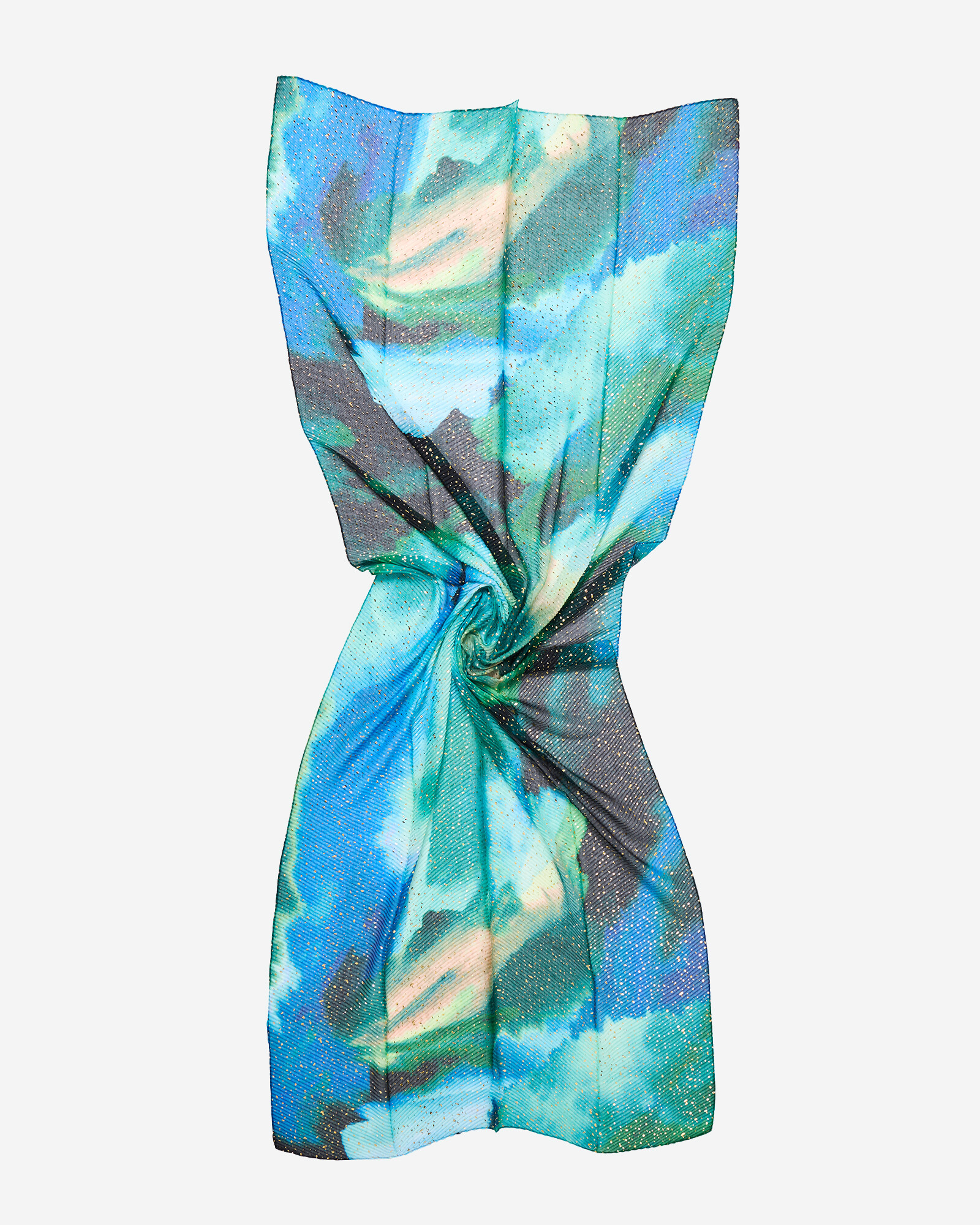 Pleated lightweight scarf with a tonal blue infinity pattern and small gold foil flecks.
