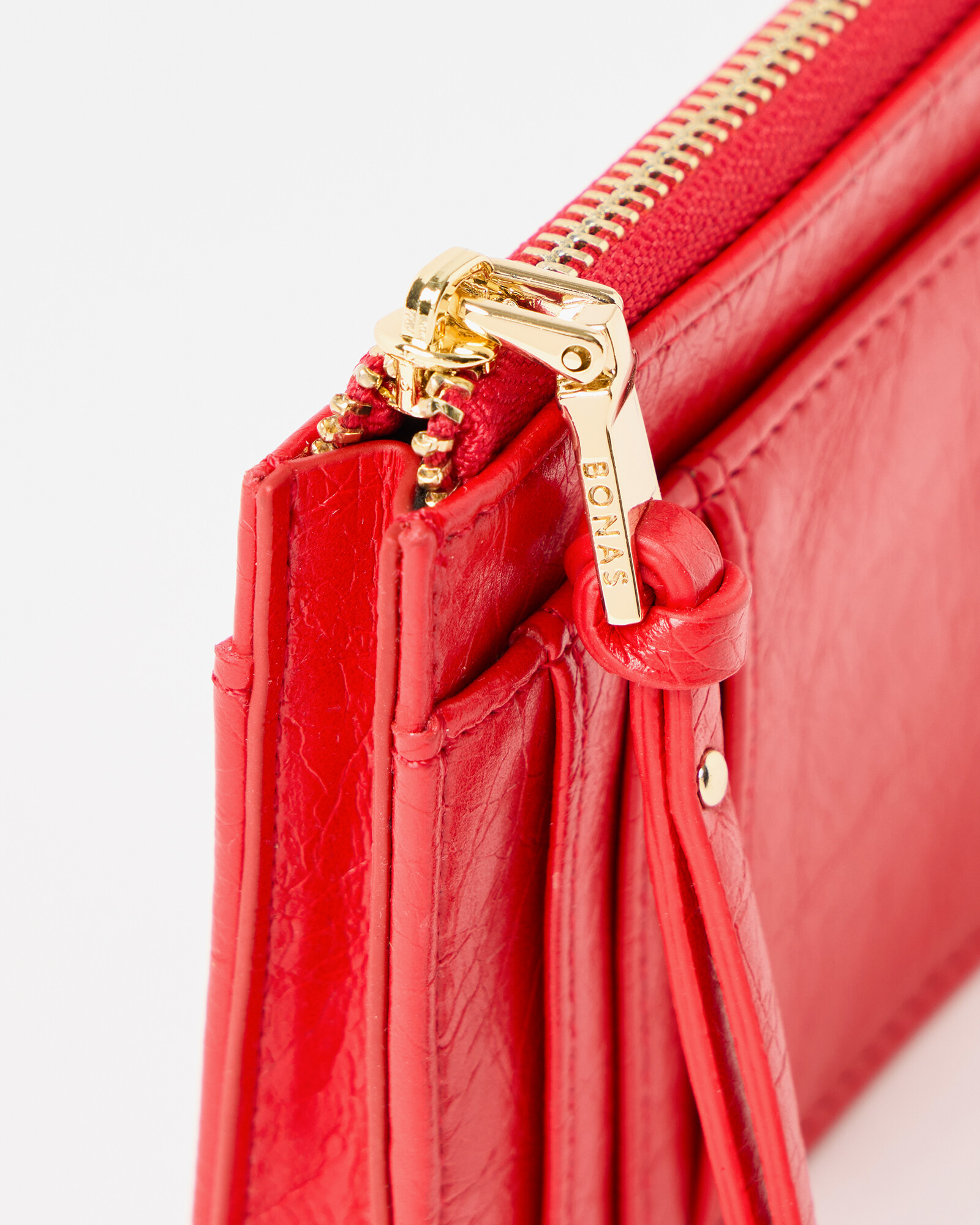 Red card holder with a small zipped pocket and card slots on both sides.
