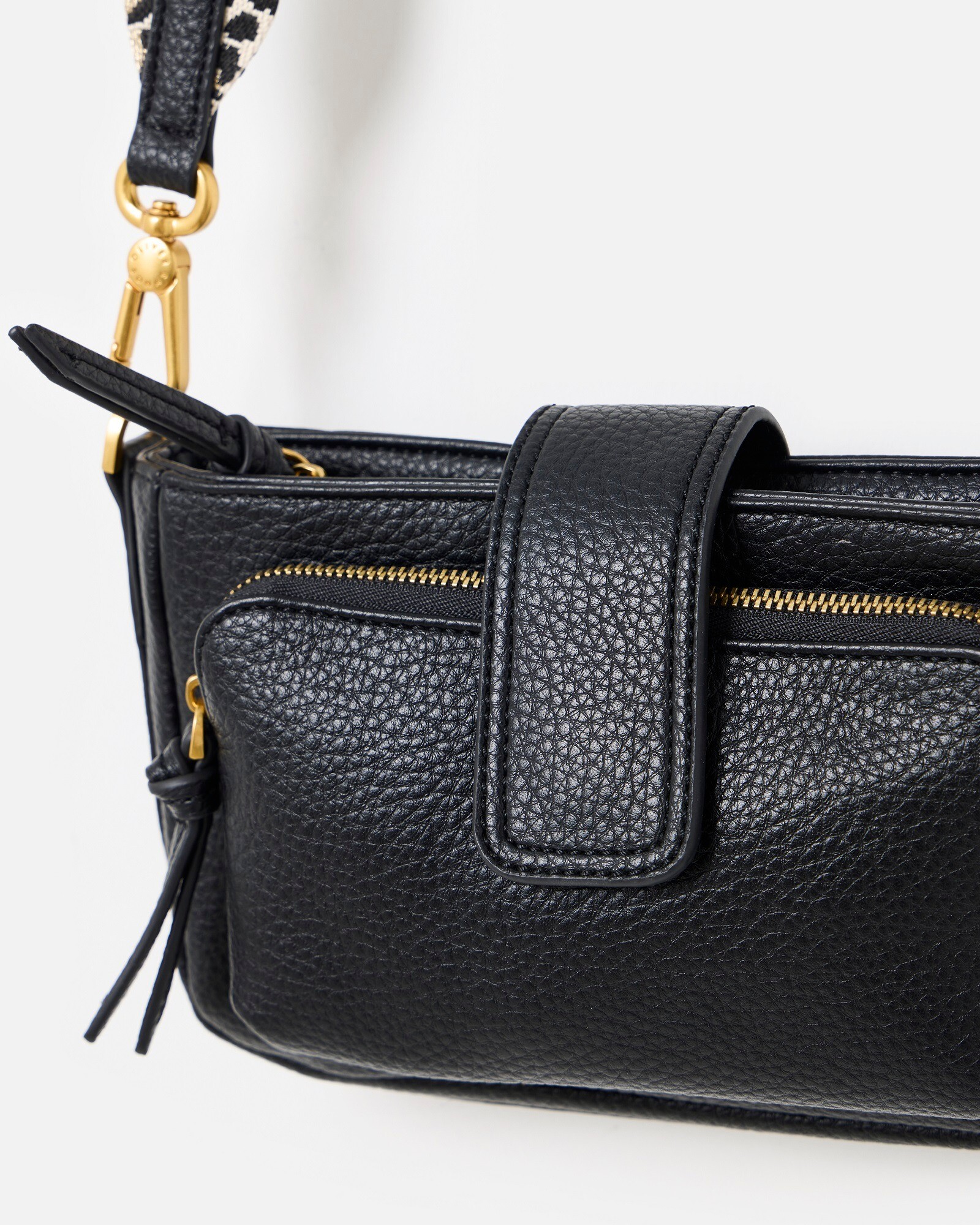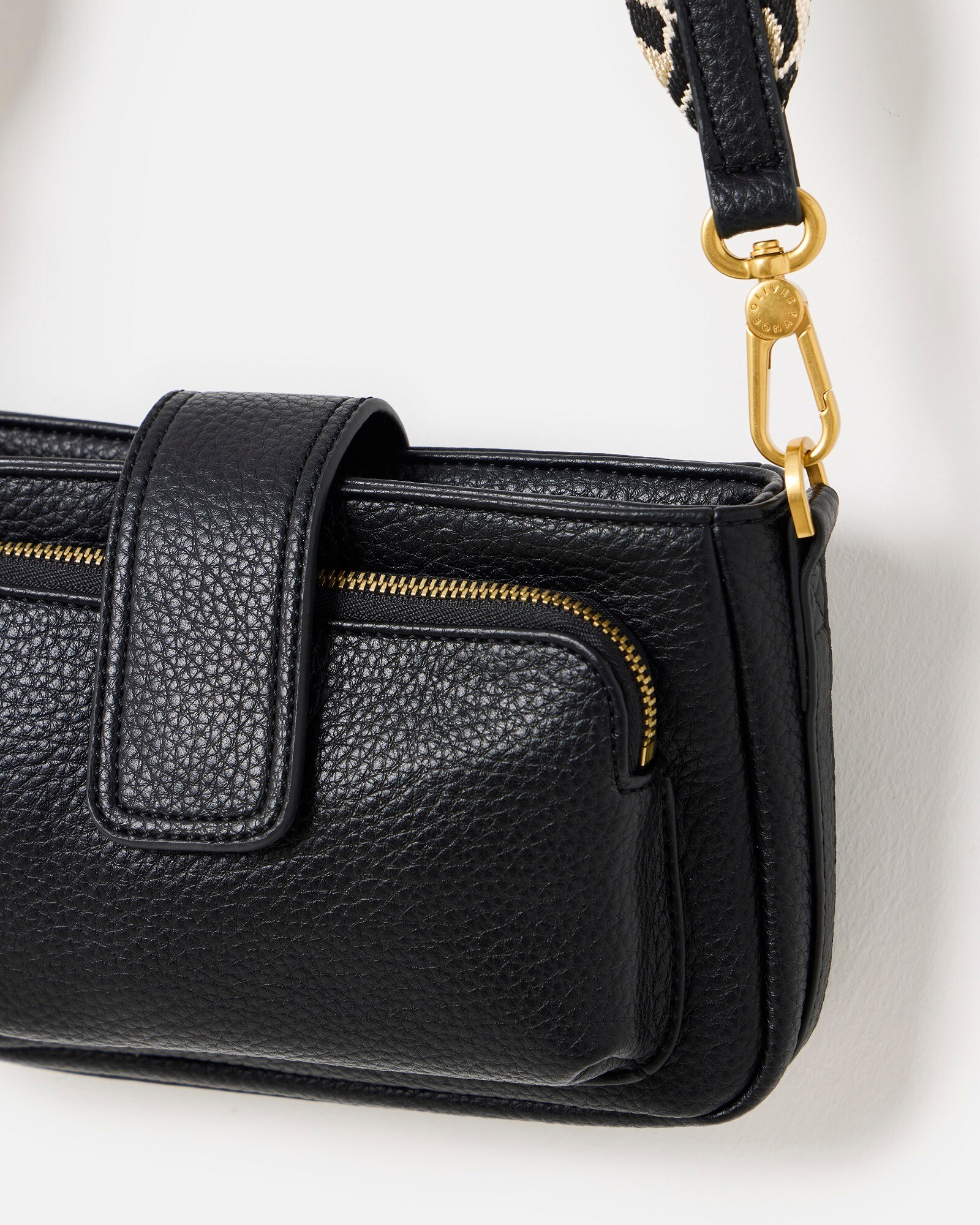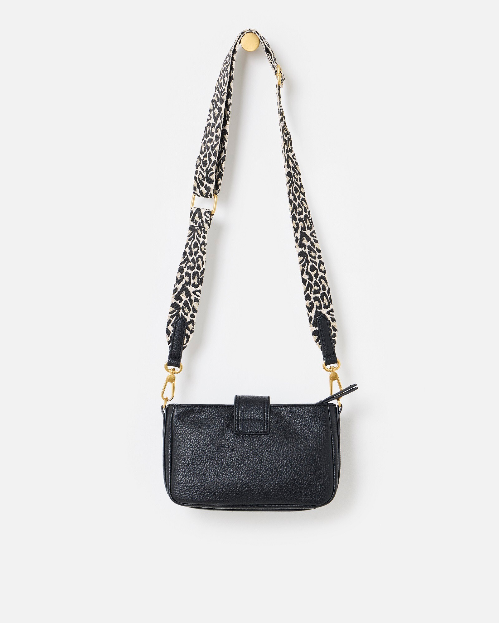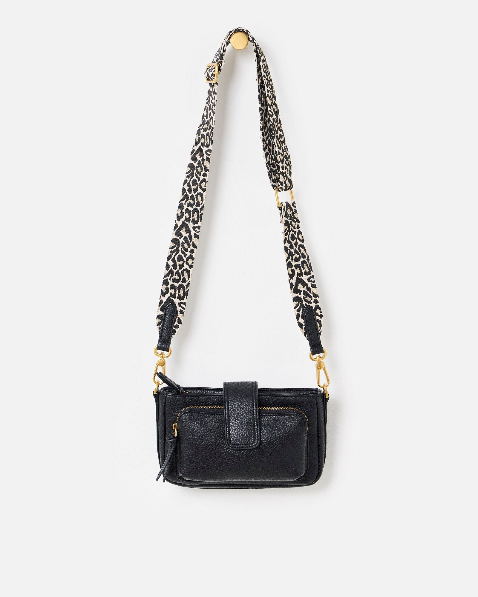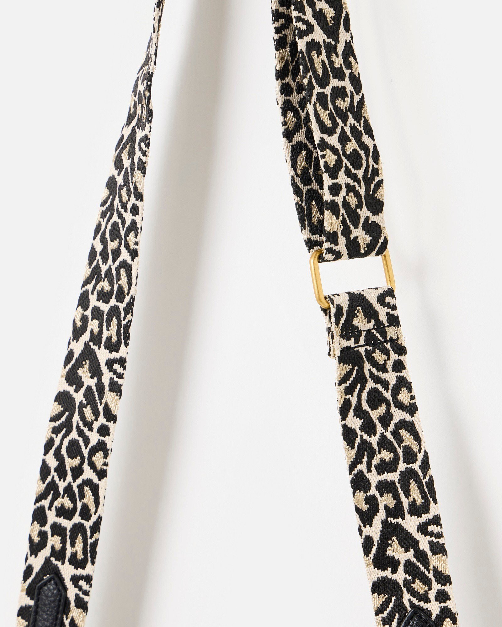 In a slim, compact shape, our black crossbody bag is the everyday hands-free hero you've been looking for. With two zipped compartments to organise your essentials, it features a flap over detail secured with a magnetic closure. In a mid grain finish, we've added an adjustable tonal brown leopard print crossbody strap that can be easily swapped for versatile styling, because we know you like options.