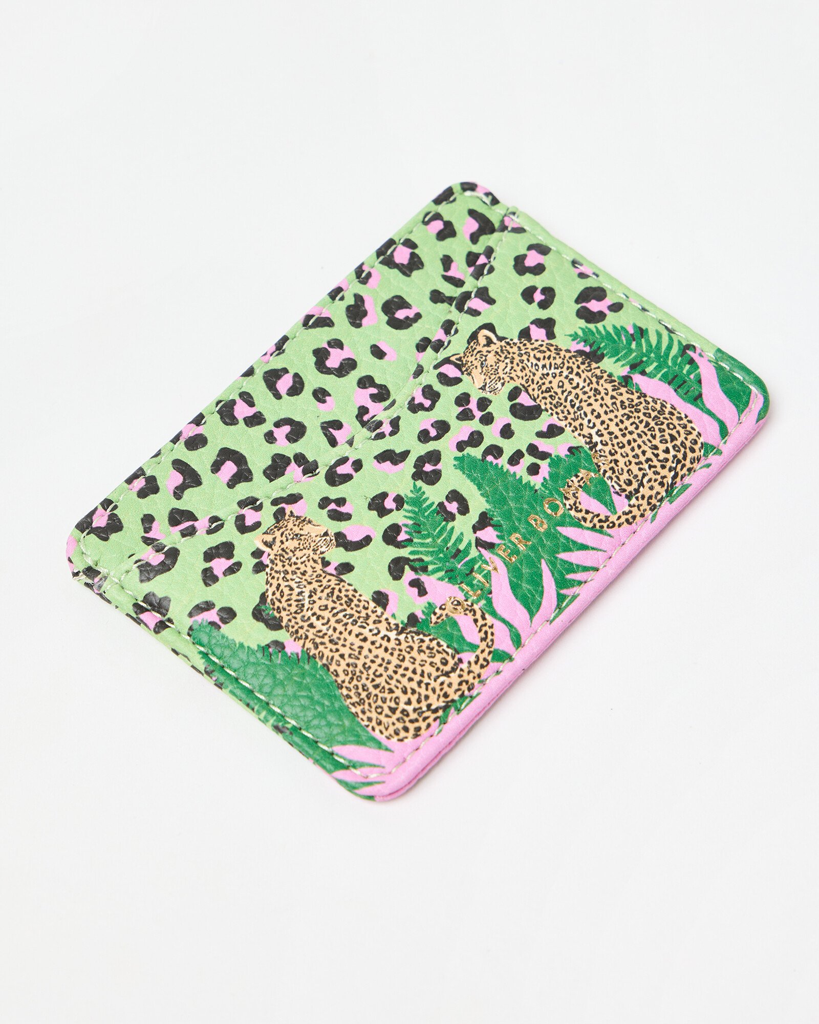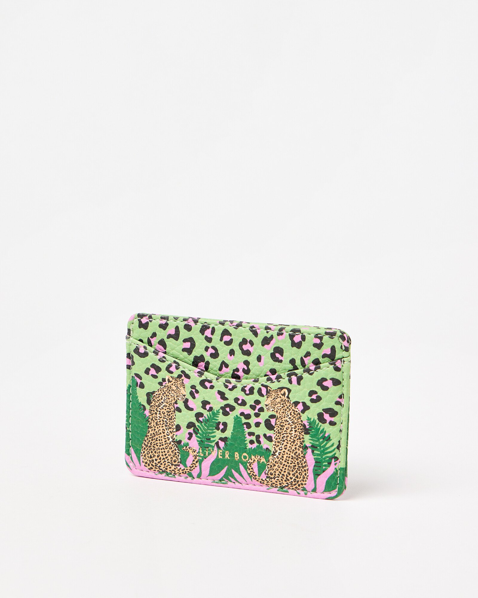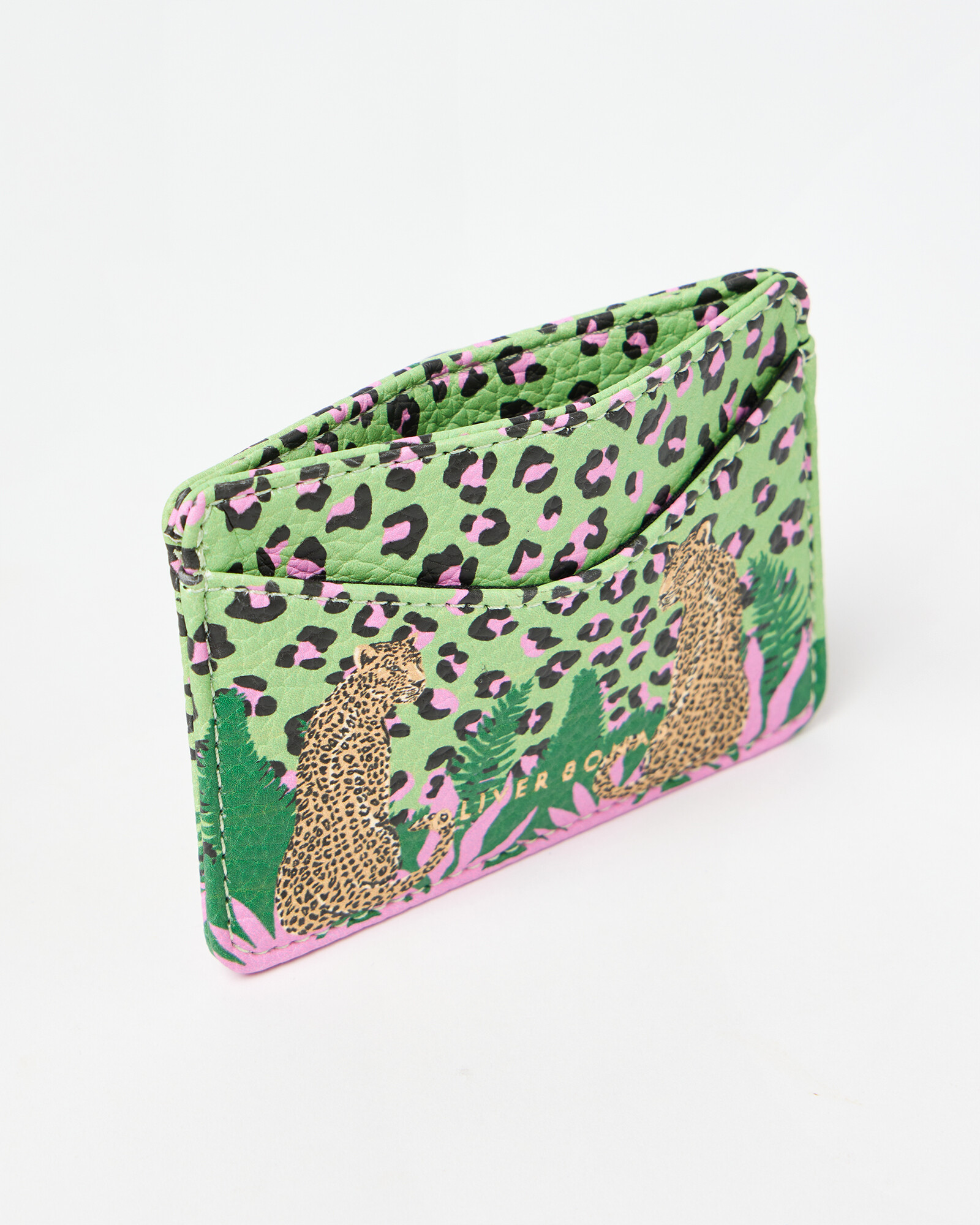Green card holder with a pale tree leopard pattern designed in the OB creative studios.