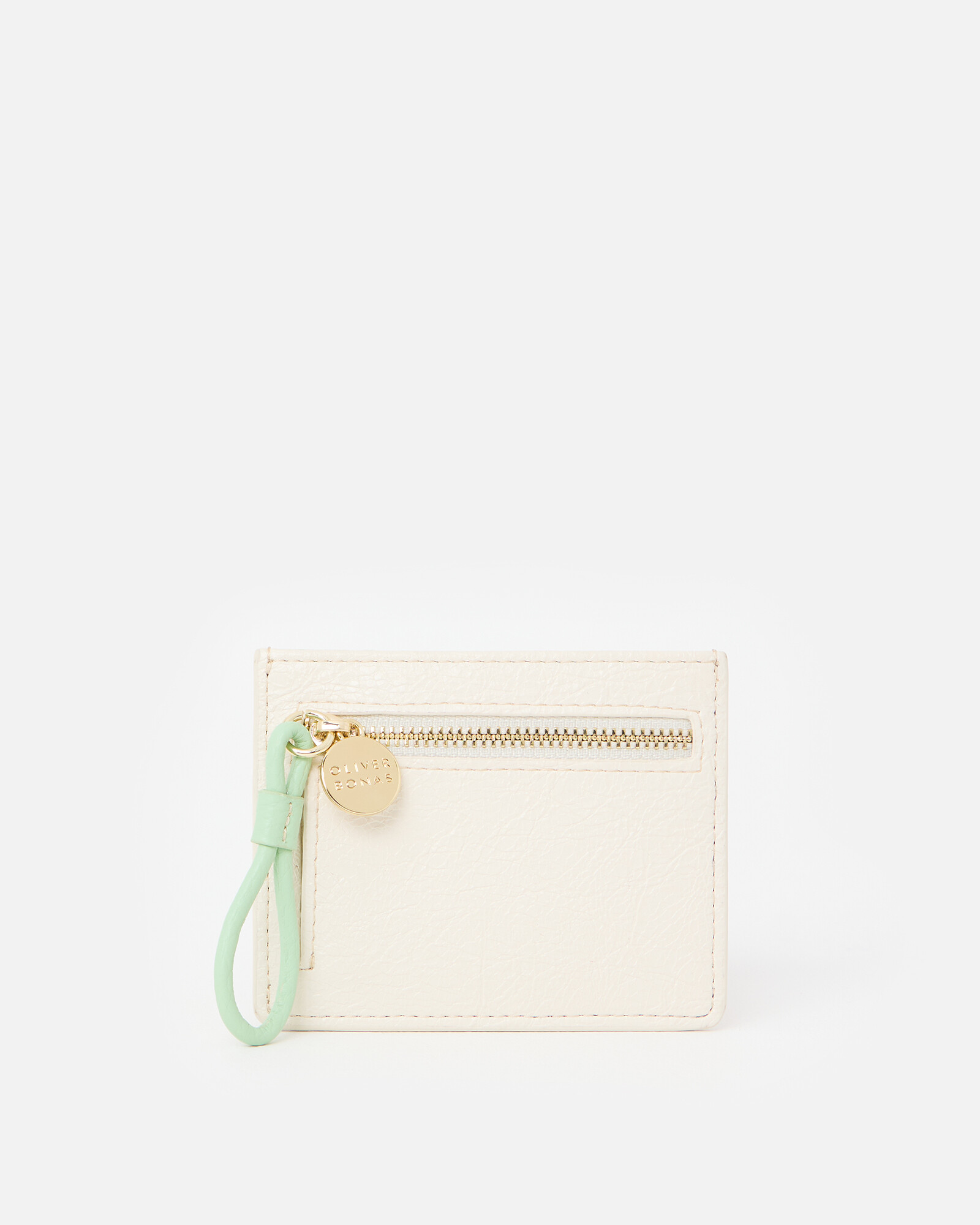 Slim ecru card holder with alternating card slots in metallic gold, and pastel tones of blue and green. Designed with a zipped pocket on the back, gold OB logo and a pastel green zip loop.