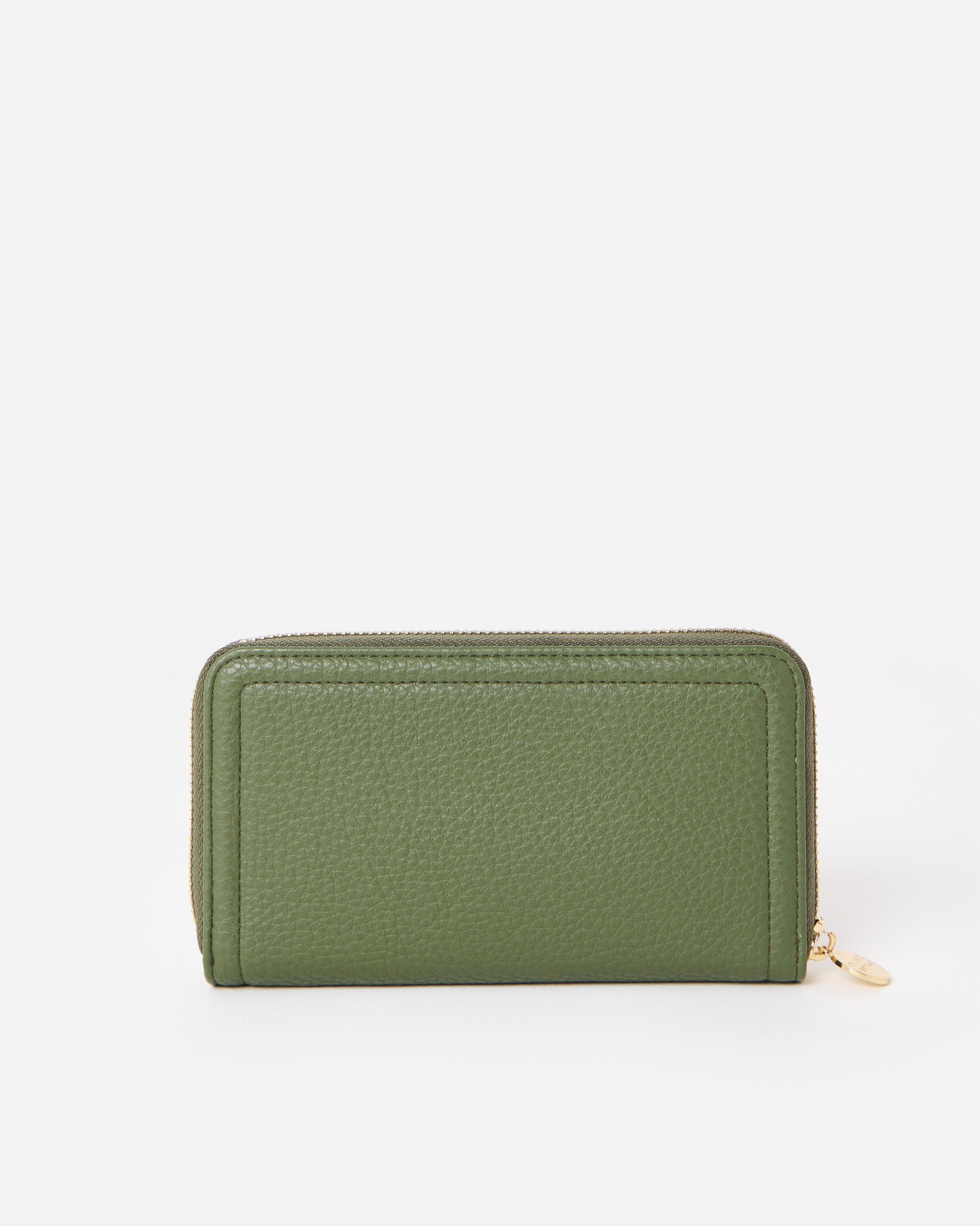 Keep your cards and cash organised and secure with our khaki green purse. With handy card slots and a zipped pocket for coins, we've added a bright pink interior for an unexpected colour-pop. Designed with gold zips and a gold charm, the heavy grain finish is complete with an embossed Oliver Bonas logo on the front.