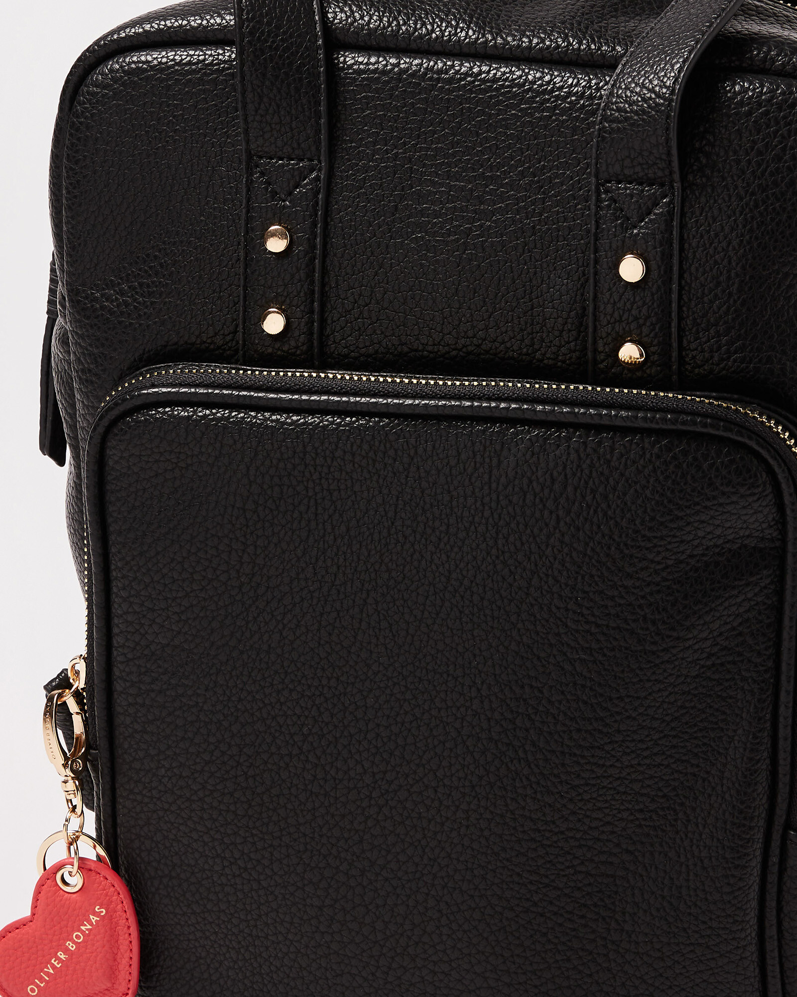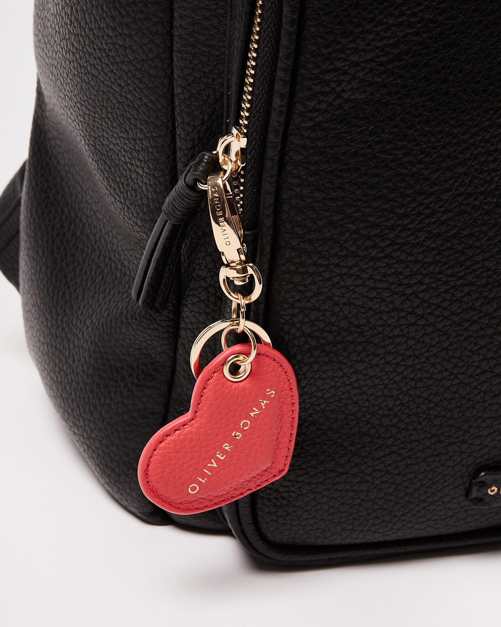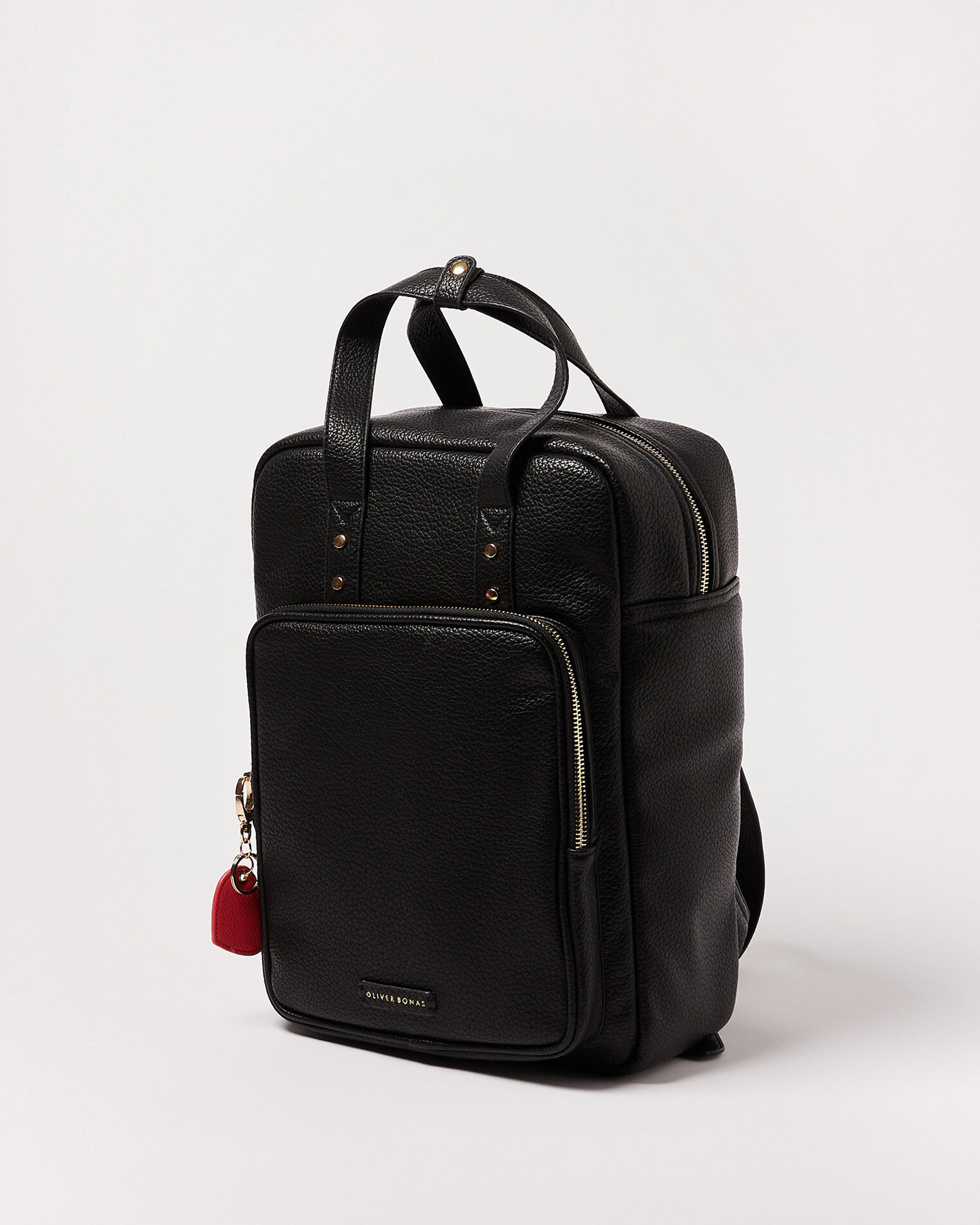 This black backpack is designed to comfortably fit your laptop, with two short straps at the top to carry by hand or wear on your back. With two exterior zipped pockets for easy access to smaller items, this backpack is complete with a red heart charm.
