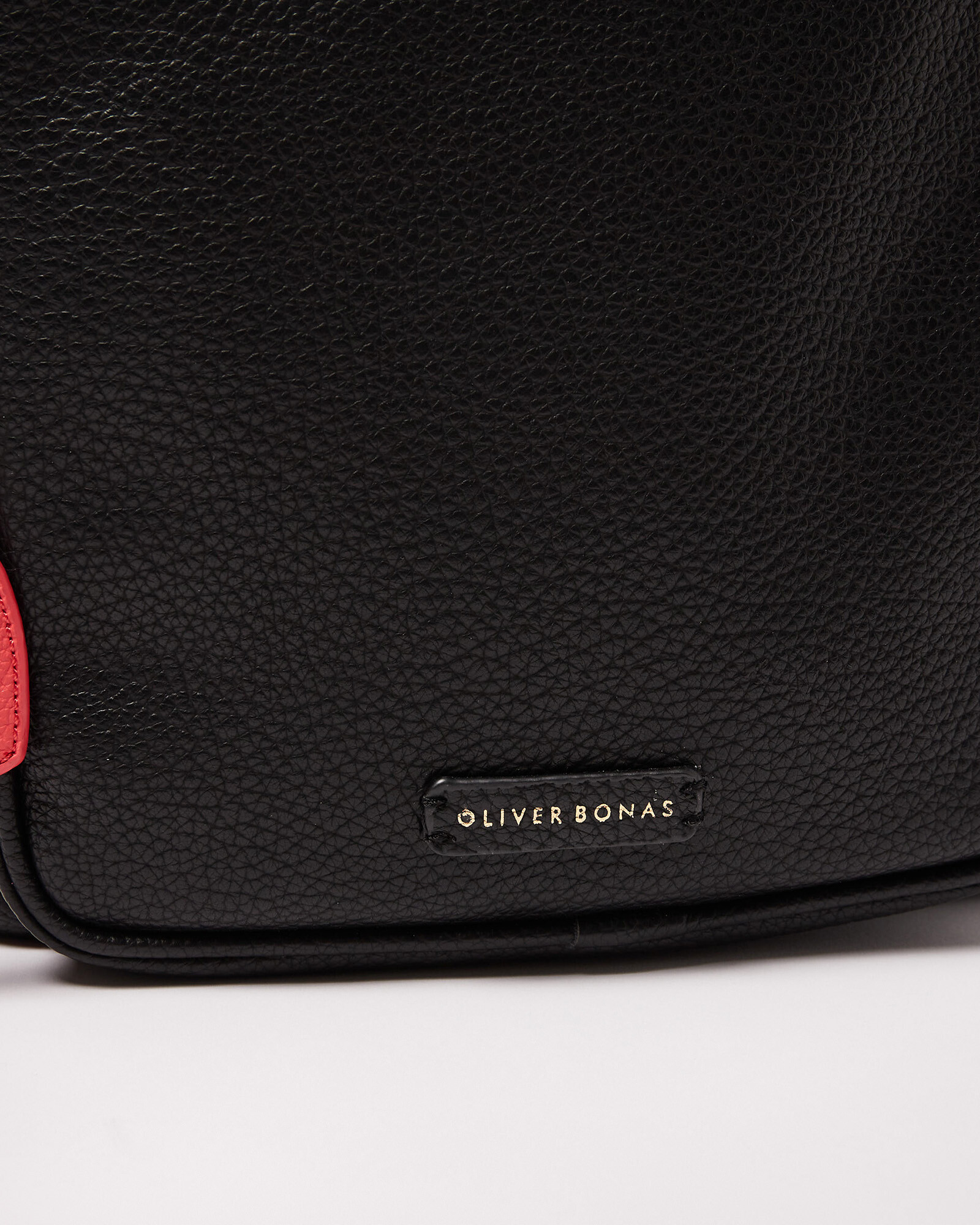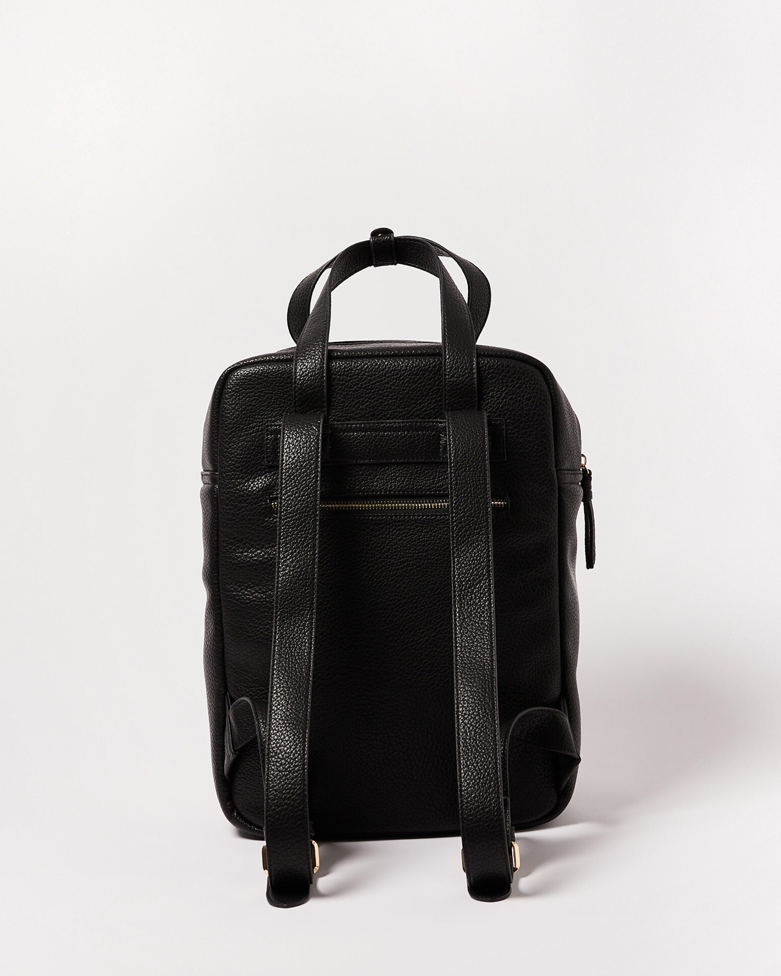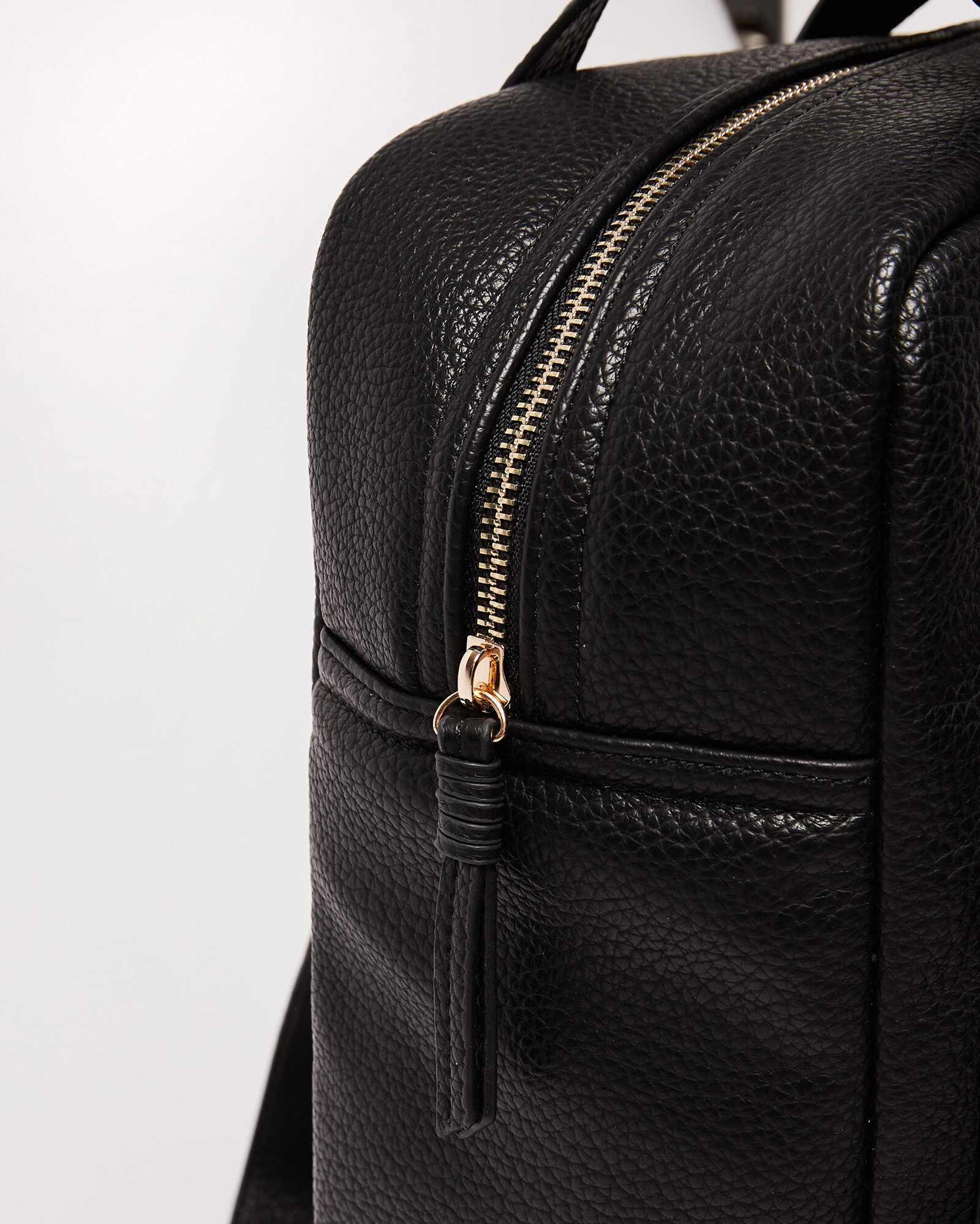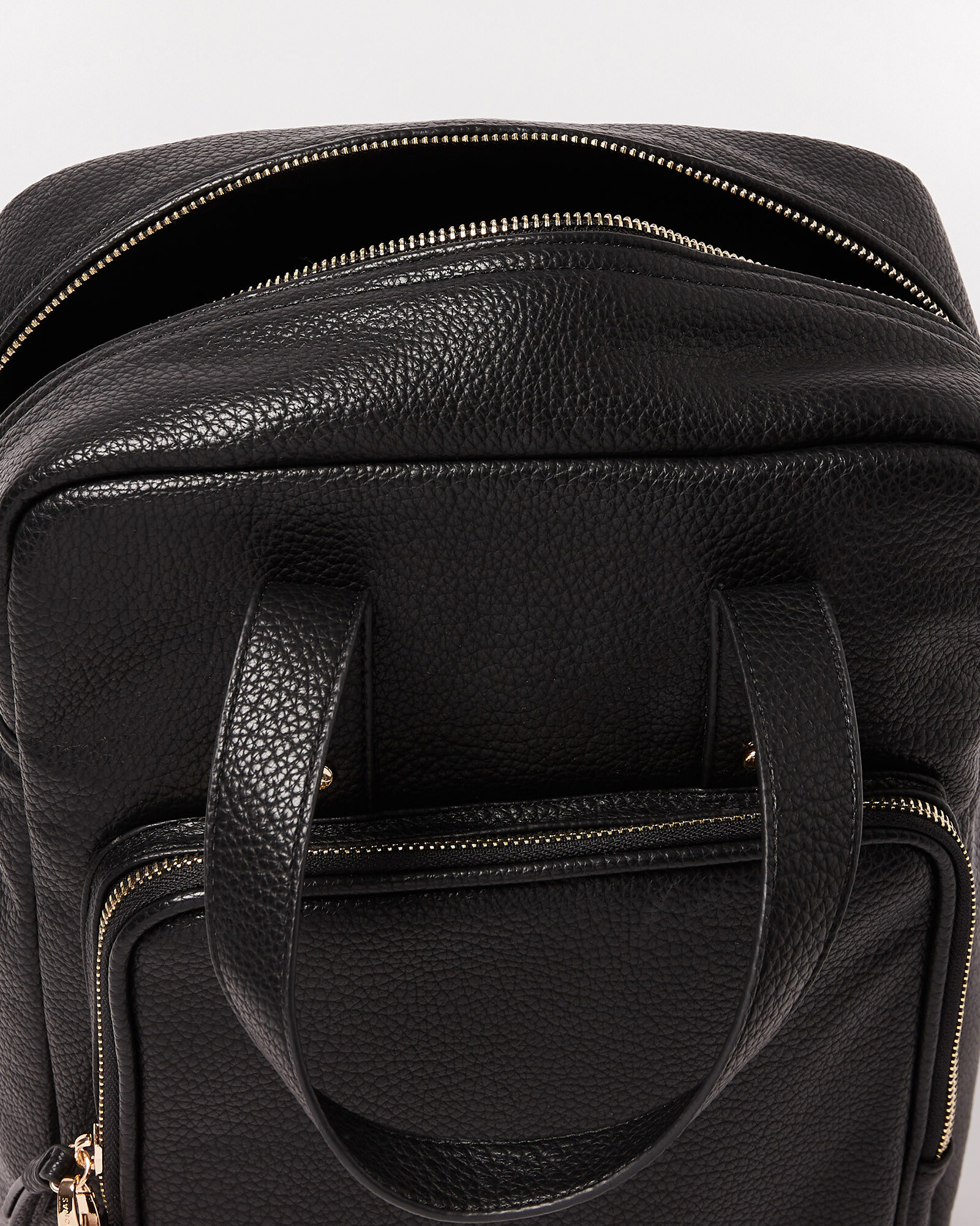 This black backpack is designed to comfortably fit your laptop, with two short straps at the top to carry by hand or wear on your back. With two exterior zipped pockets for easy access to smaller items, this backpack is complete with a red heart charm.