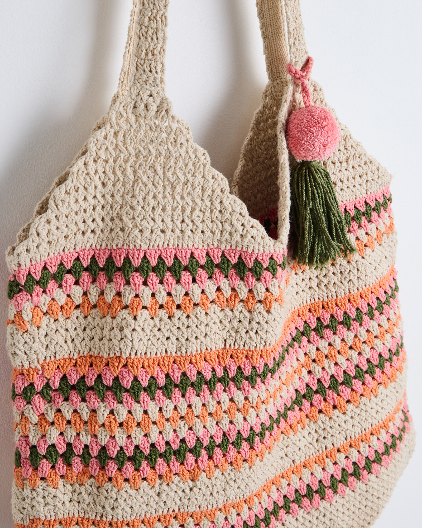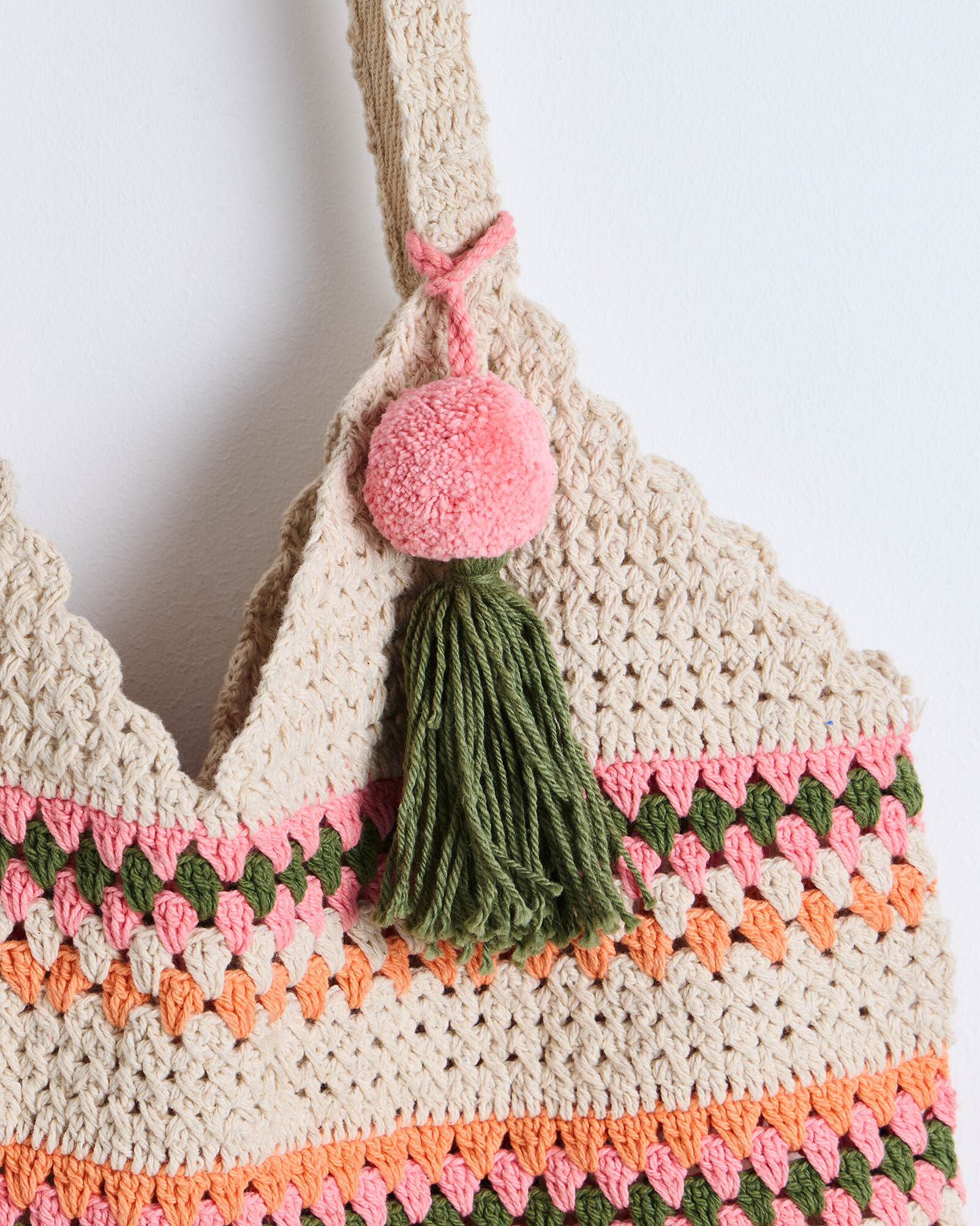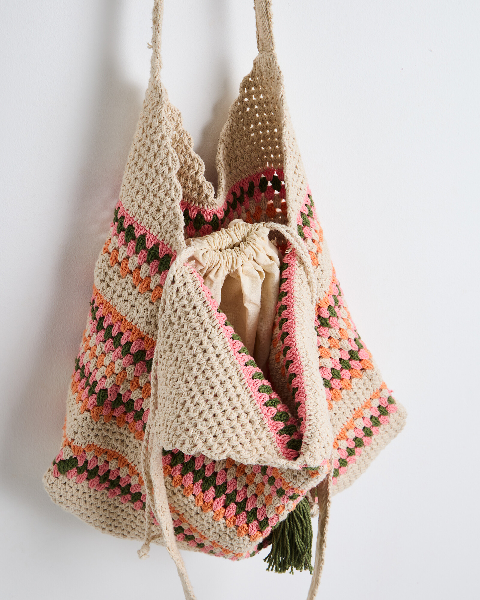 Cotton tote bag crocheted in a pink, orange and green stripe with a tassel detail and drawstring closure.