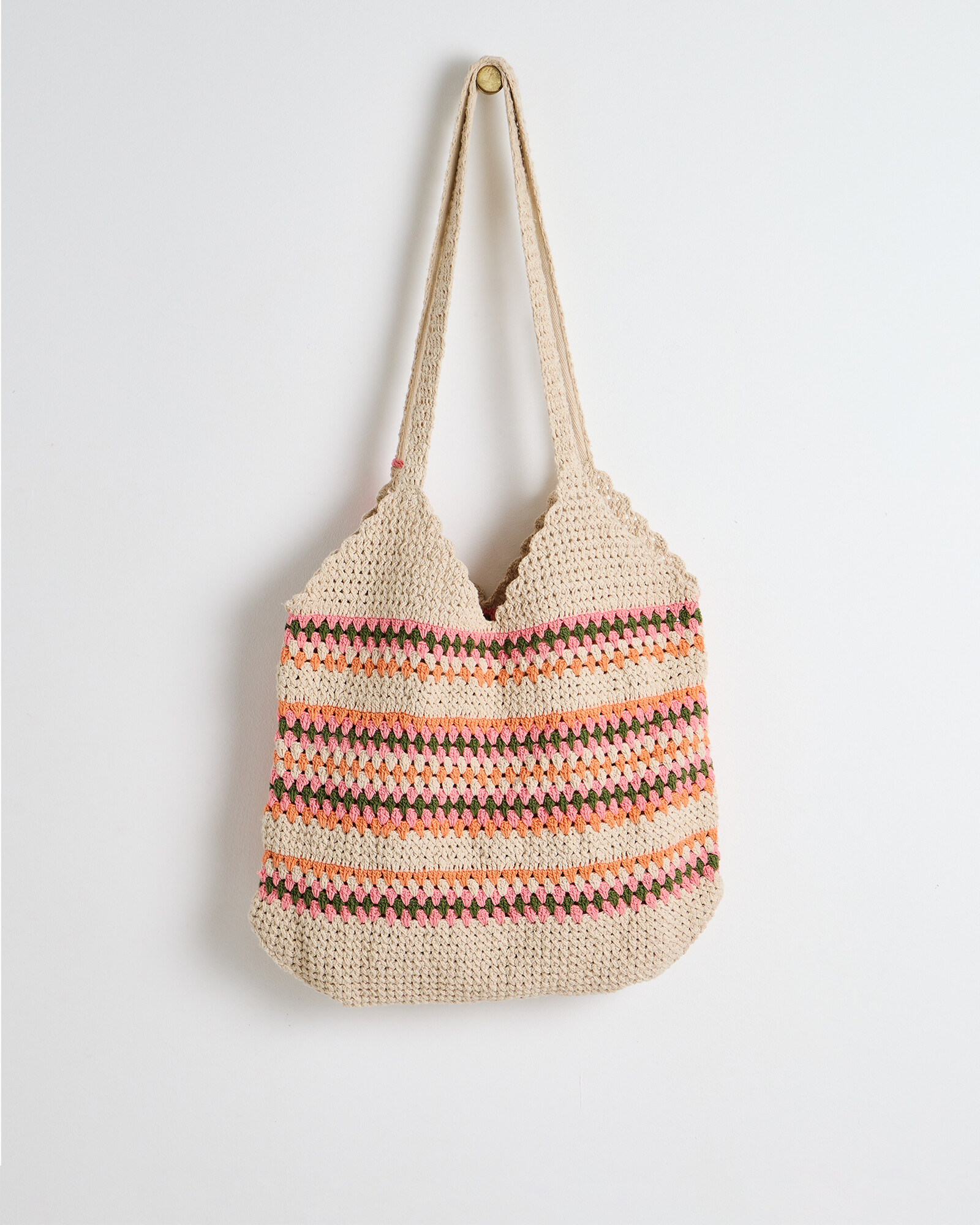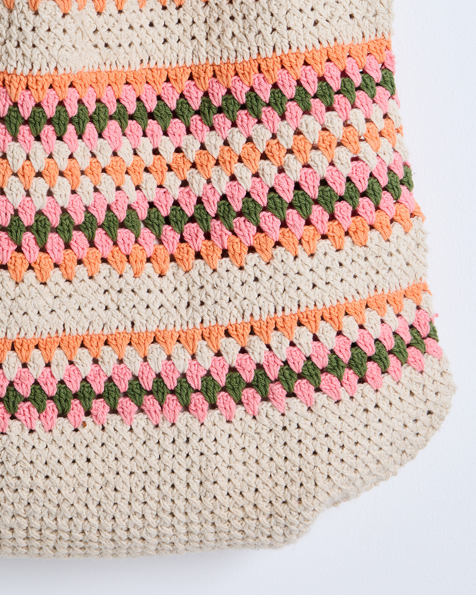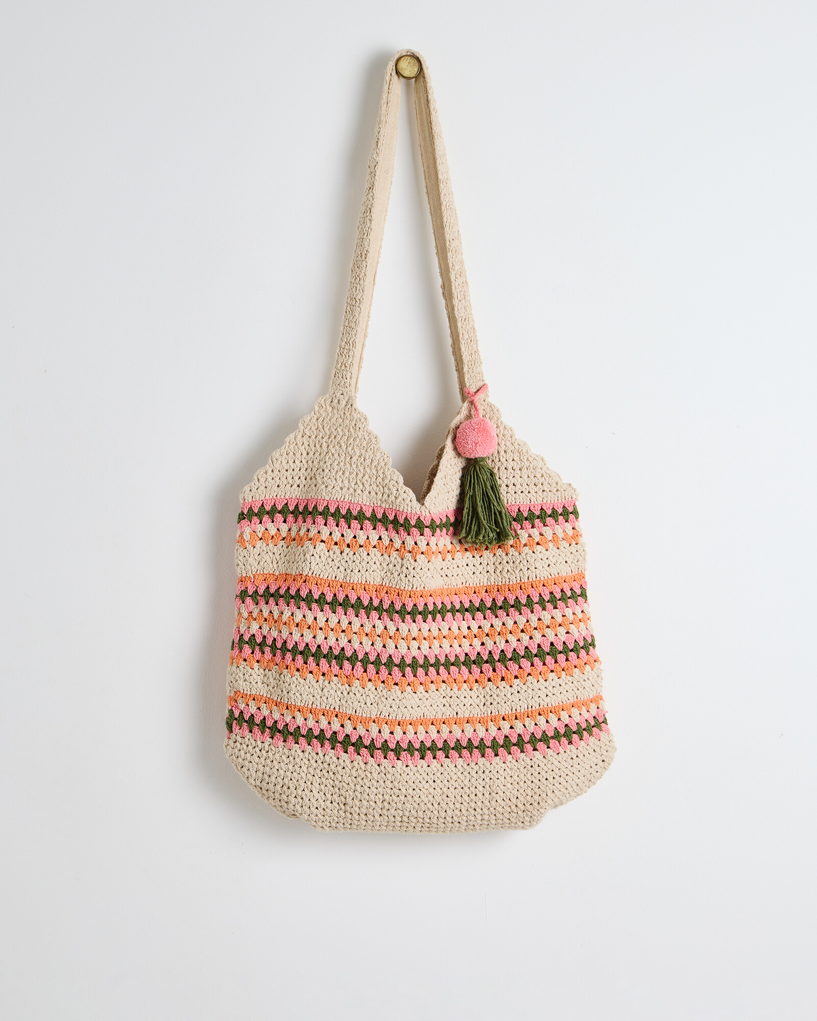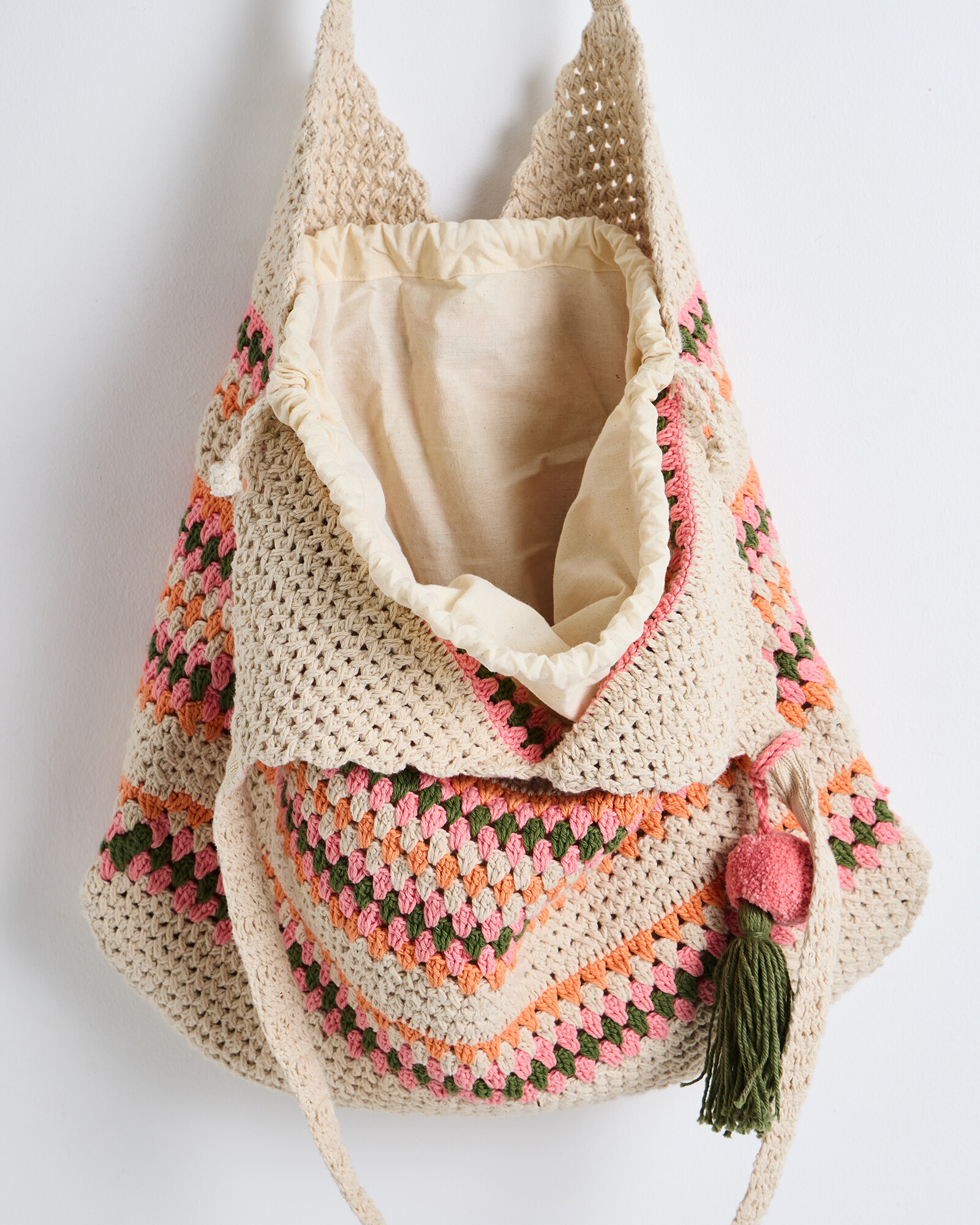 Cotton tote bag crocheted in a pink, orange and green stripe with a tassel detail and drawstring closure.