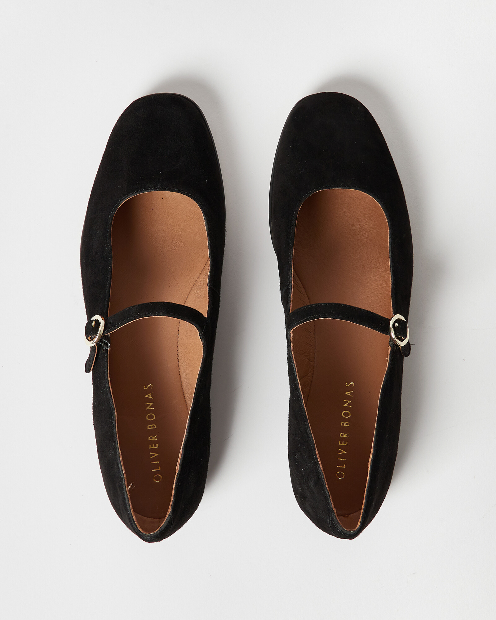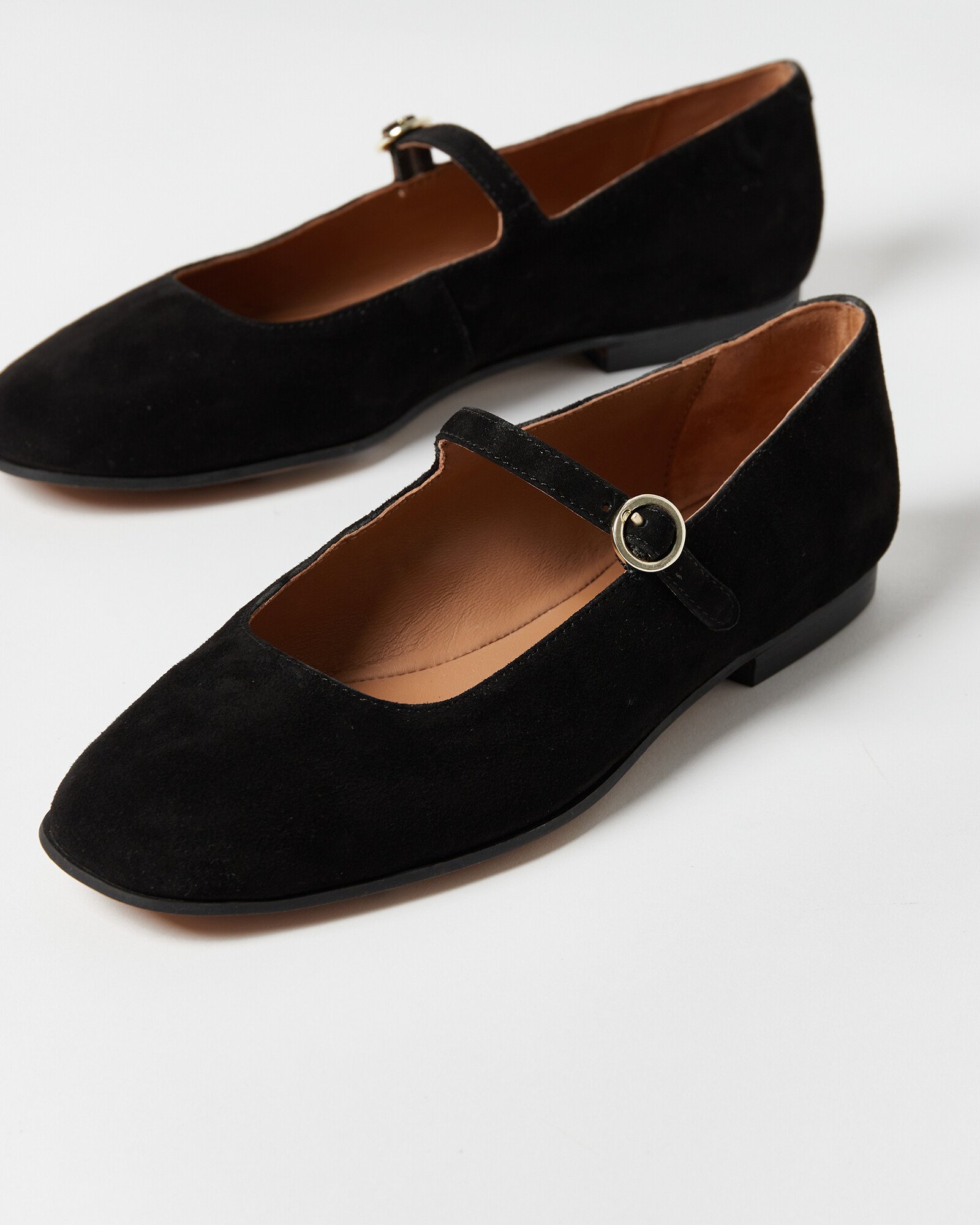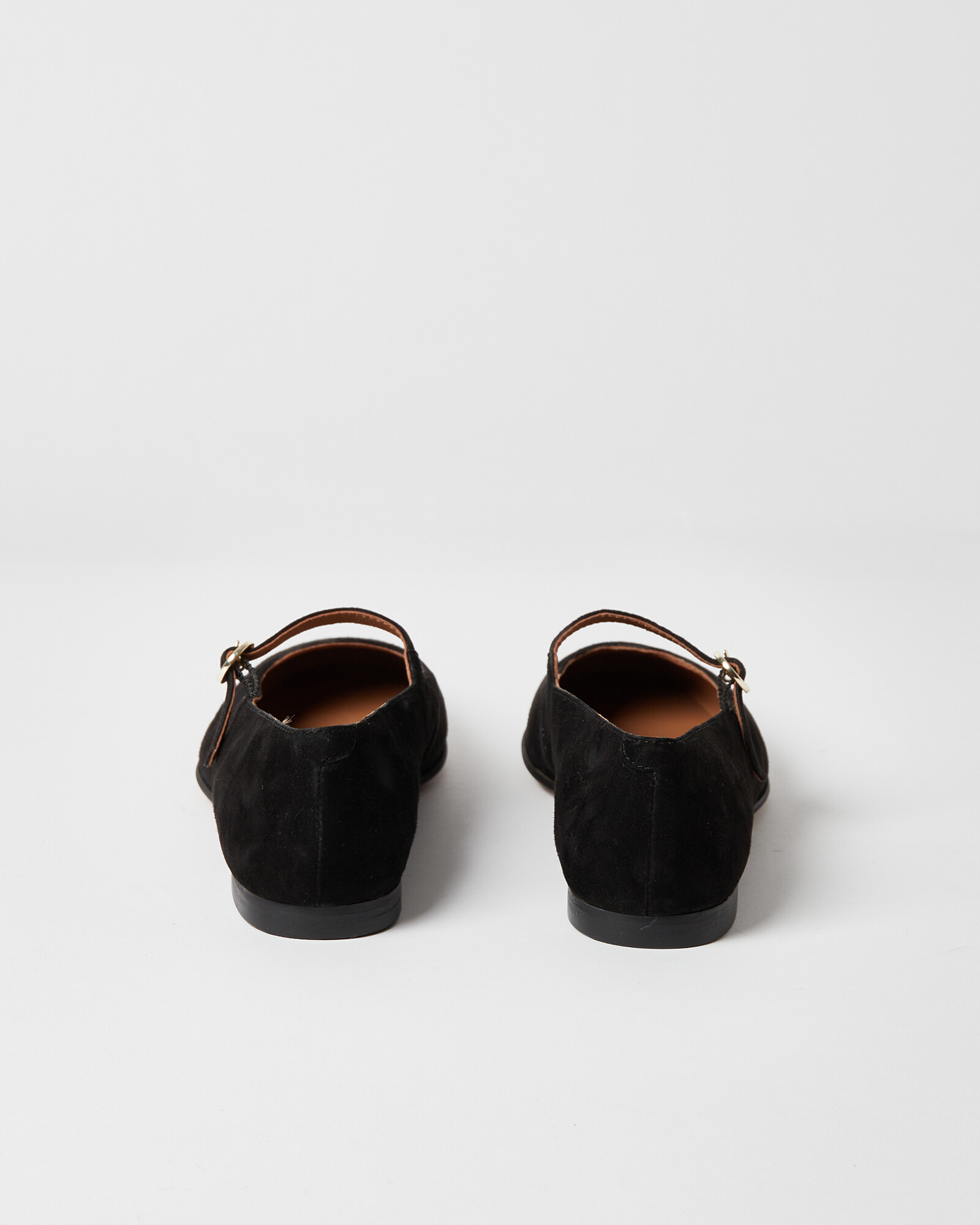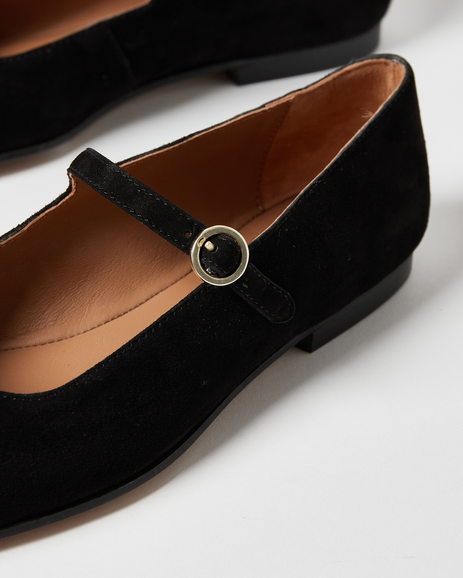In a classic silhouette, these Mary Jane shoes feature a black strap across the ankle with square toes and gold-toned buckle, finished in a black suede leather material.