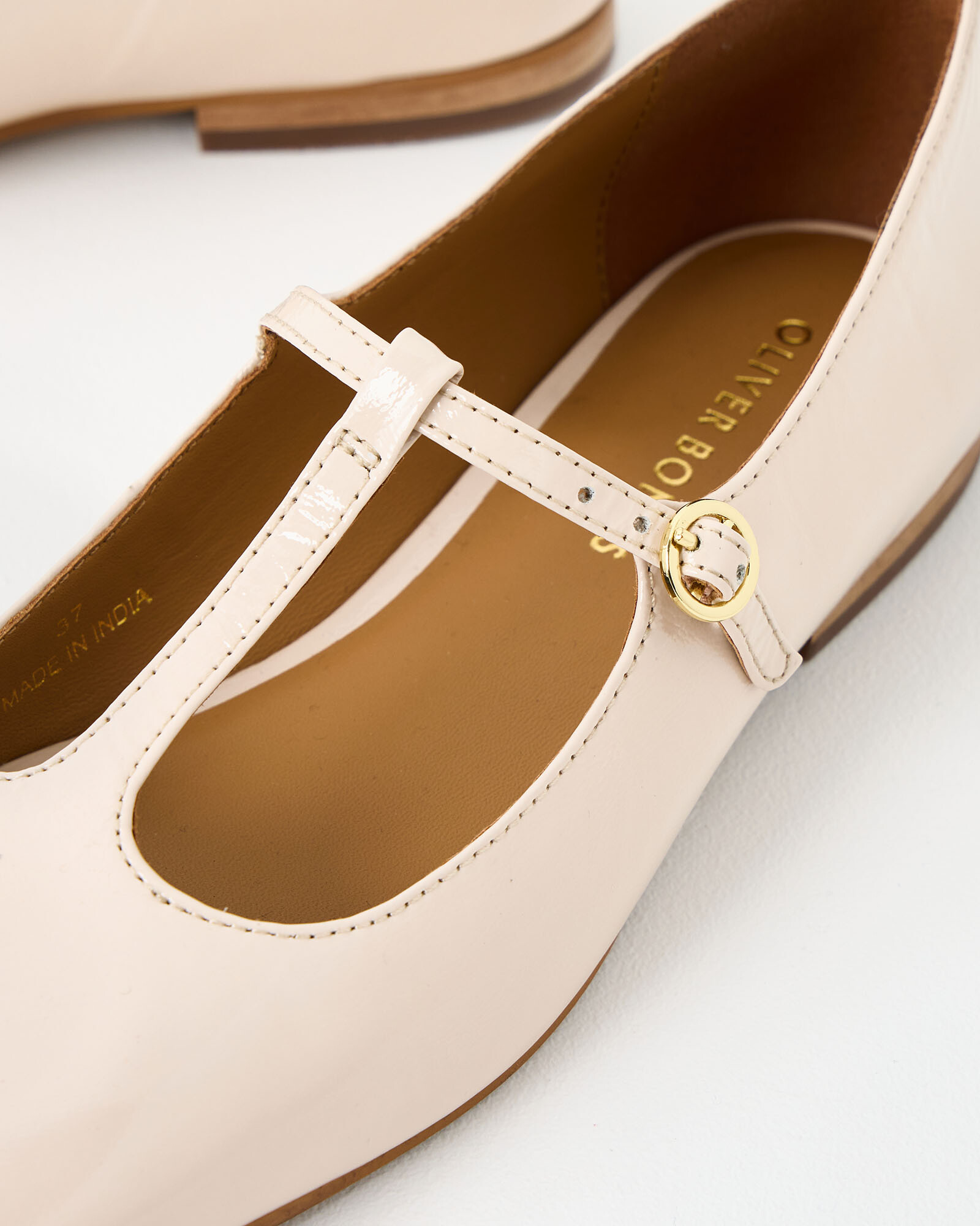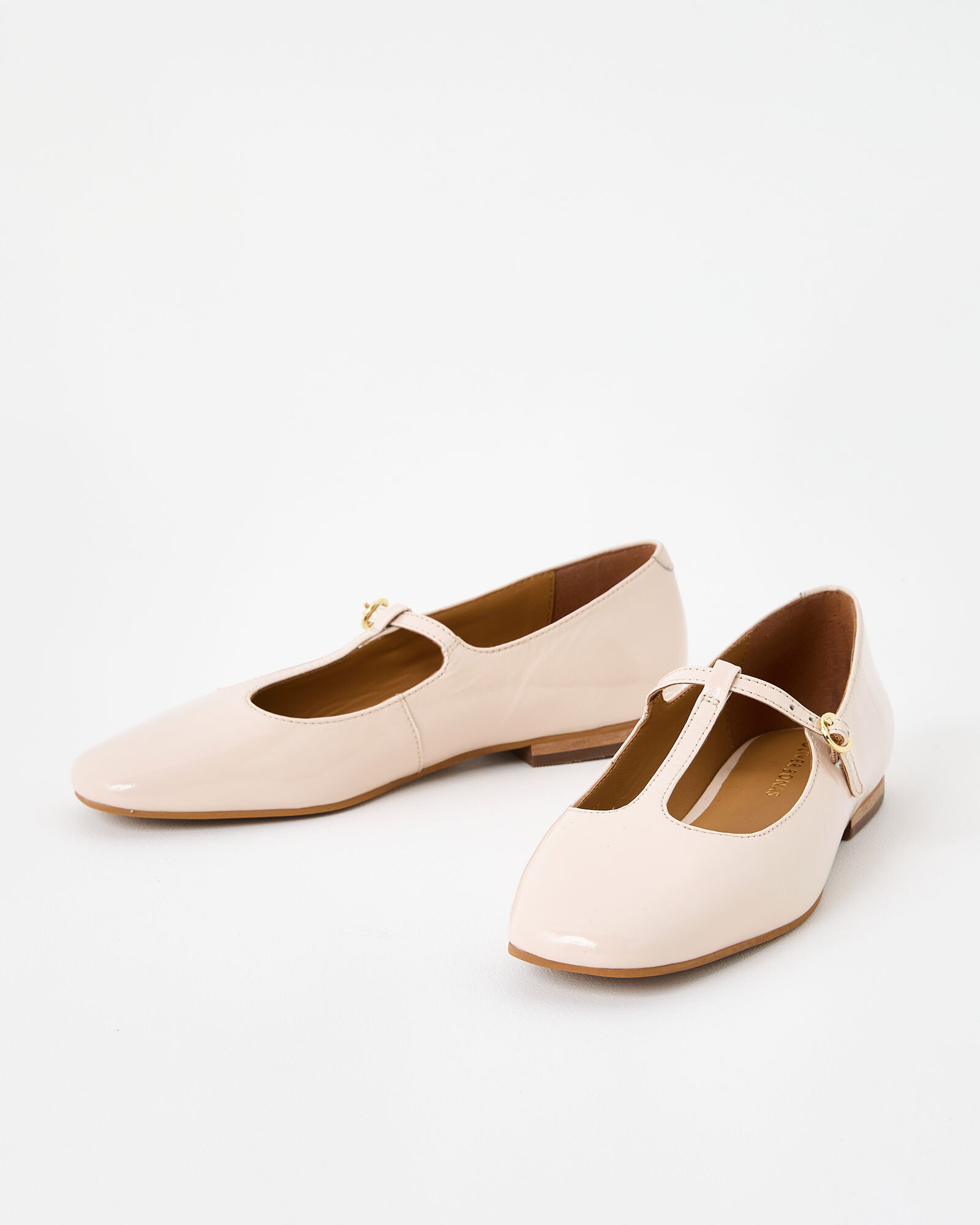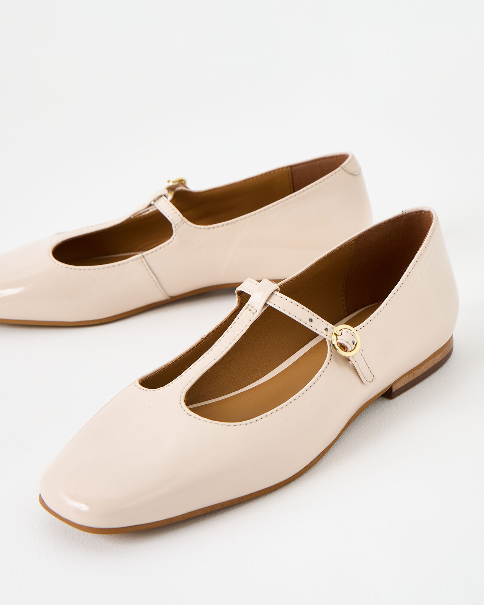 Patent ecru cream leather flats in a classic mary jane shape, with a T-bar strap design and square toes.