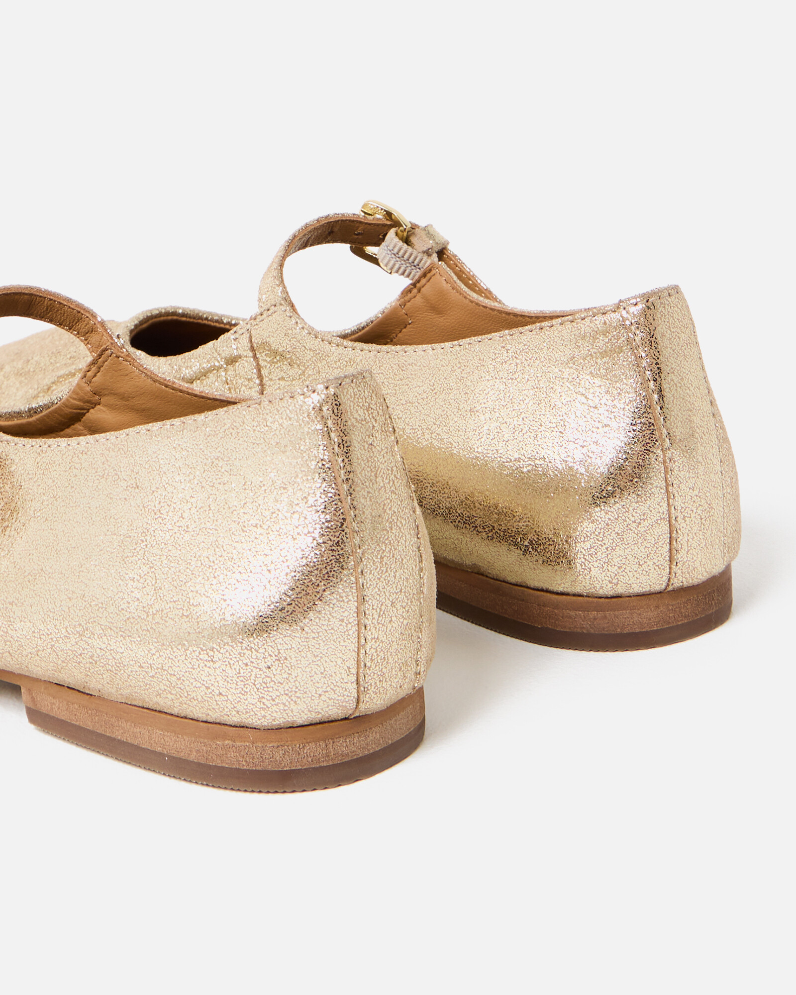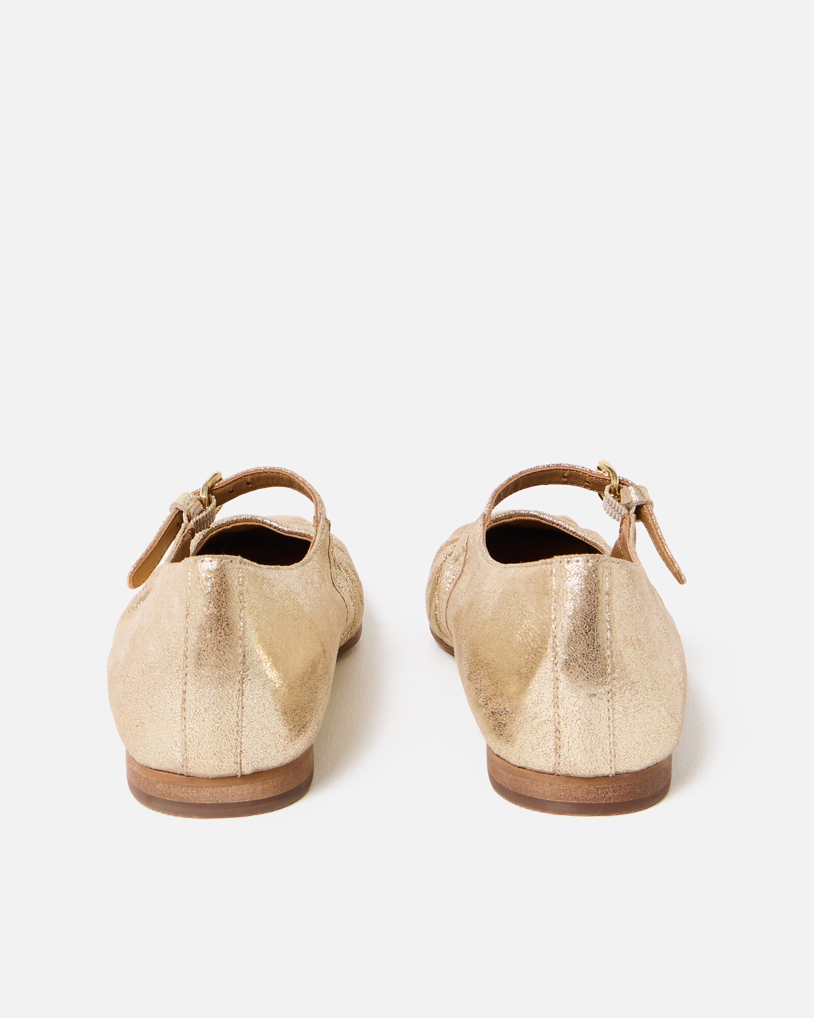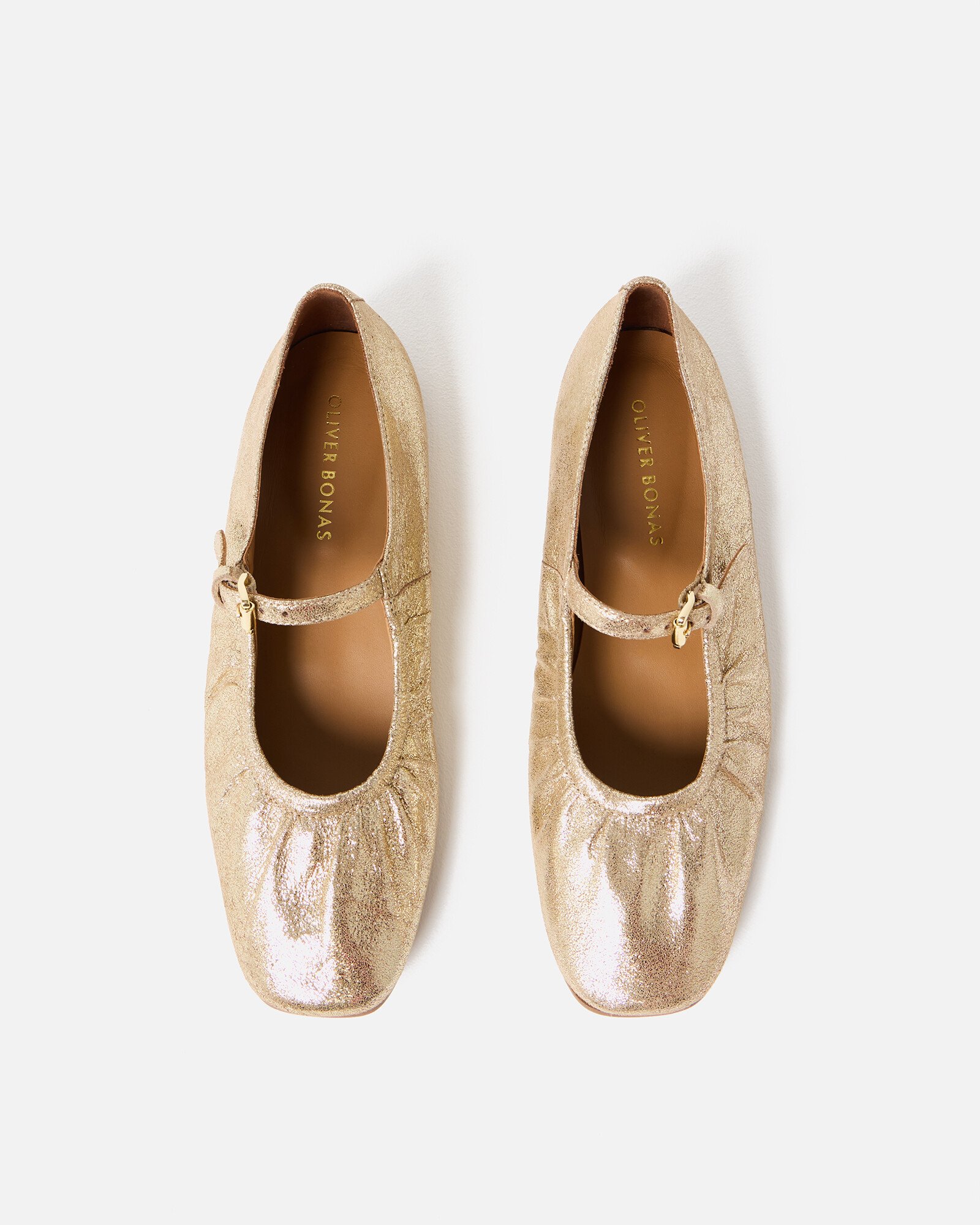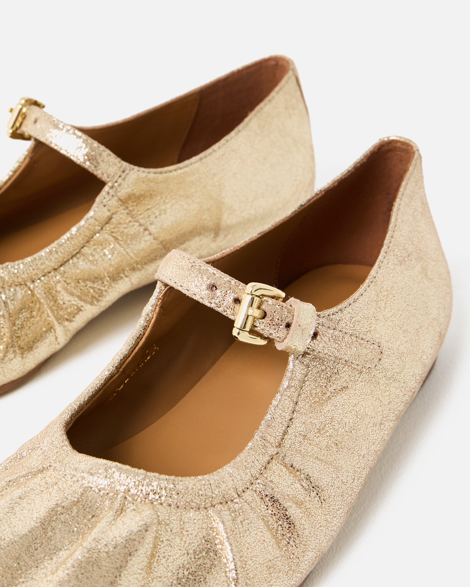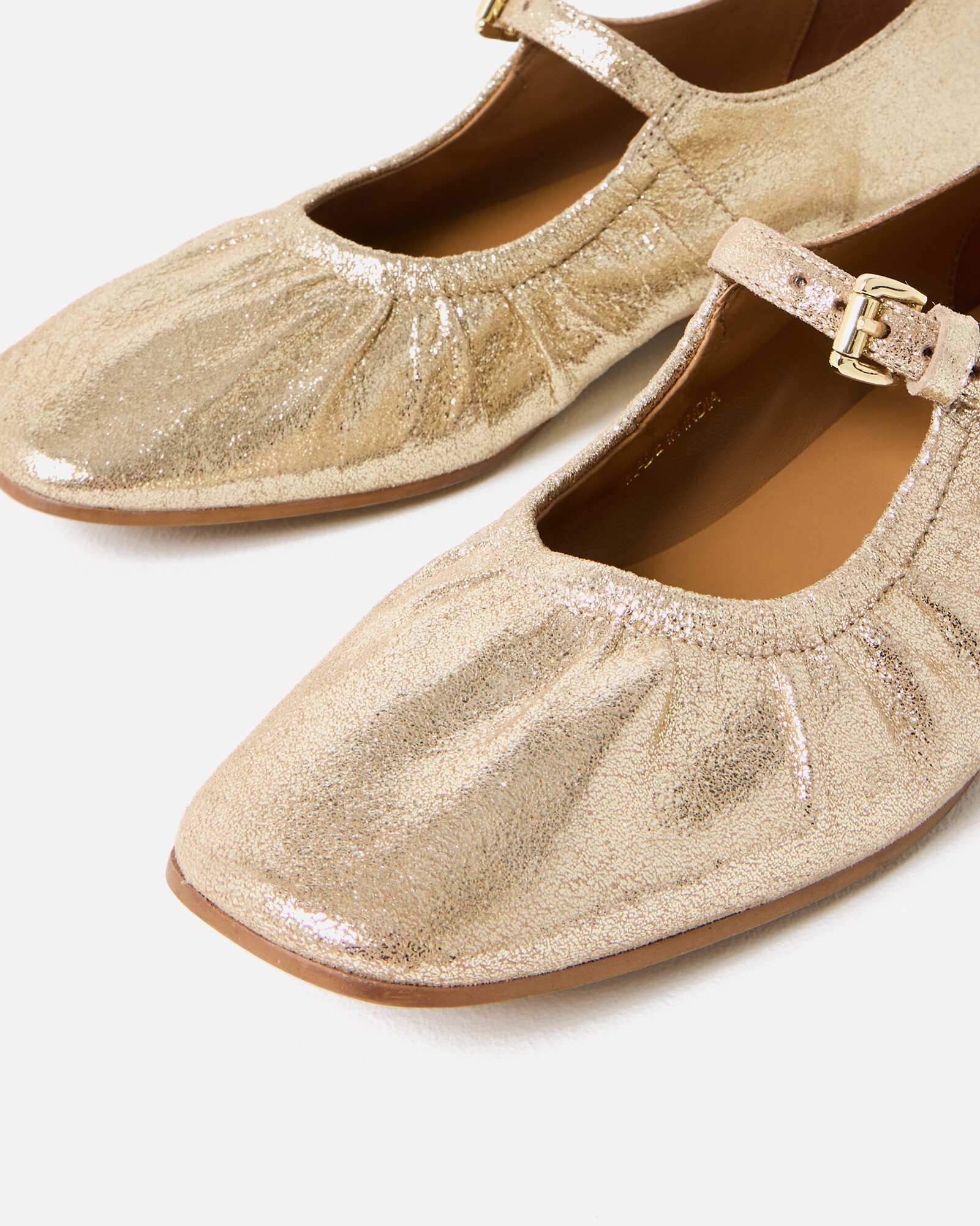 Gold metallic square toe flats in a classic mary jane shape, with a single buckle design and gathered detailing on the front.