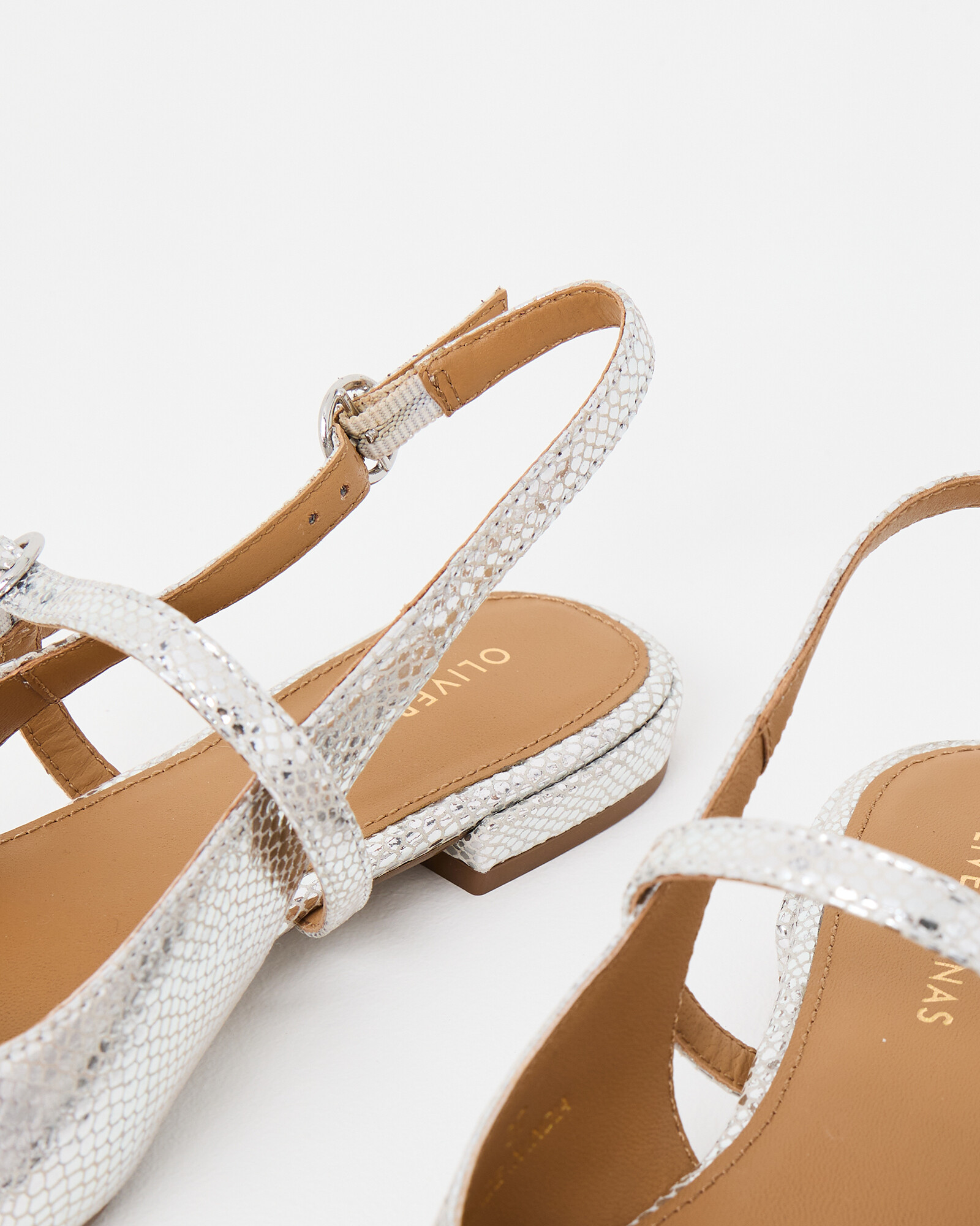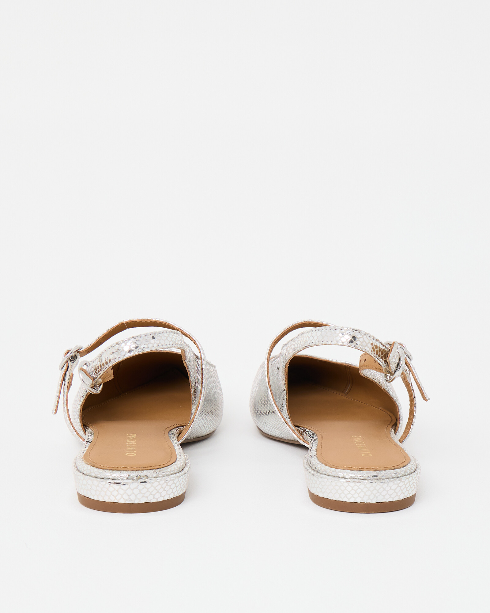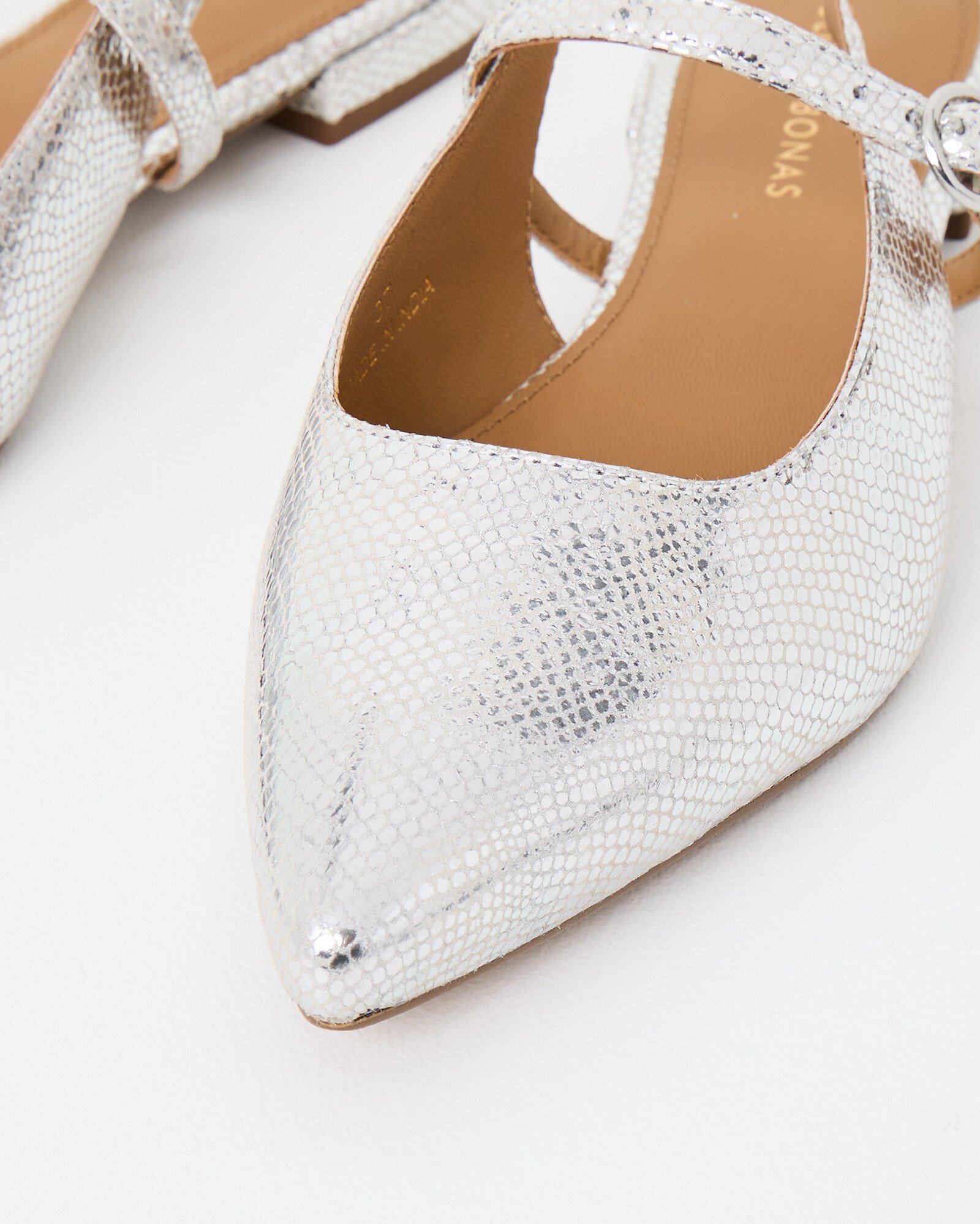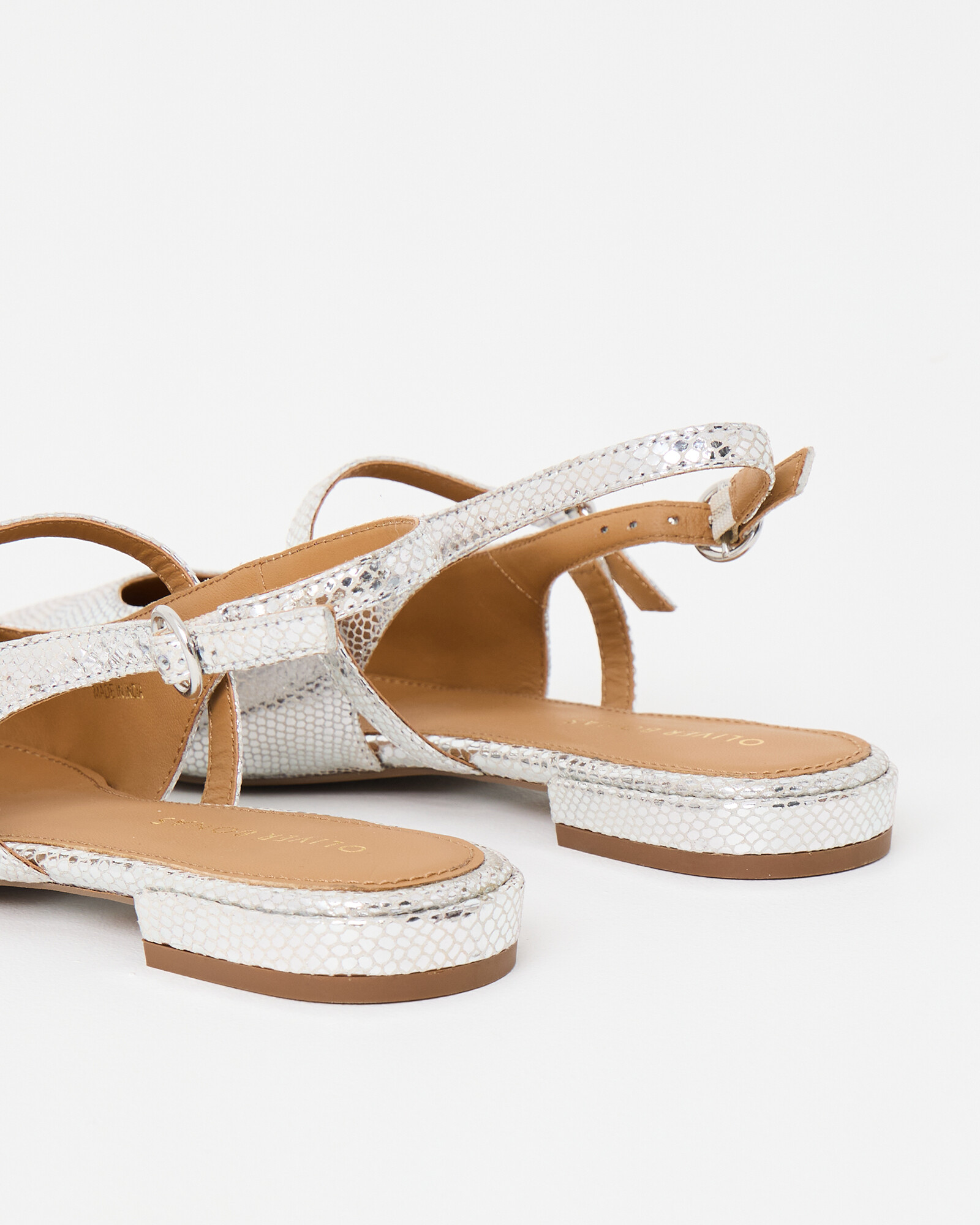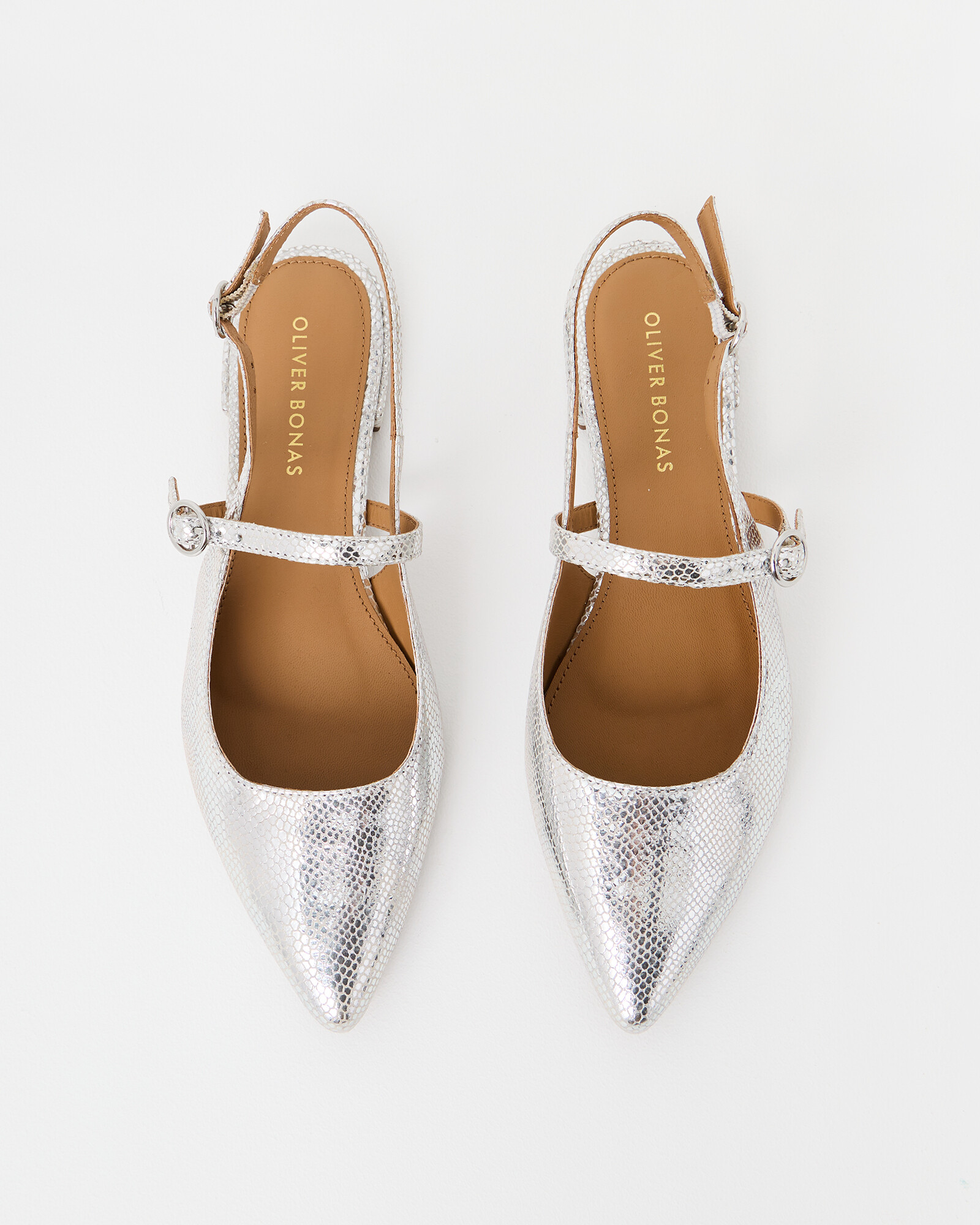 Pointed mary janes with a textured silver finish, small heel and double buckle slingback fastening.