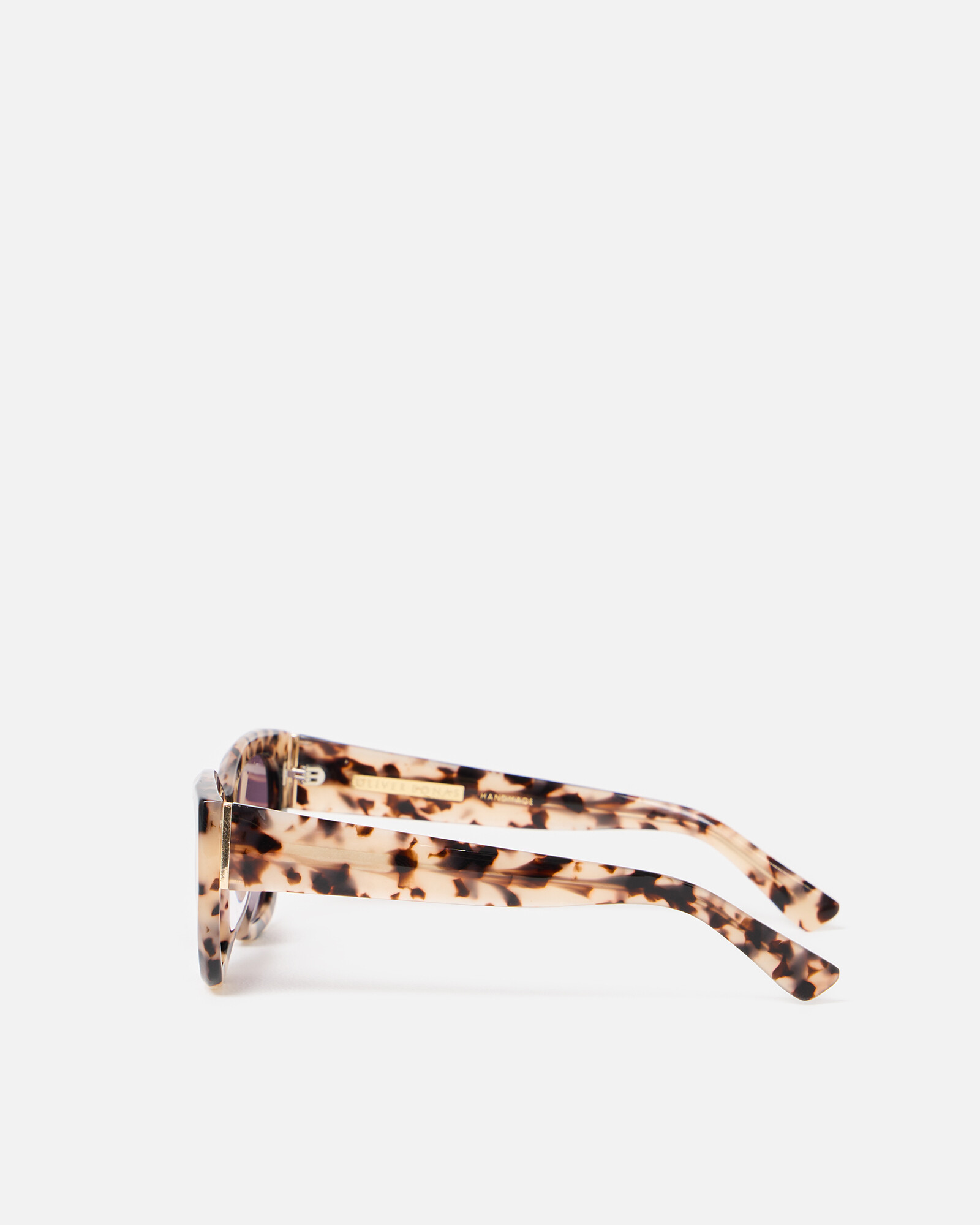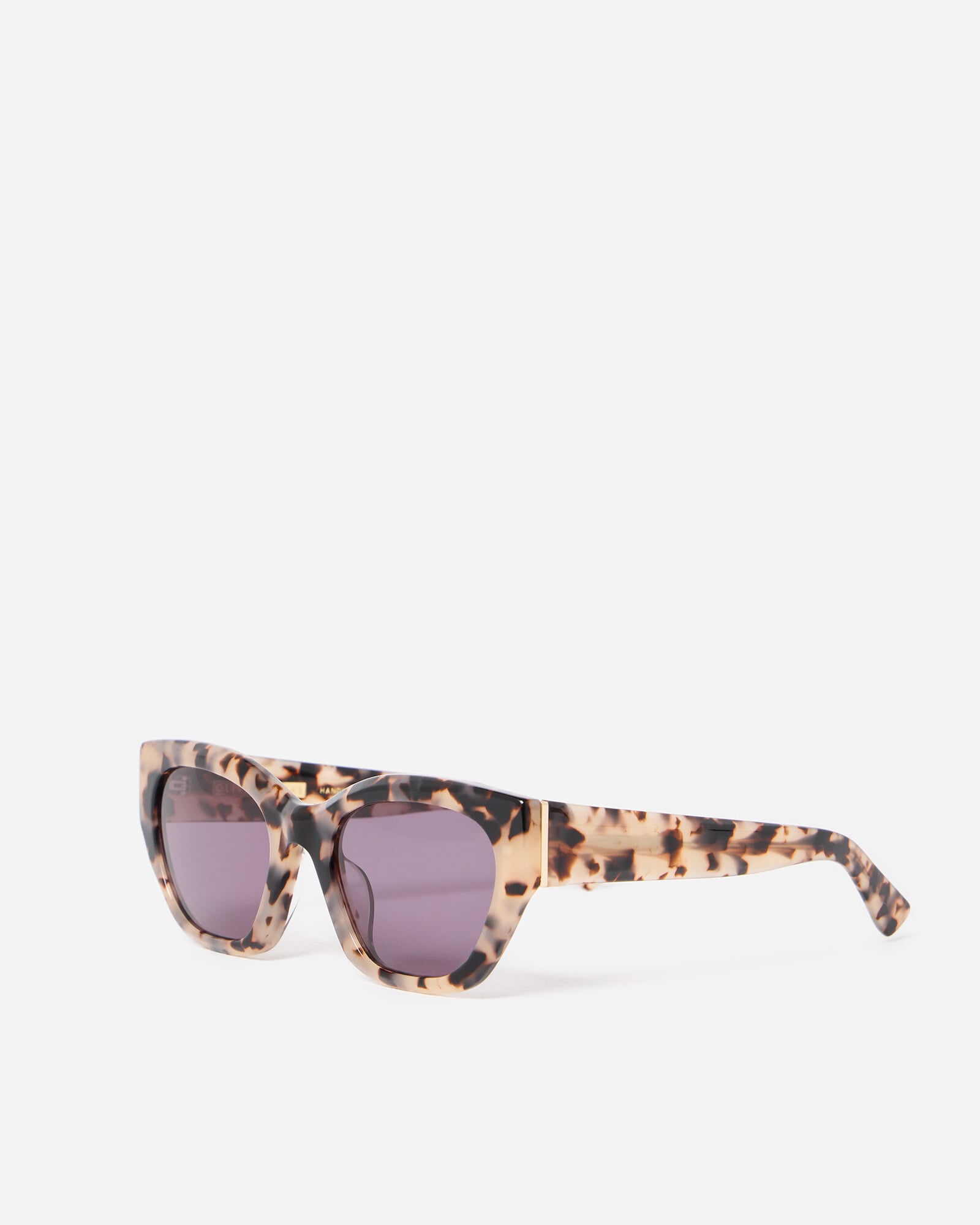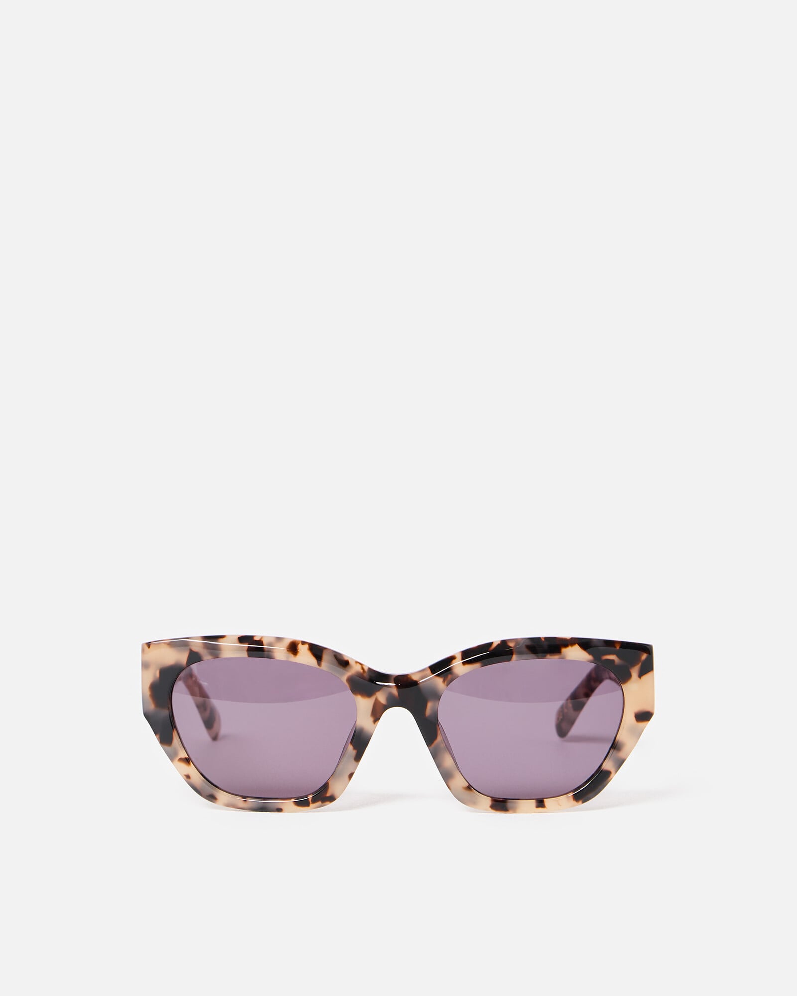 Acetate cat eye sunglasses with purple tinted lenses, an angled milky faux tortoiseshell frame and matching arms.