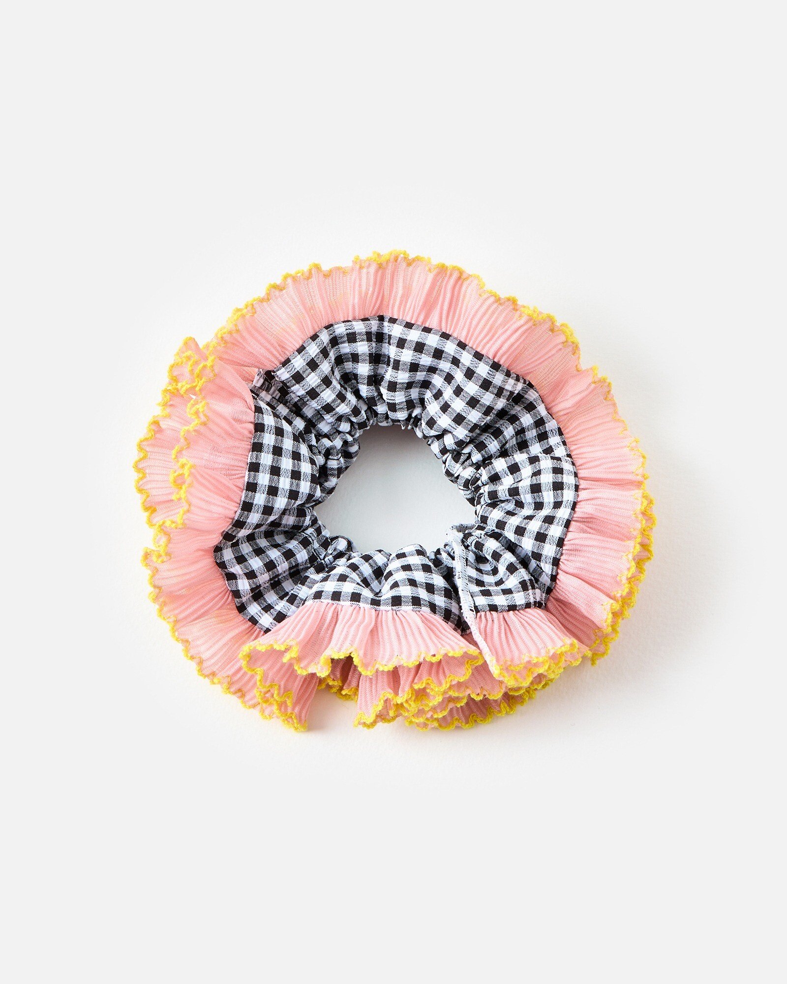 Elevate your everyday bun or ponytail with our oversized scrunchie printed in a black and white gingham pattern, with a pleated light pink frill and embroidered yellow trim.