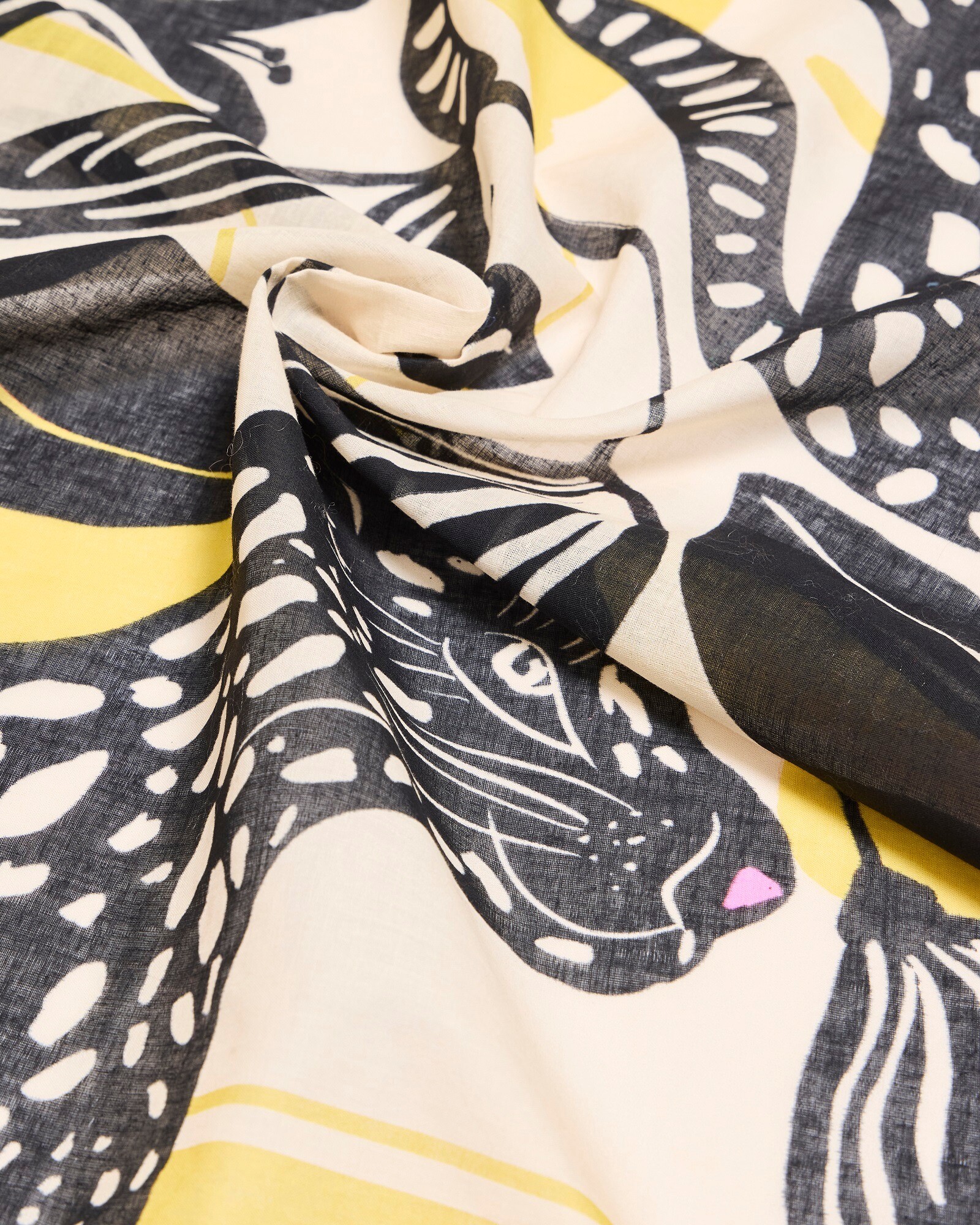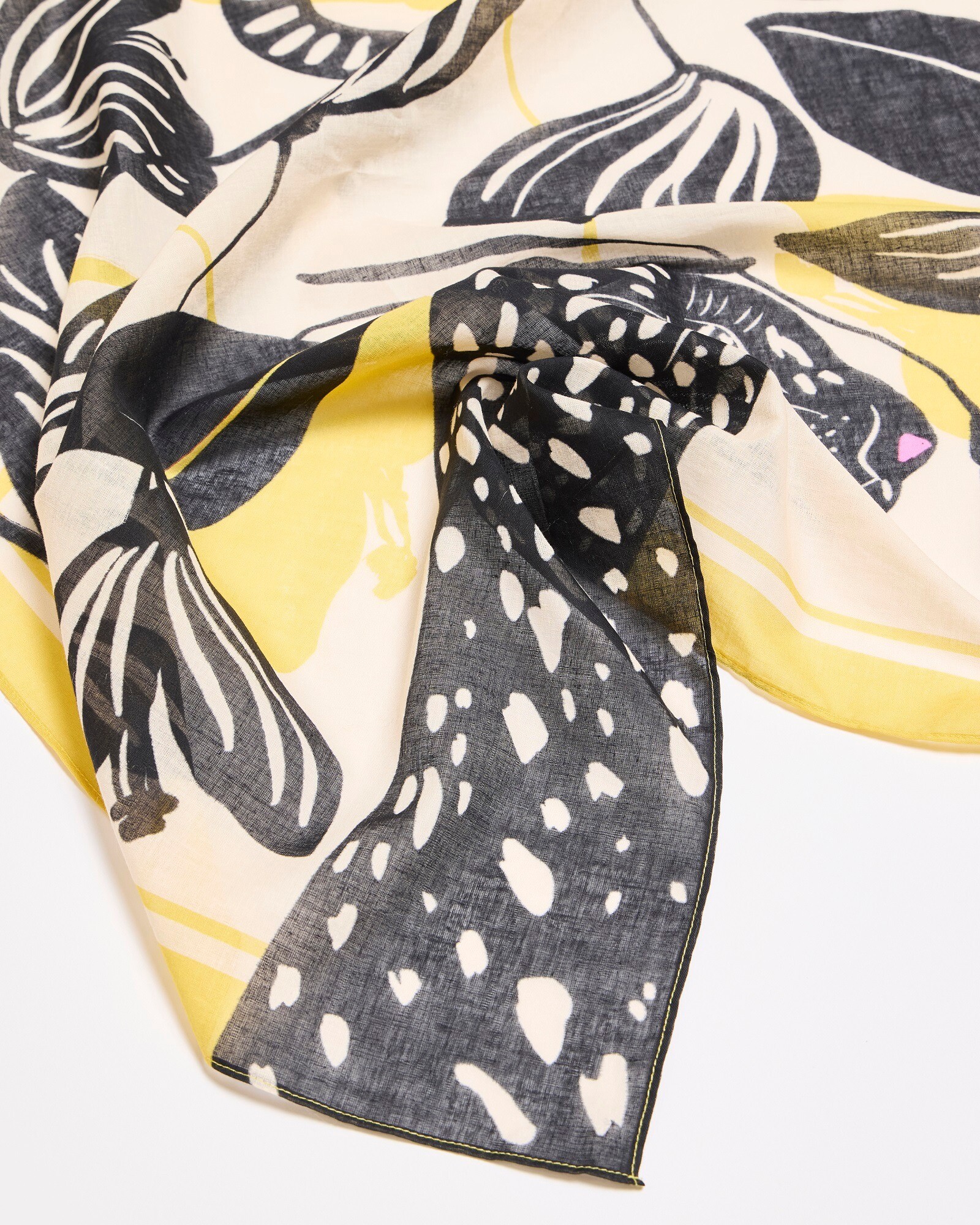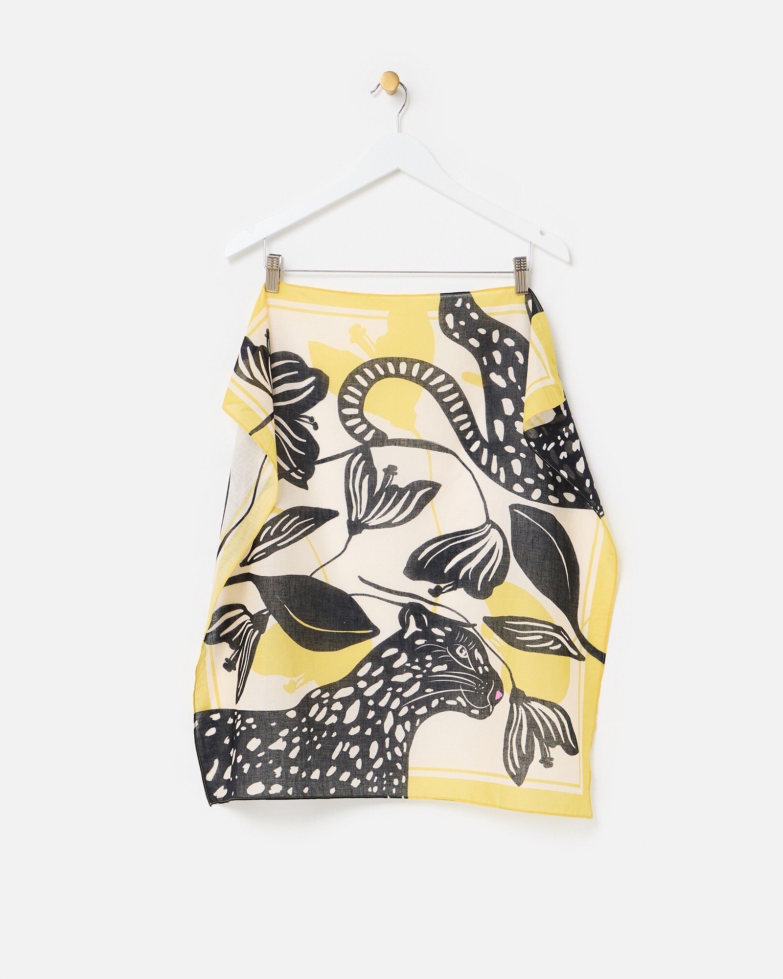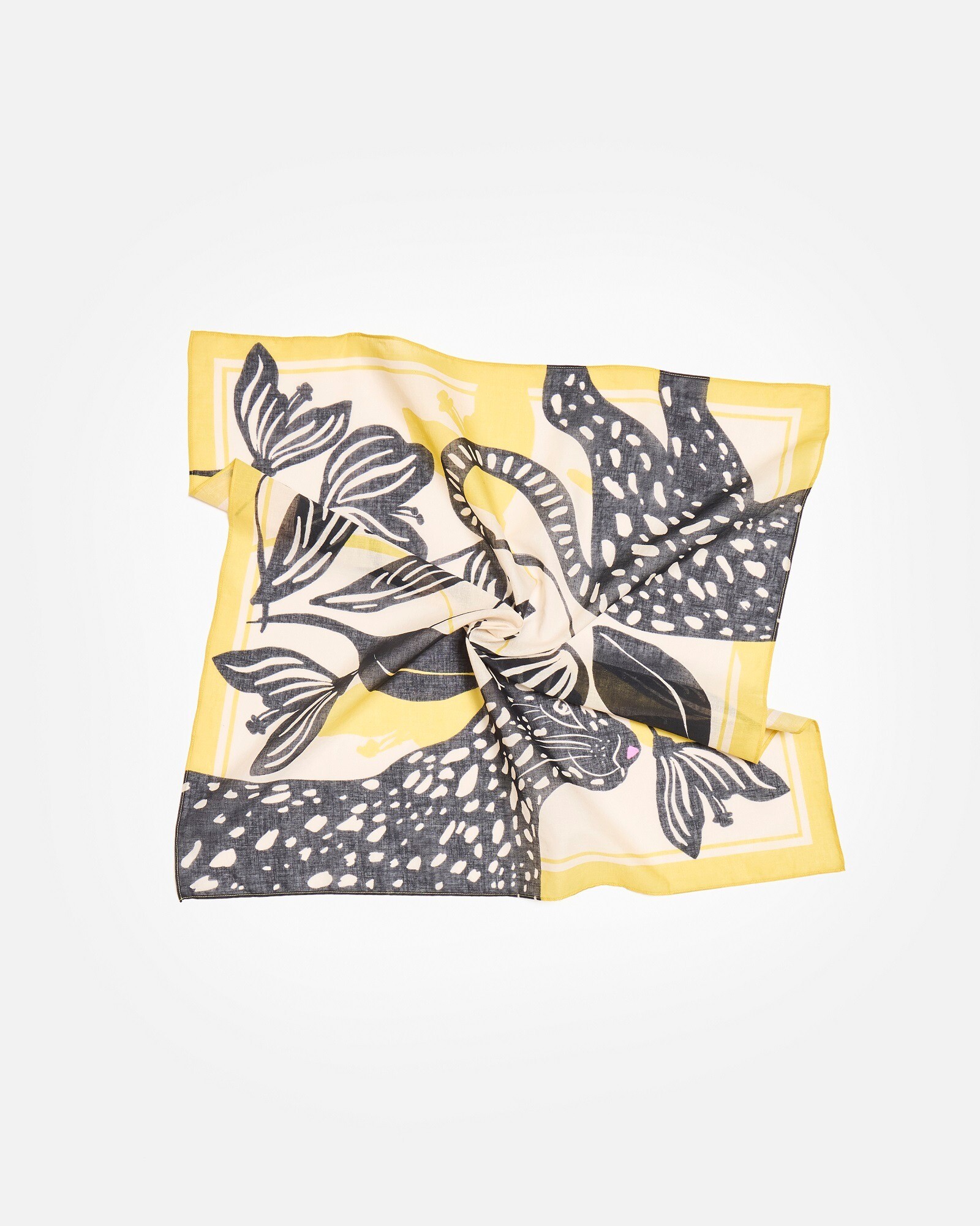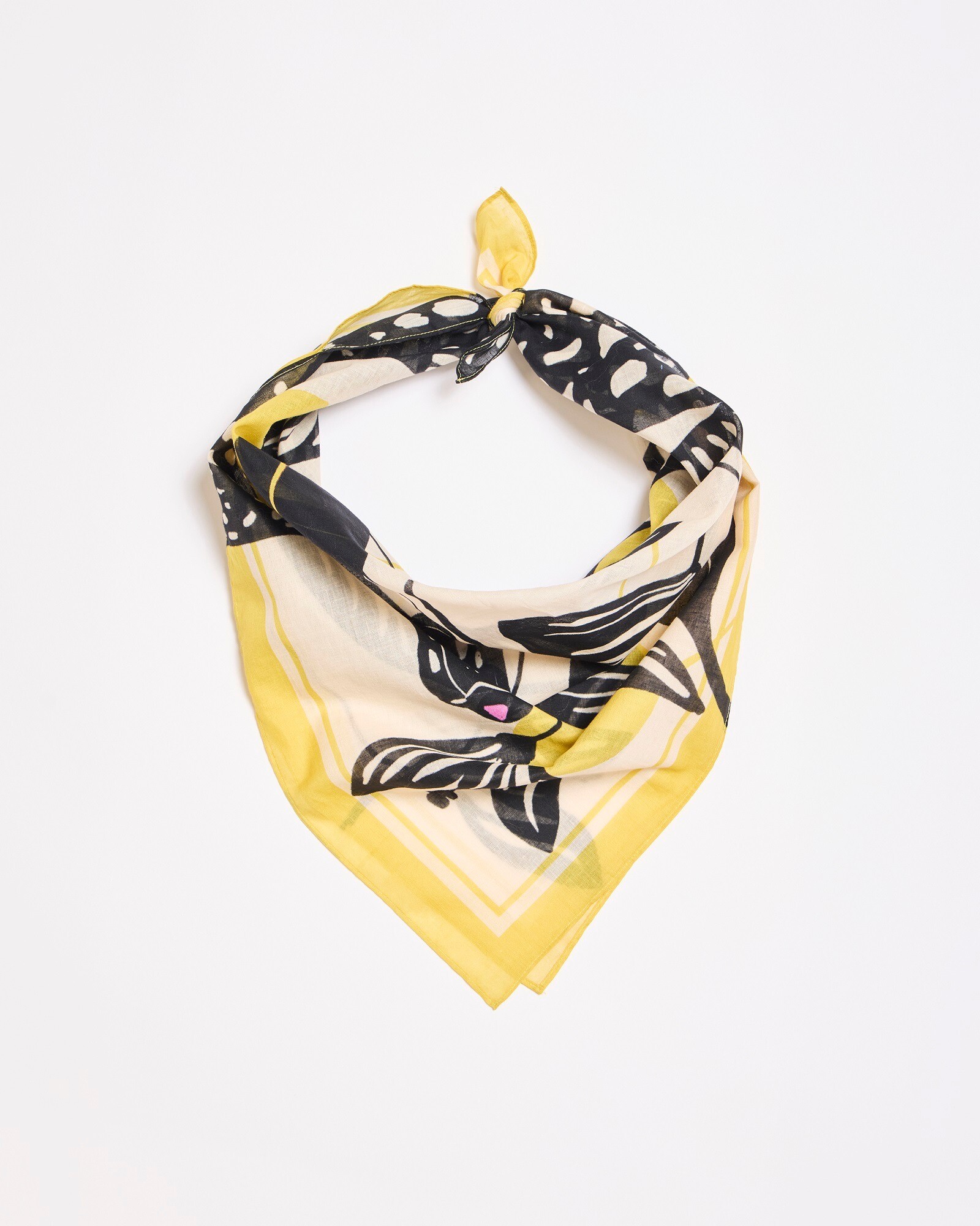 Add our 100% cotton square scarf to your summer capsule wardrobe and be prepared for a feast of accessorising opportunities. Printed with a bold monochrome and bright yellow cat motif and floral pattern designed in the OB creative studios, tie it on your belt loops, wear it as a headband or bag accessory or go full Francaise and fashion it as a neckerchief (ooh la la...). Framed with a yellow striped border, the soft, lightweight feel makes it a go-to for warm days and breezy evenings alike.