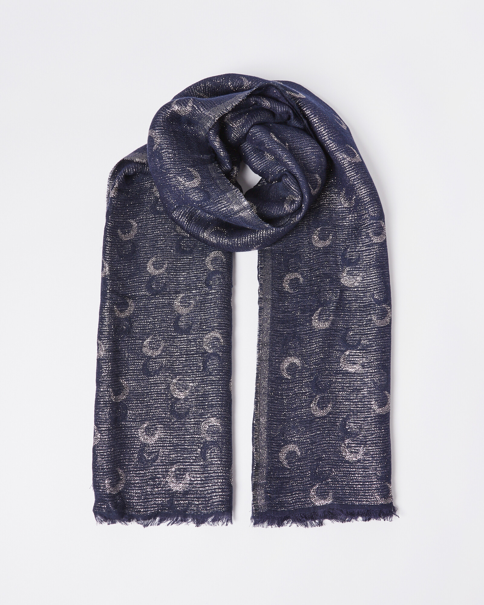 Decorated with an all-over crescent moon jacquard pattern in metallic gunmetal tones, this navy blue scarf lends a shimmering touch to your outfit.