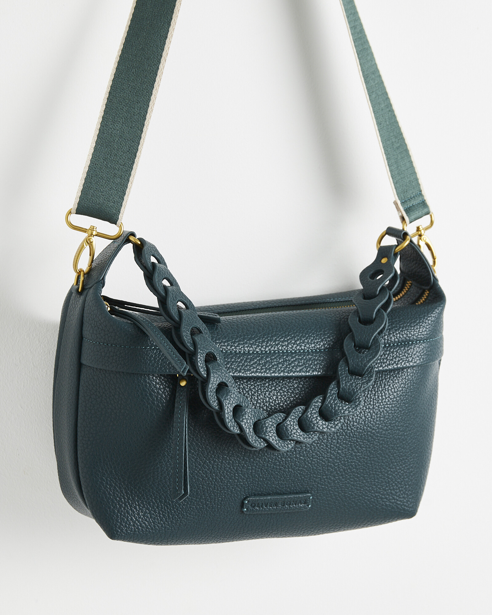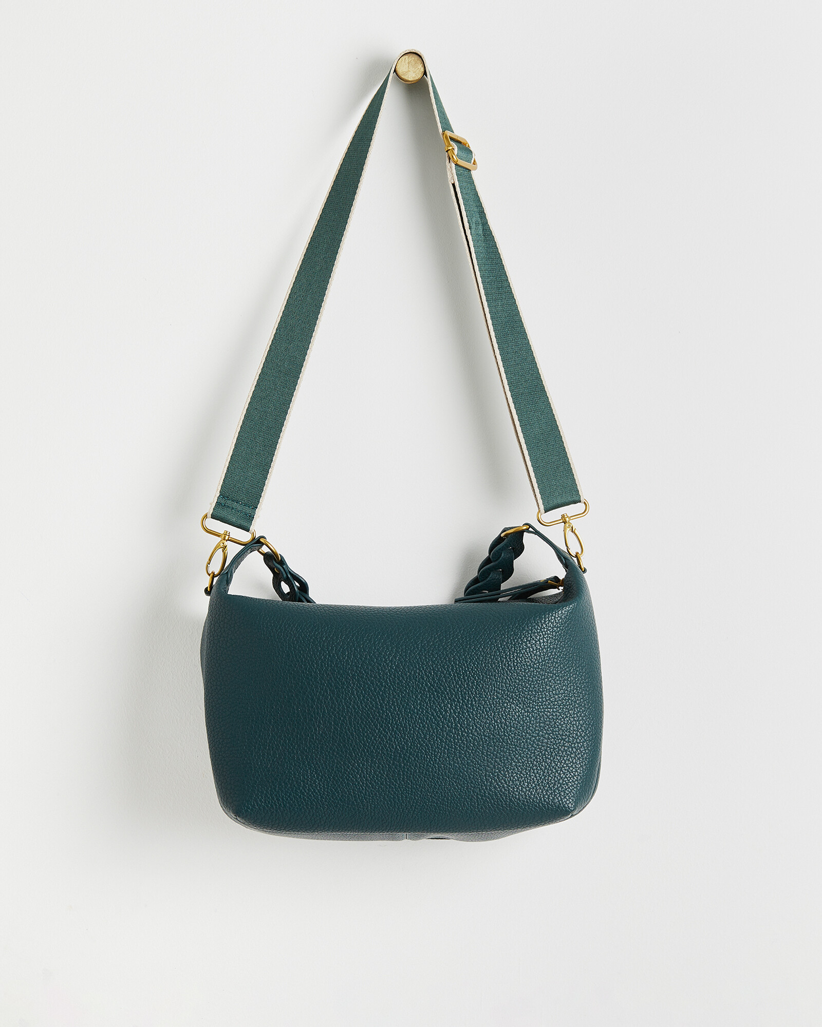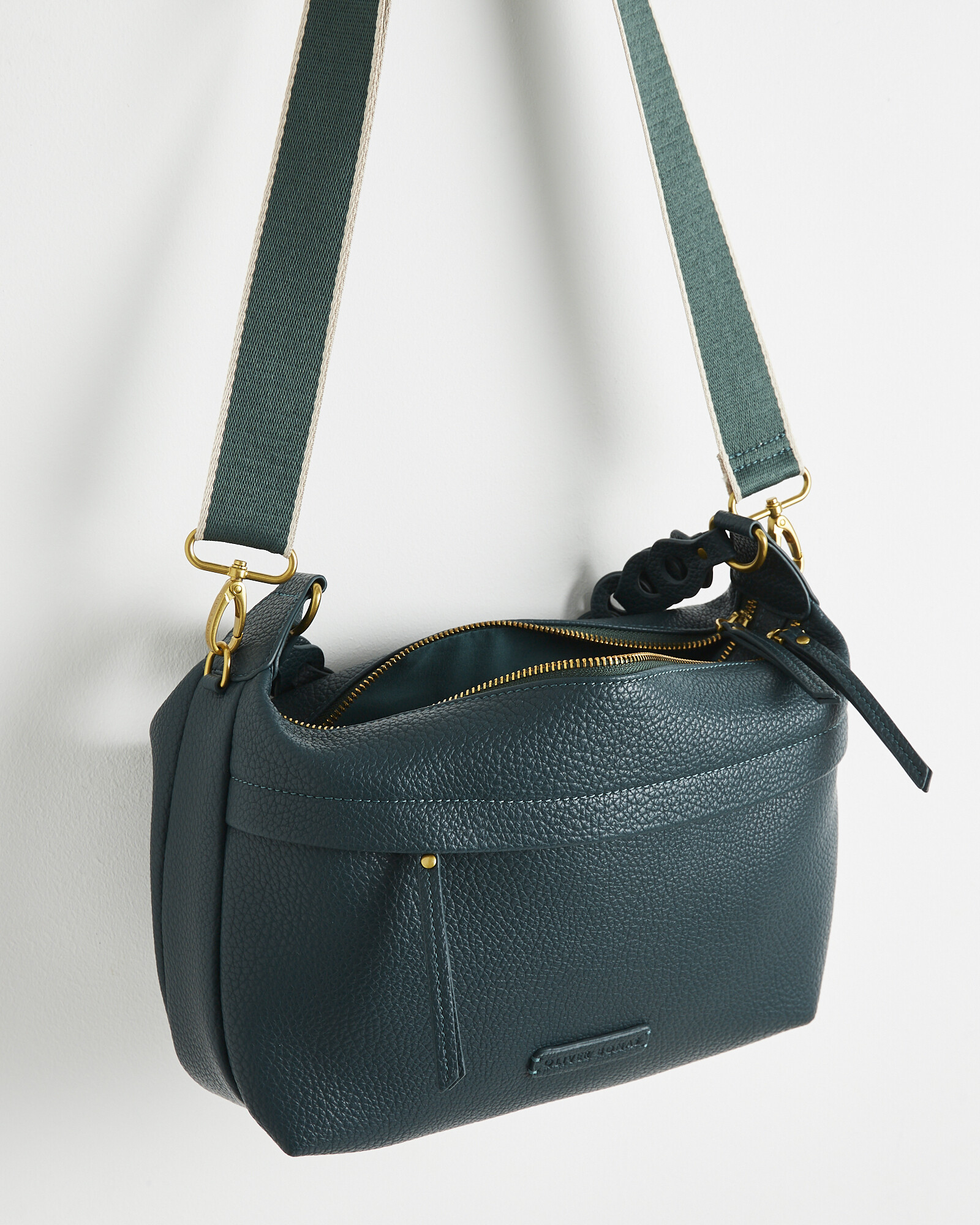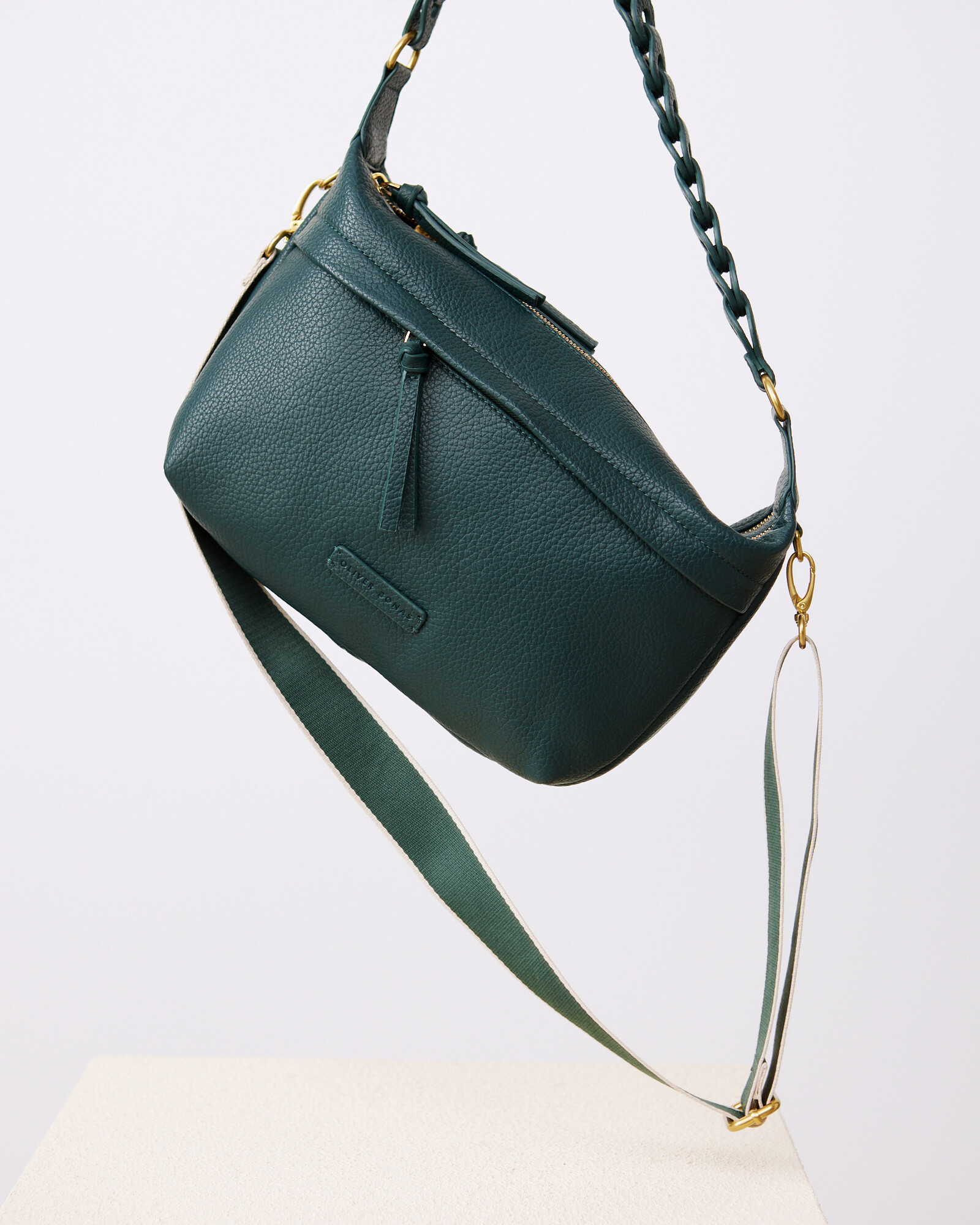 Crossbody or tote, our Murphy bag has got you covered. With a long, detachable strap and a linked shoulder handle, it has a slouch profile with zipped pockets in a teal green tone.