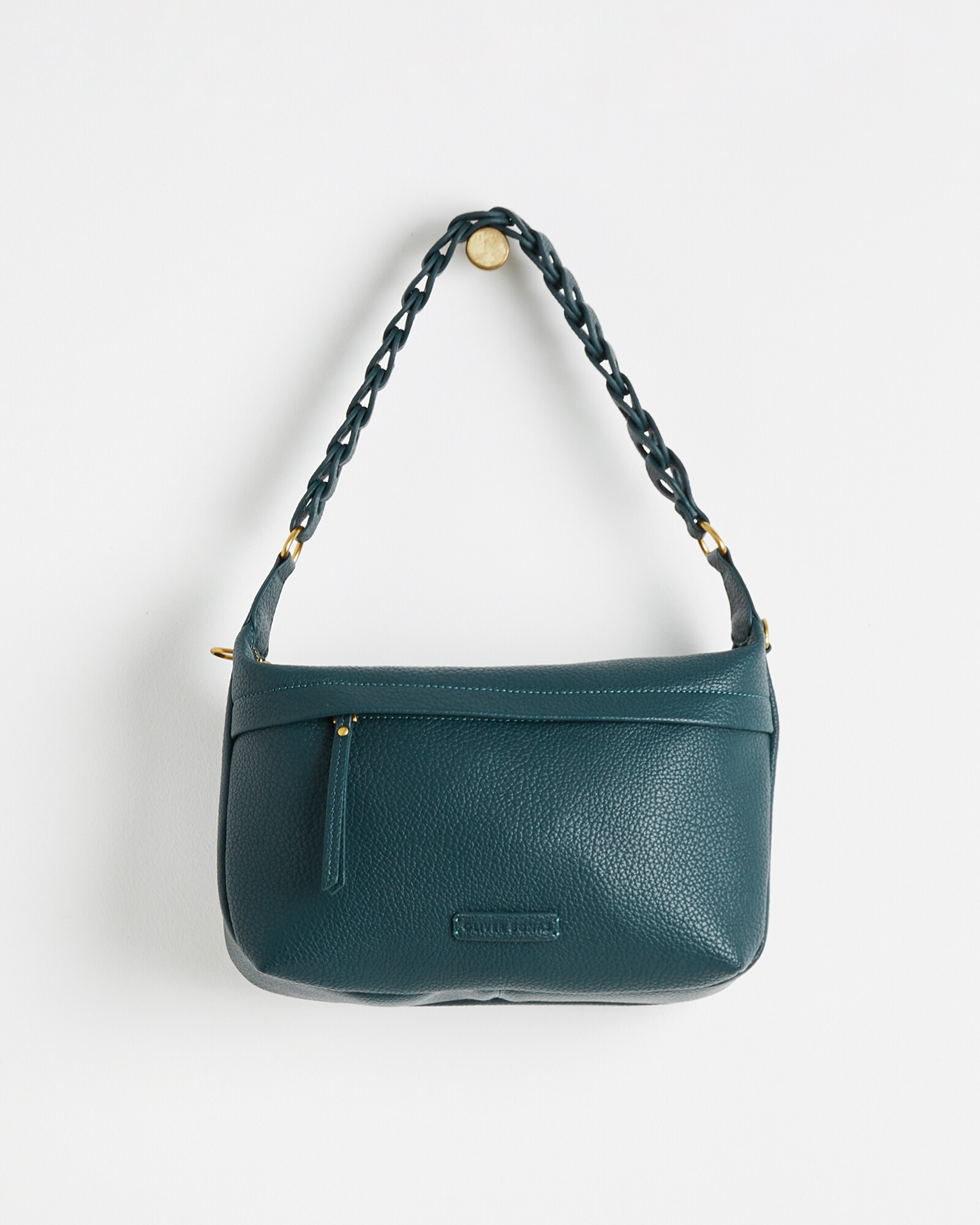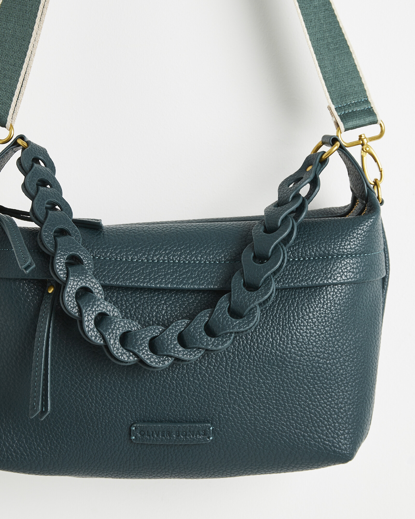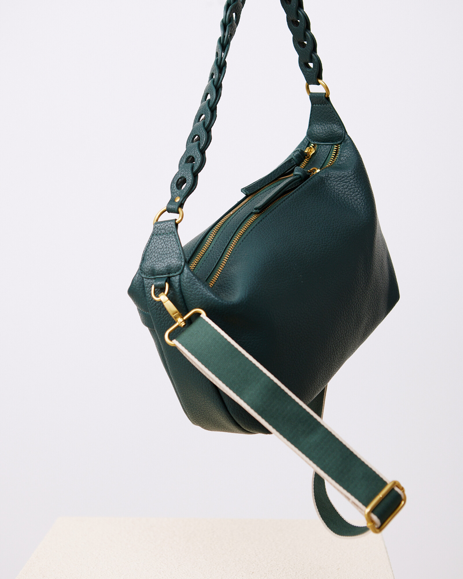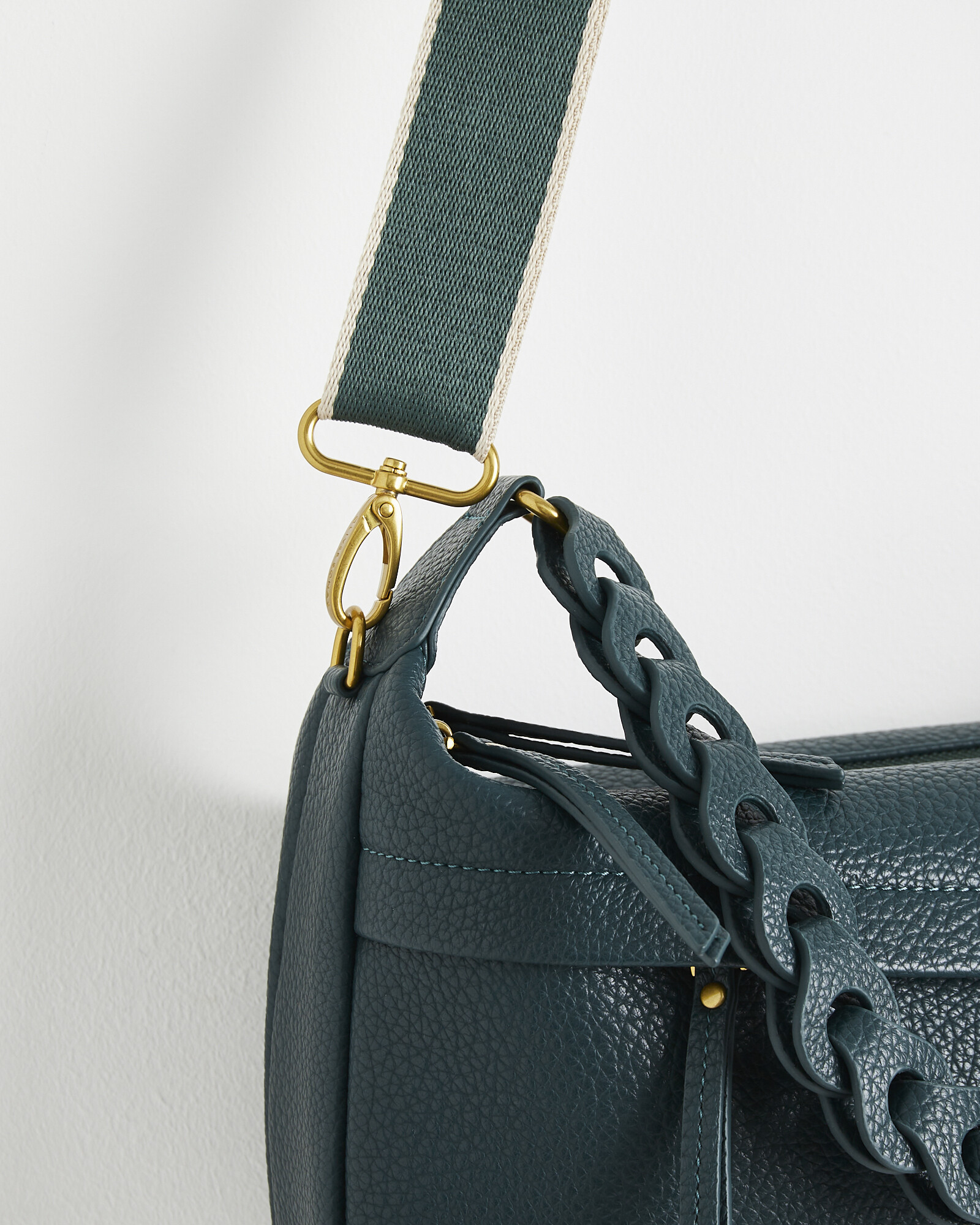 Crossbody or tote, our Murphy bag has got you covered. With a long, detachable strap and a linked shoulder handle, it has a slouch profile with zipped pockets in a teal green tone.