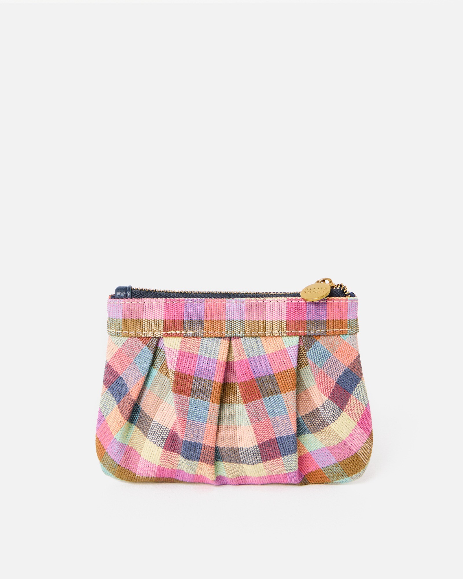 Keep your essentials stylishly secure this summer with our multicoloured zipped pouch. Woven in a colourful checked pattern in bright tones of pink, orange, yellow and blue, it comes in a rounded rectangular shape with ruched detail. Finished with a black lining, gold tone zip and Oliver Bonas logo charm, it's ready to store your lippy, hair grips, cash, keys...