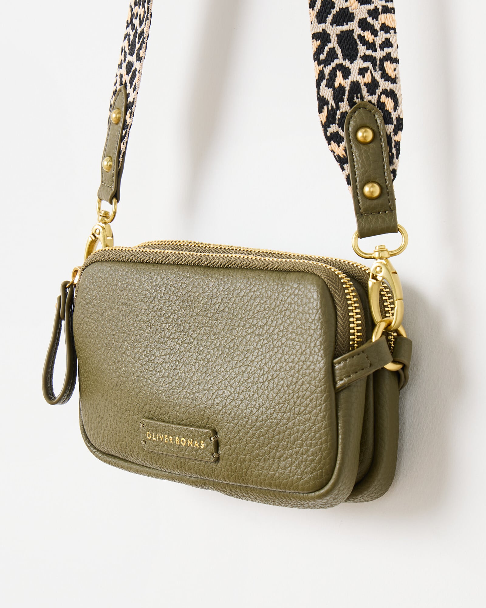 Khaki green crossbody bag with two zipped pockets, leopard print woven strap and a rectangular shape. Switch to the matching slim strap or remove and use as a clutch. A compact yet functional bag, perfect for storing your mobile phone and other essentials securely.
