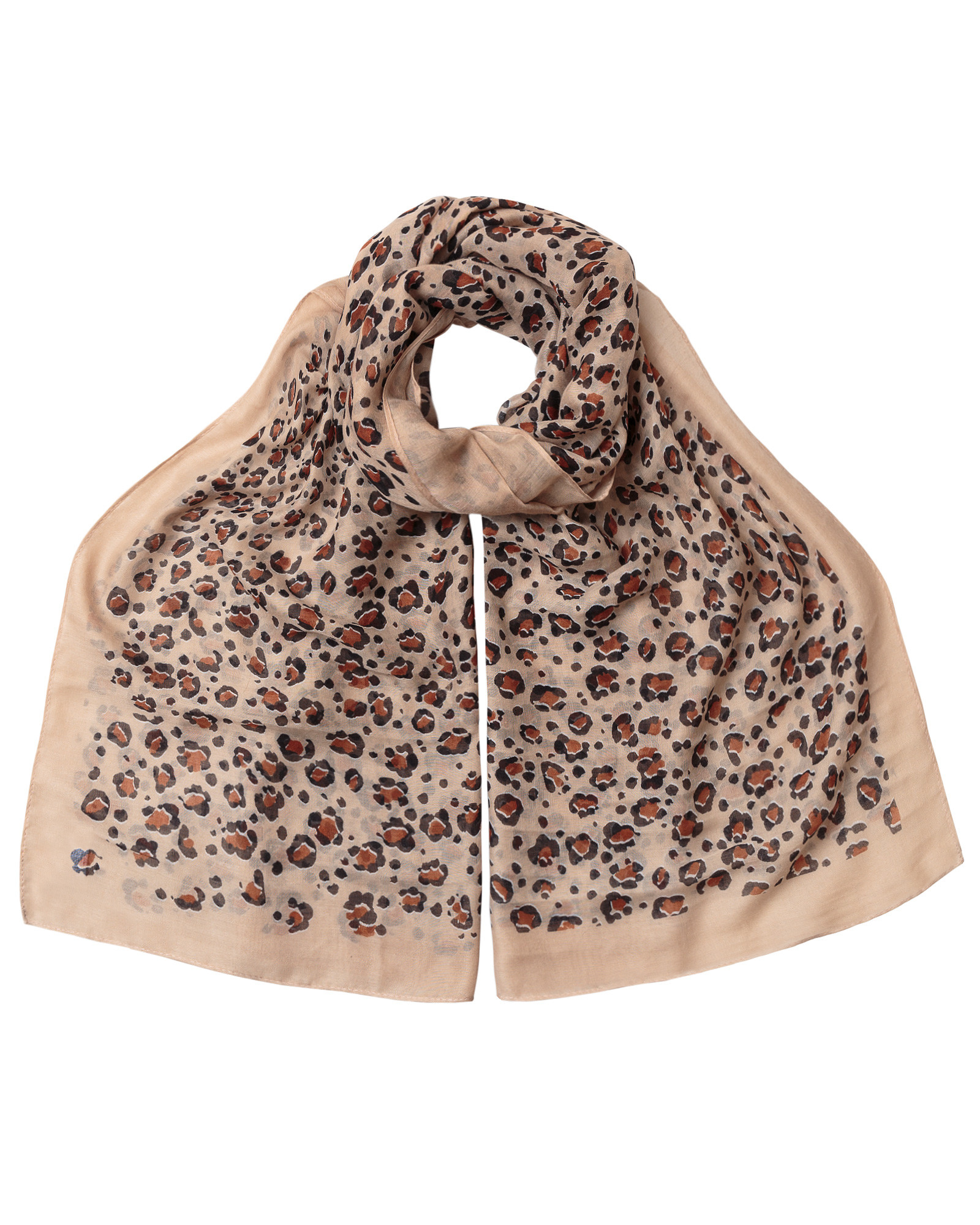 On a neutral beige base, this lightweigth scarf is decorated with an animal print in brown and black tones, completed with a plain border at the edges.
