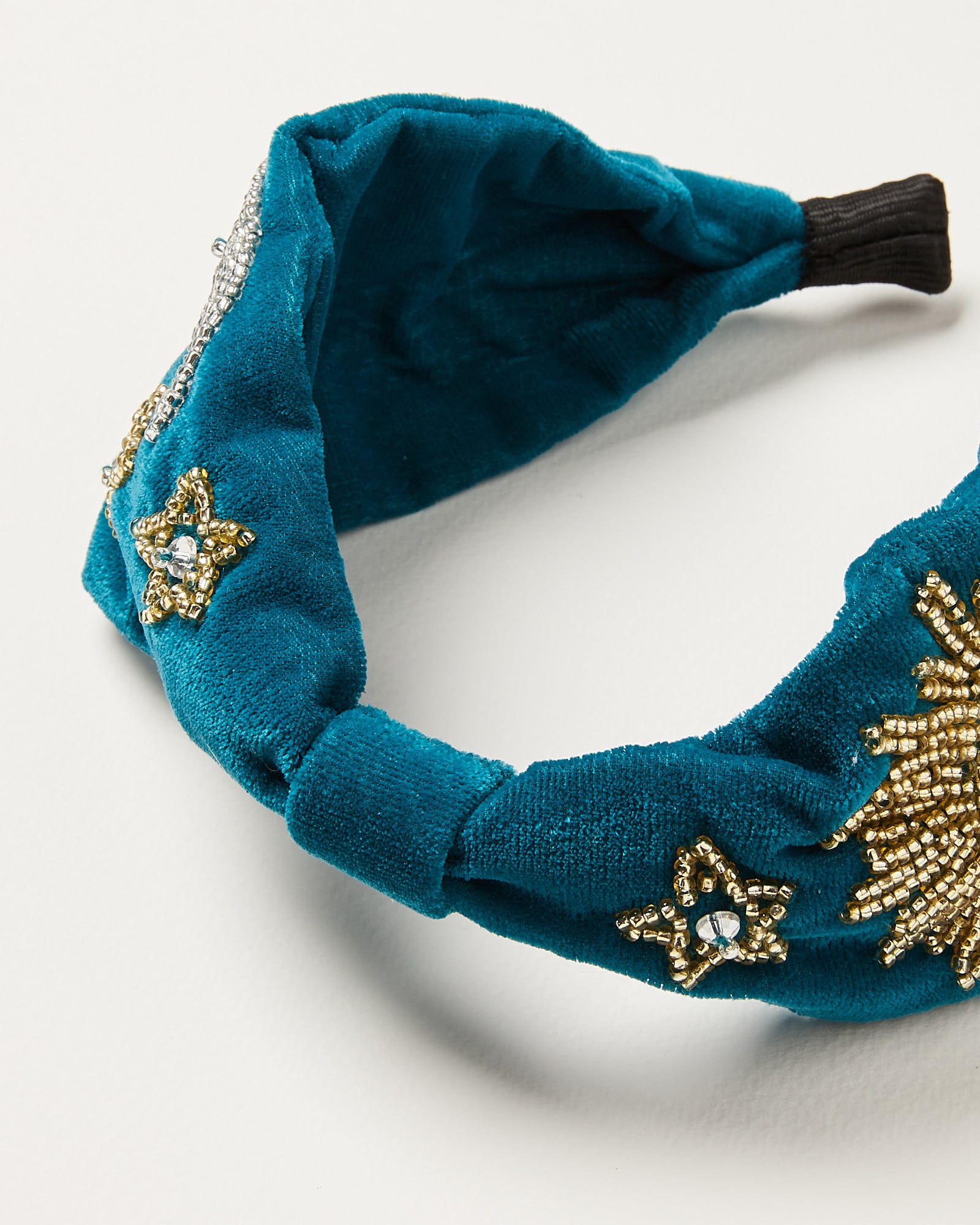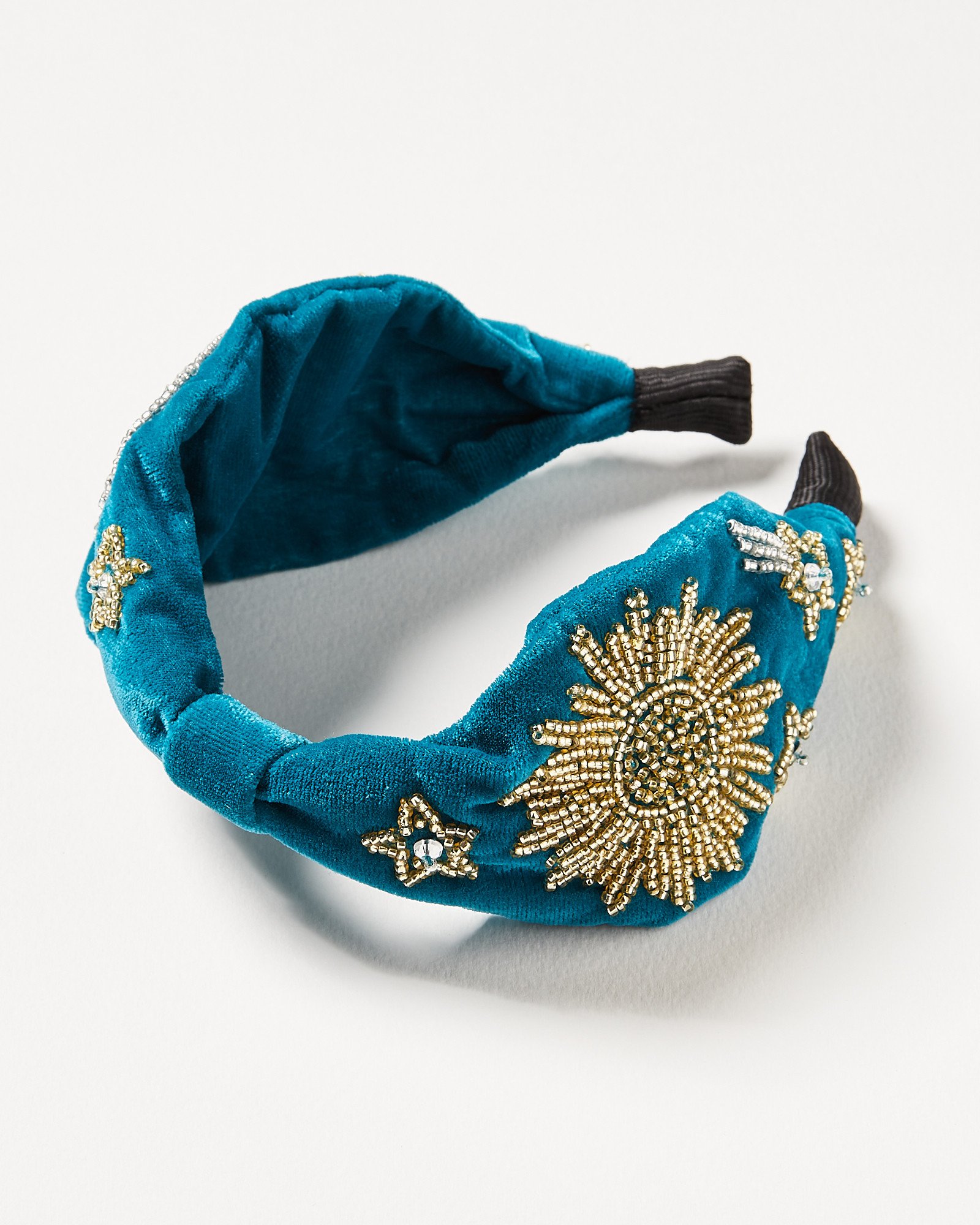 Dare to dazzle this festive season with the Night Sky Bead Velvet Headband. In a knotted profile, this teal blue velvet hairband is decorated with celestial designs in opulent silver and gold-toned beading to add a statement shimmer to your 'do.