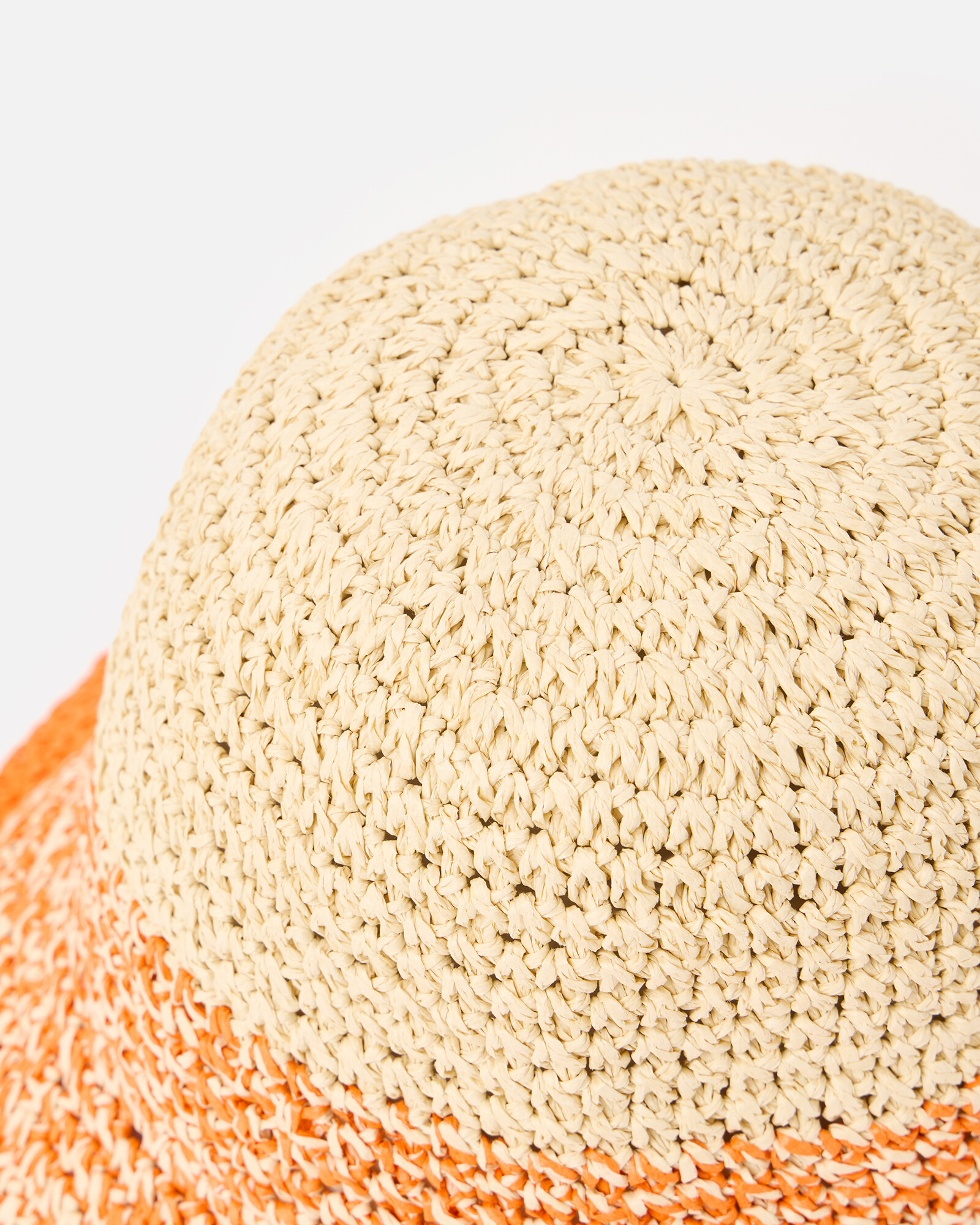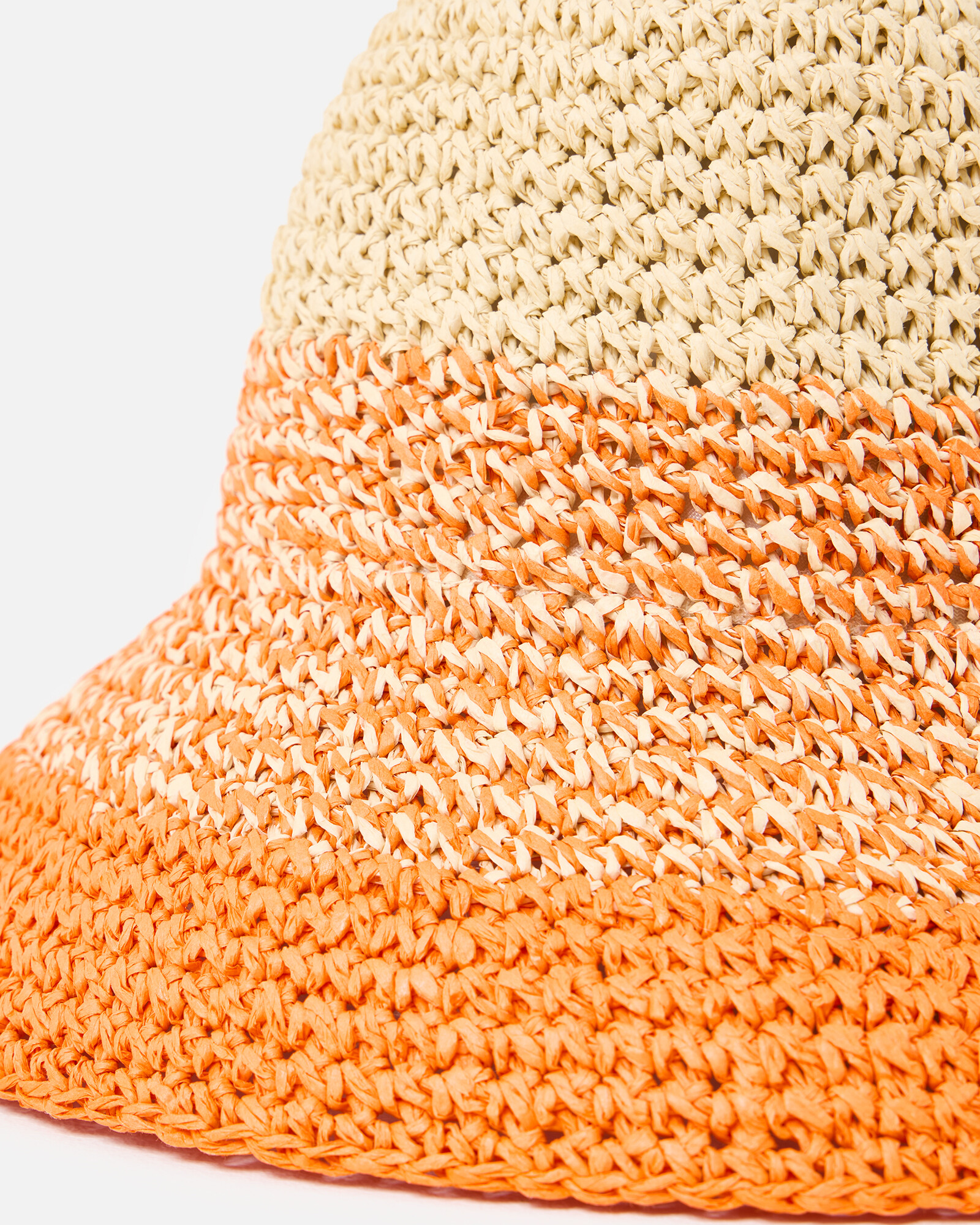 Stay cool in the summer months with this straw bucket hat in a natural-to-orange ombre design.