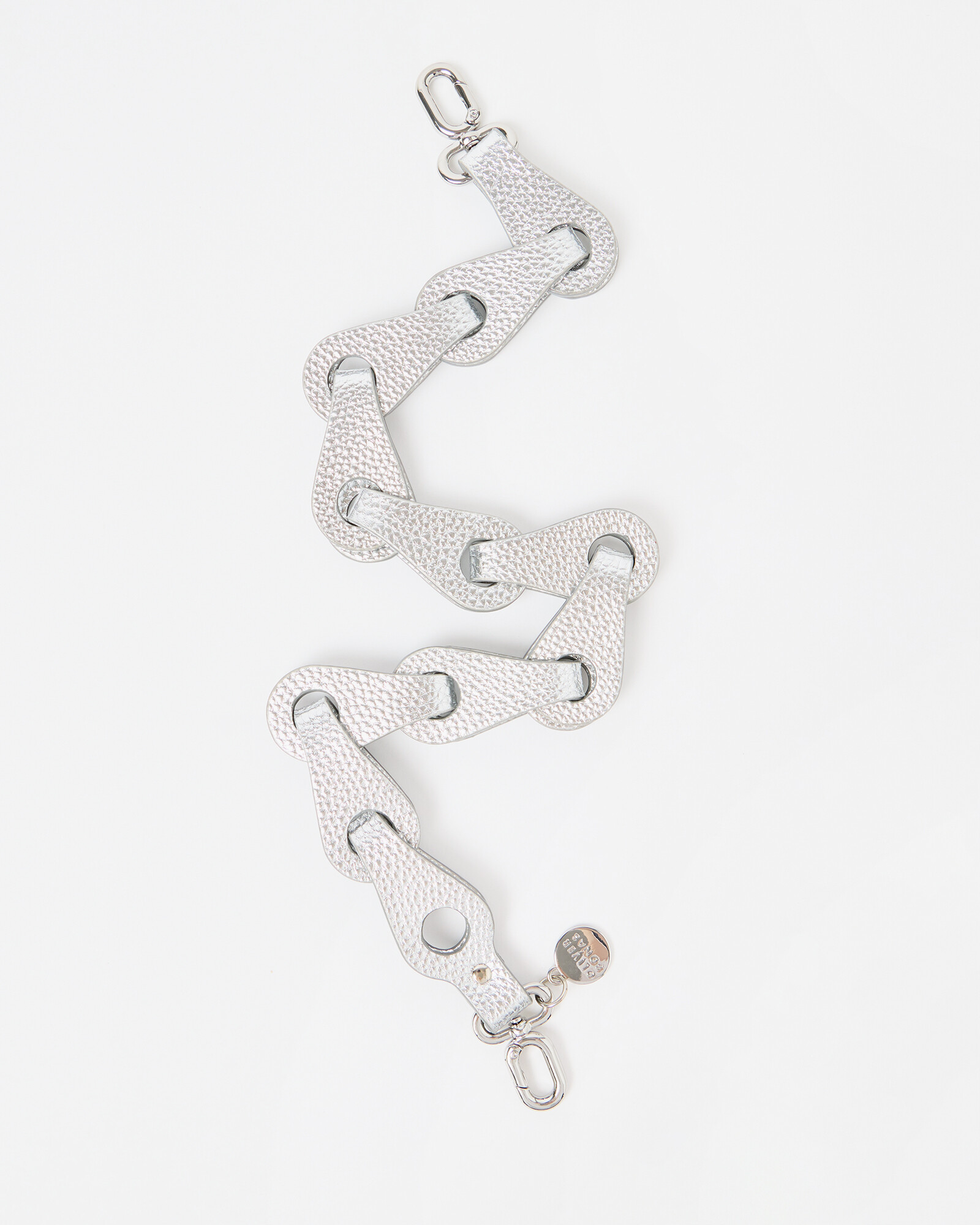 Metallic replacement bag strap with teardrop-shaped links in a chain design. Clip the silver clasps to your tote or crossbody bag and wear on your shoulder.