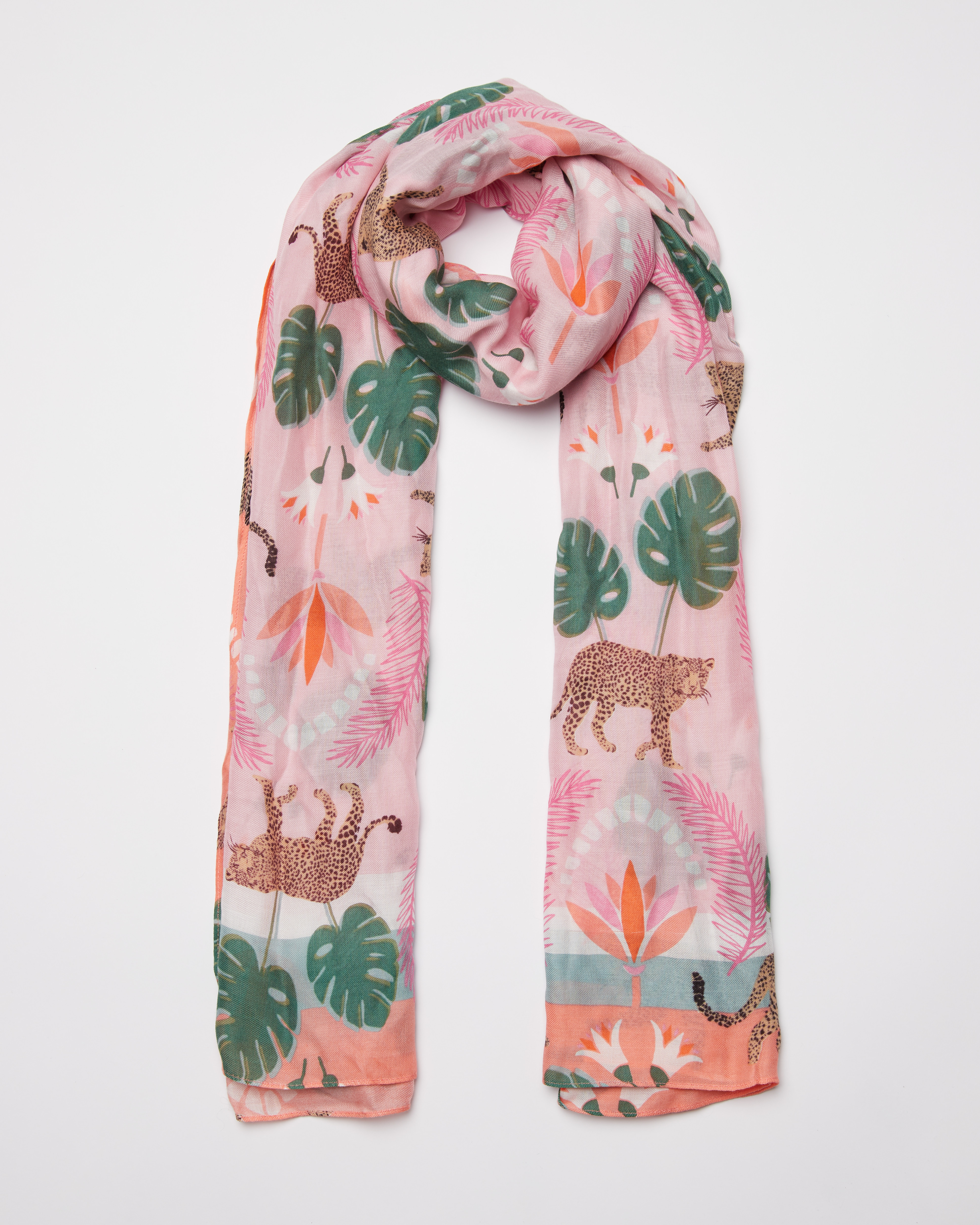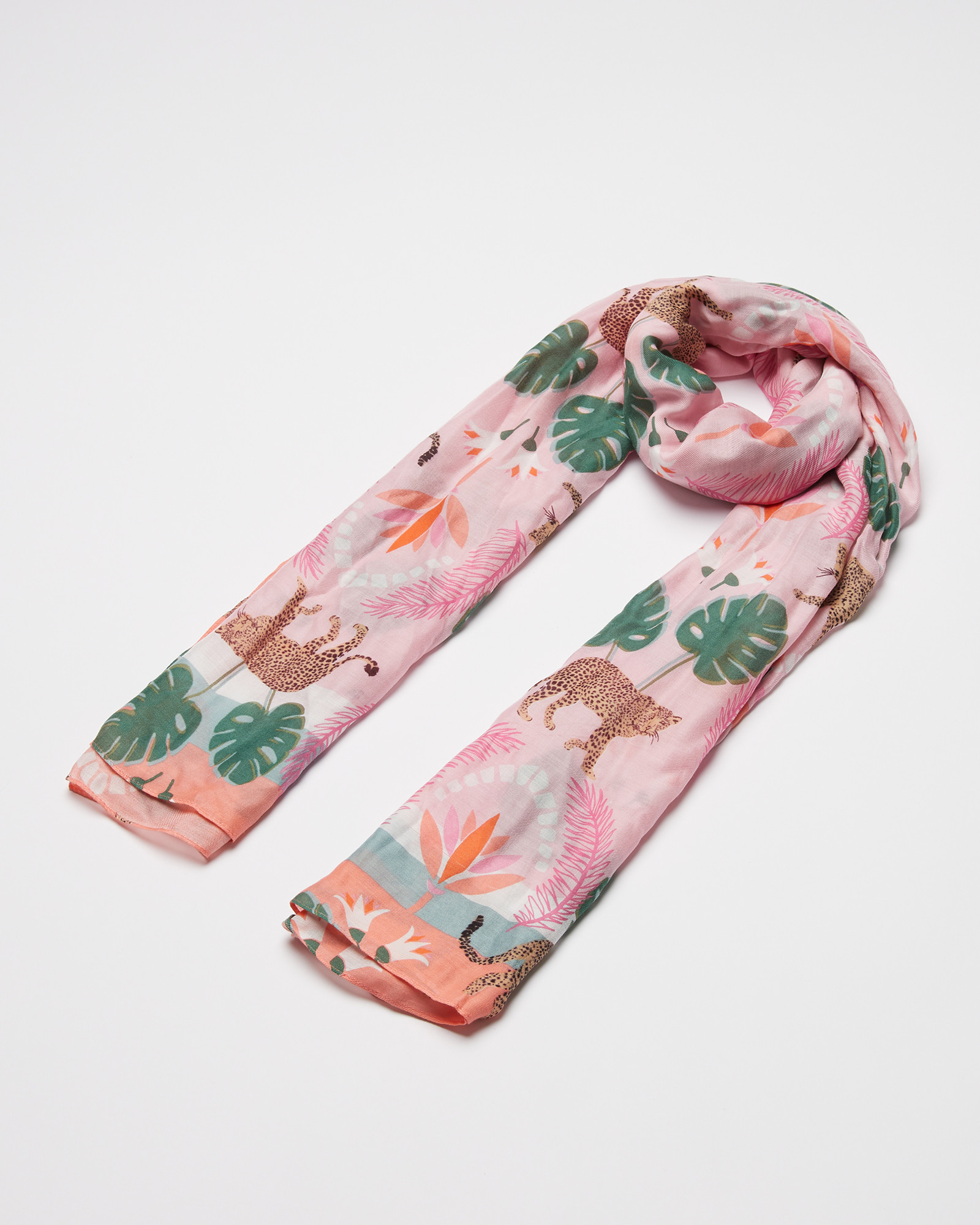 Add a botanical burst to your outfit with this pale pink scarf is a lightweigth style featuring a leaf and panther design in green and orange tones.