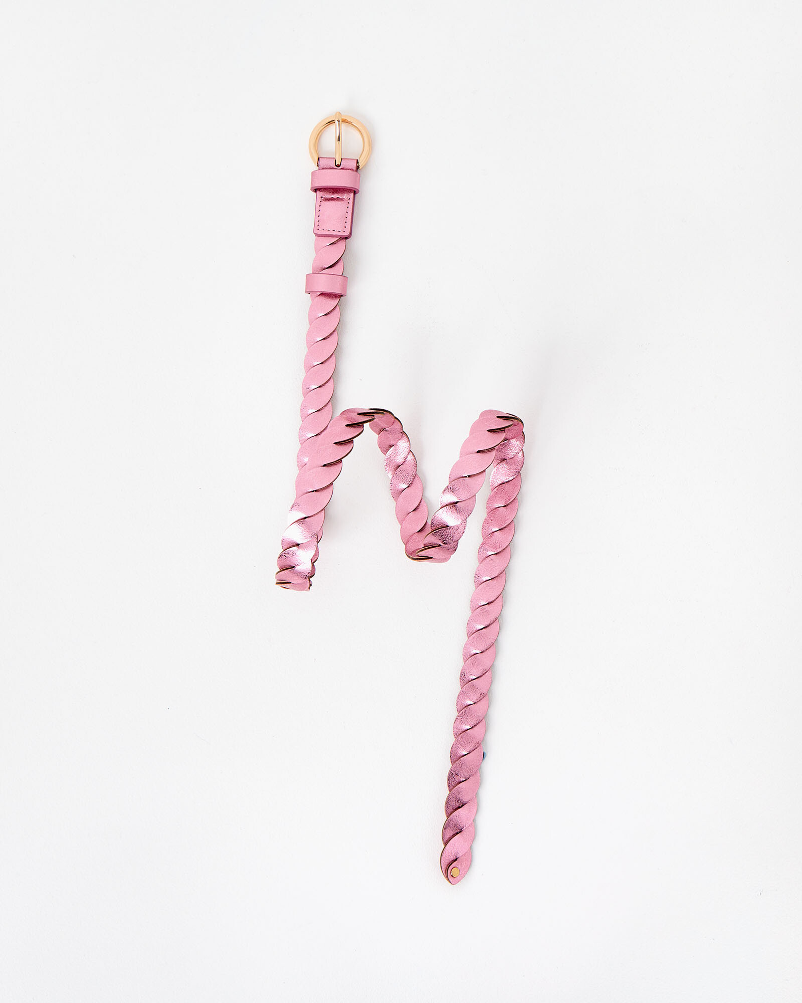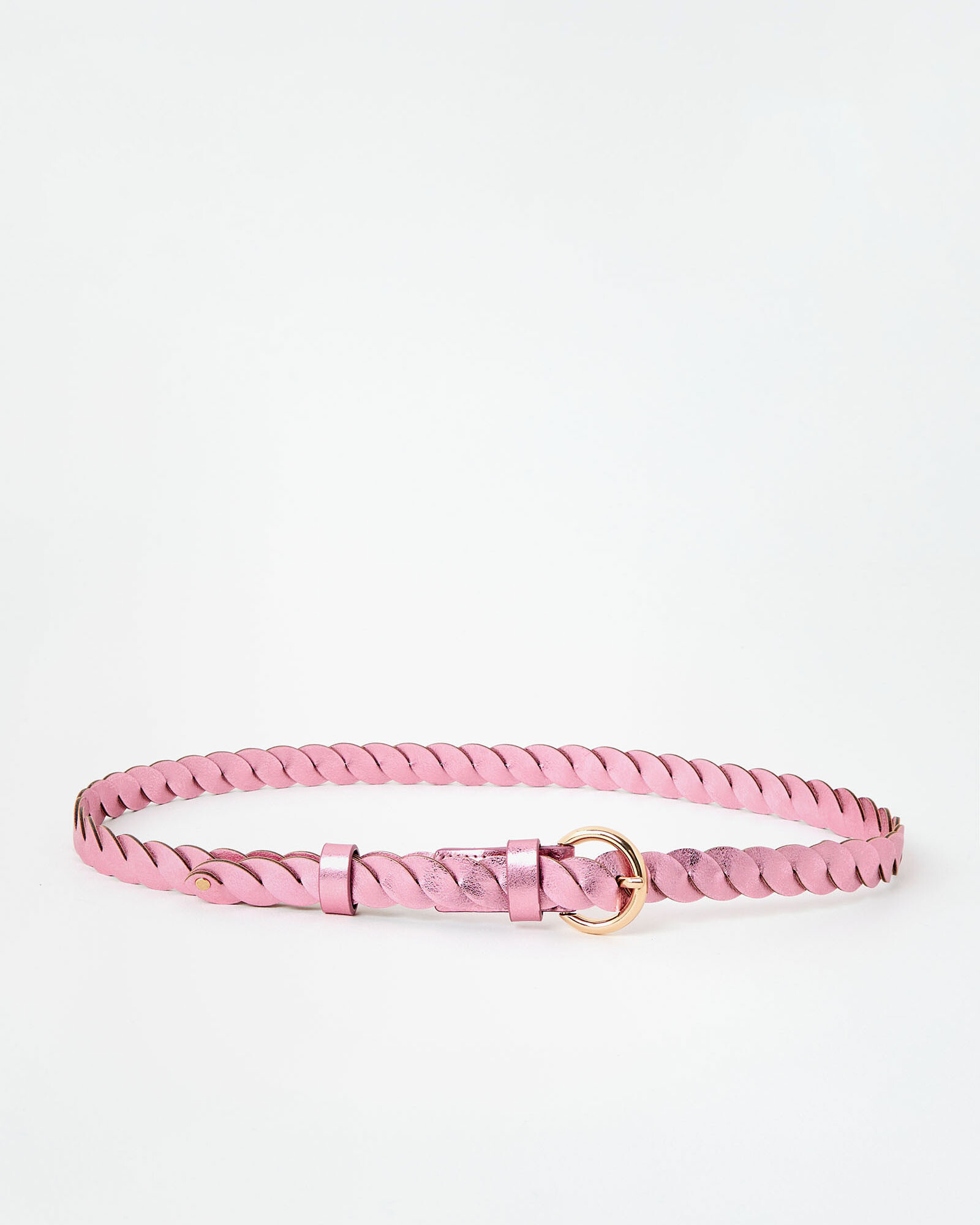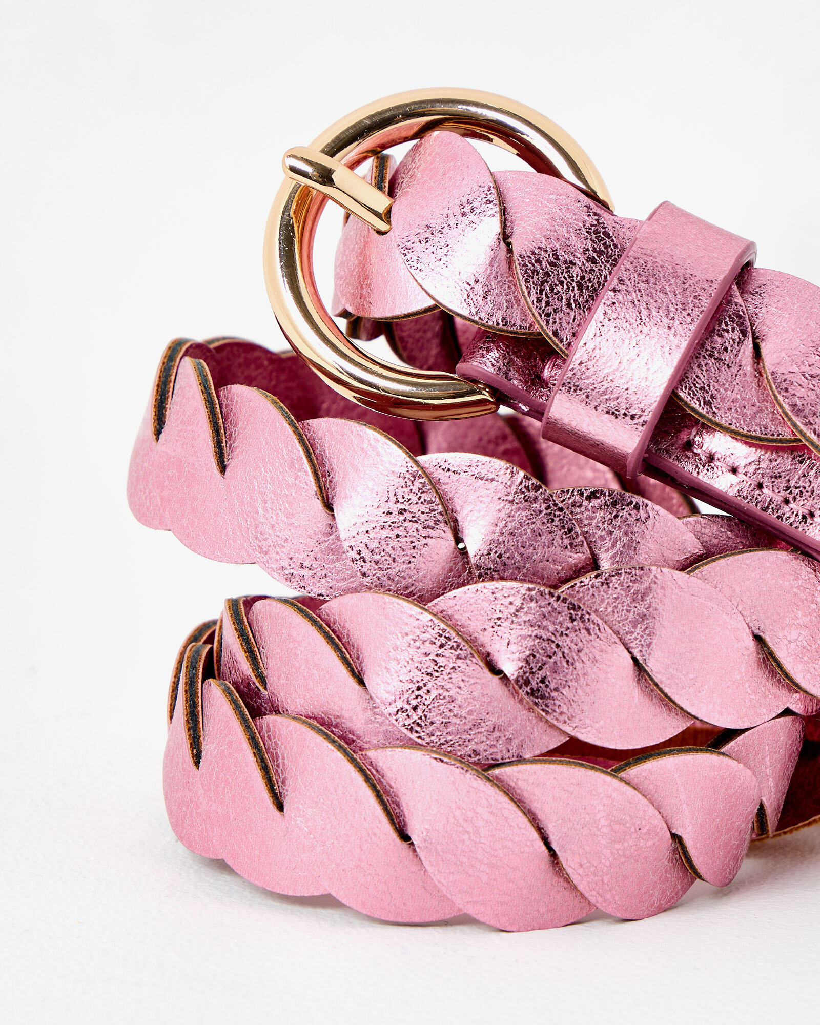 Metallic pink jeans belt made from two PU panels twisted together, with a rounded gold buckle.