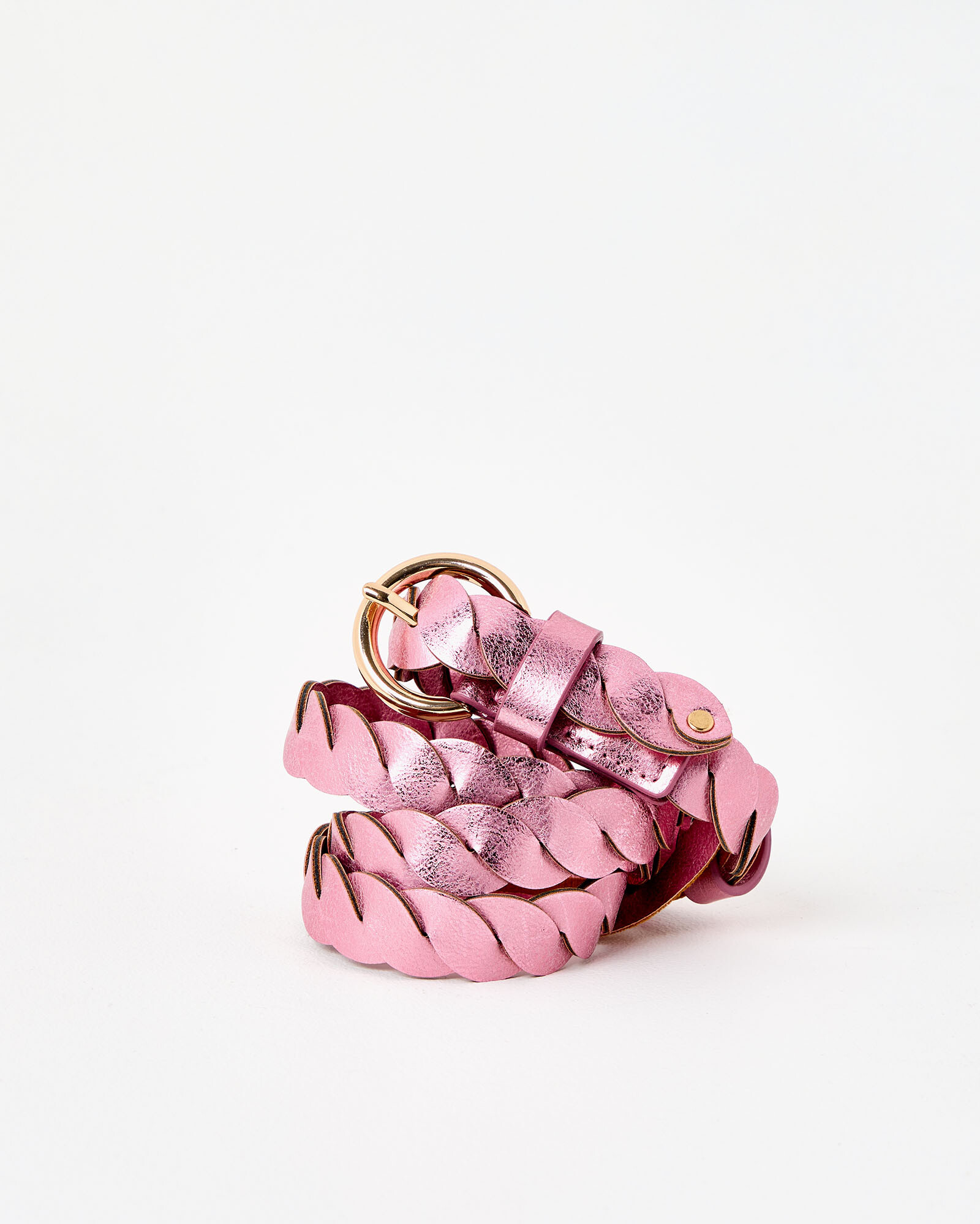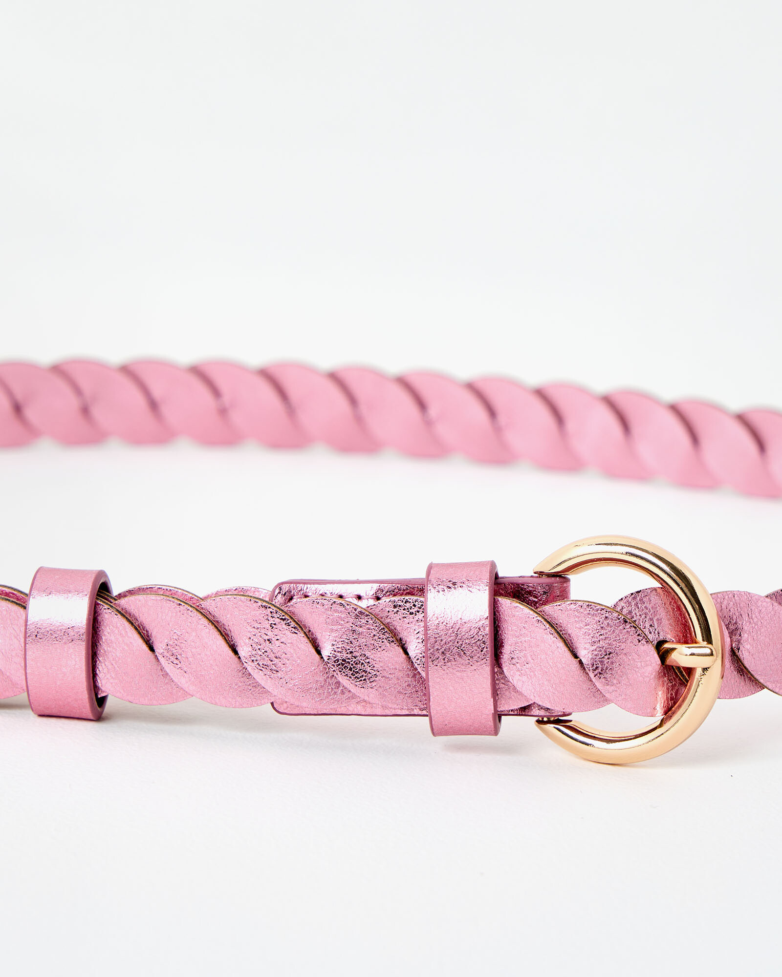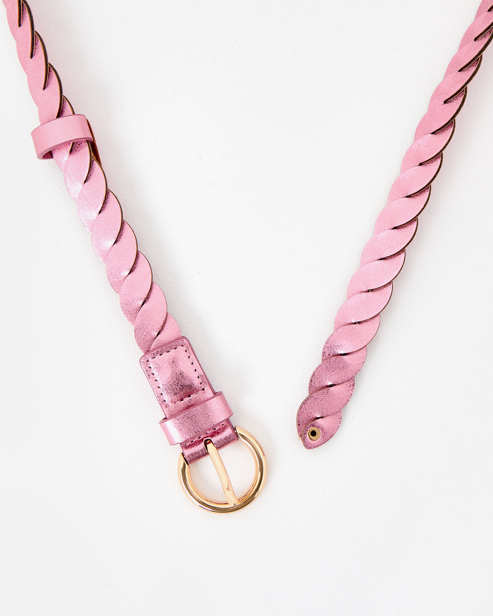 Metallic pink jeans belt made from two PU panels twisted together, with a rounded gold buckle.