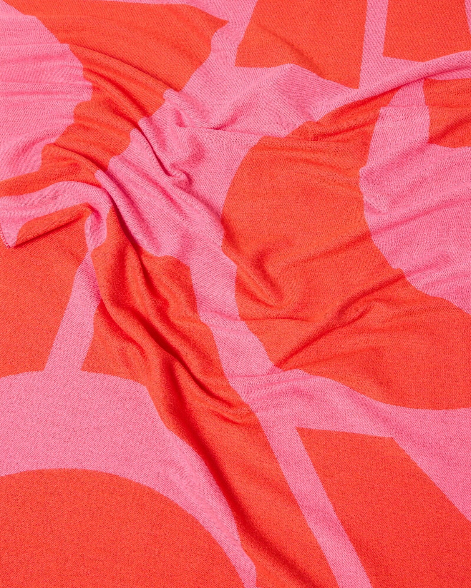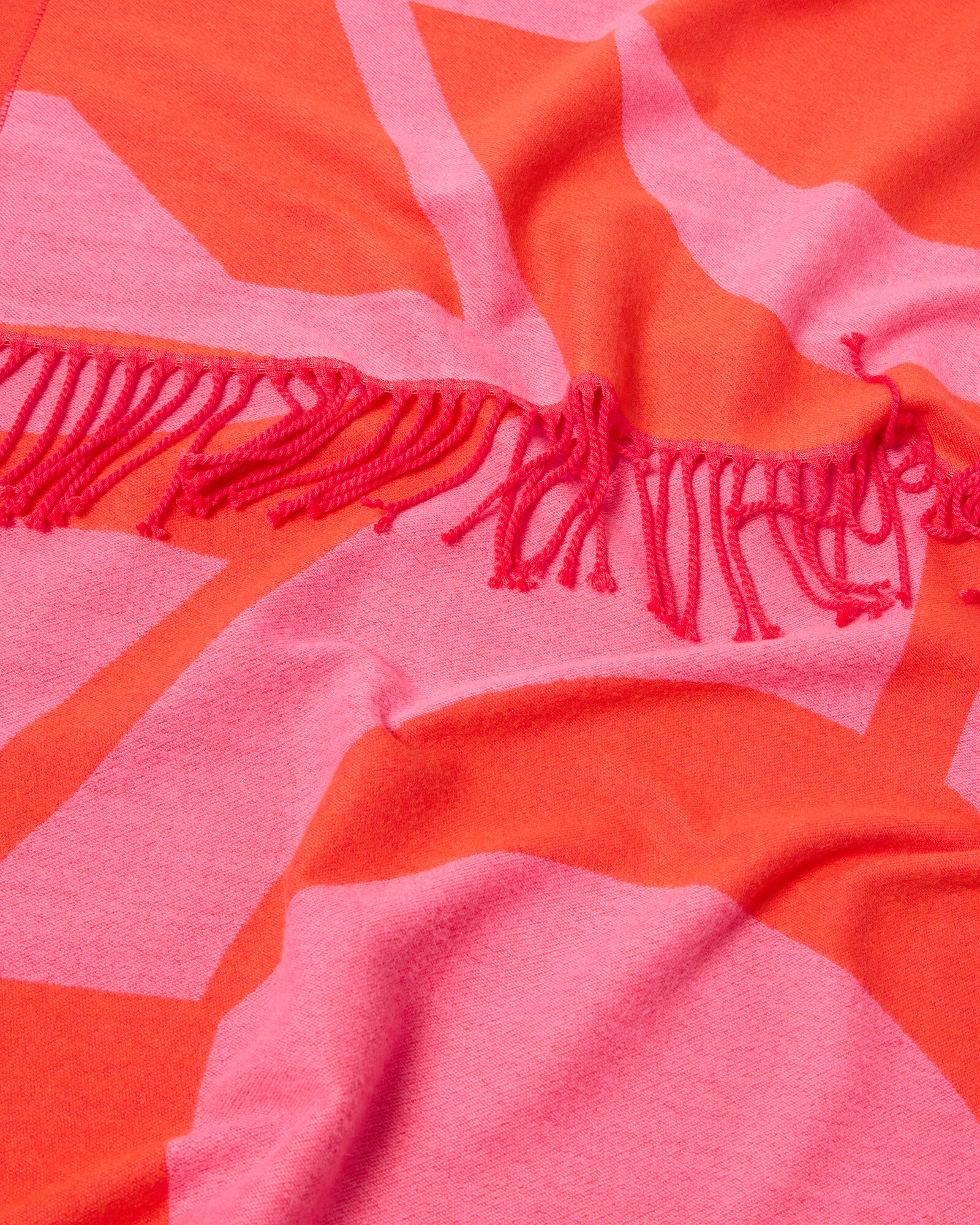 Jacquard scarf woven in a pink and red geometric design with twisted tassel trims.