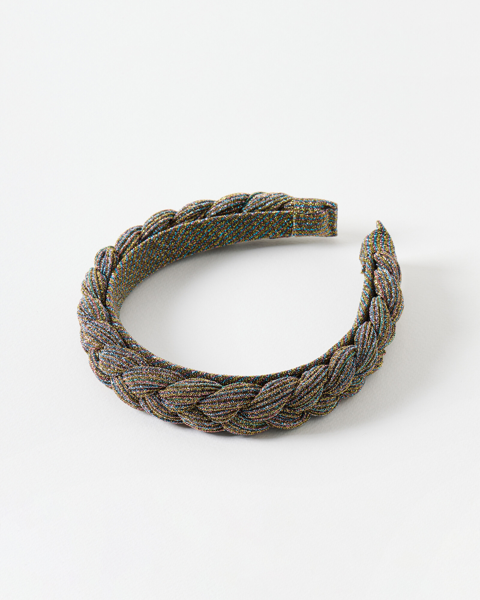 Puffy headband in a plaited design with rainbow glitter stripes all over for a subtle sparkle.