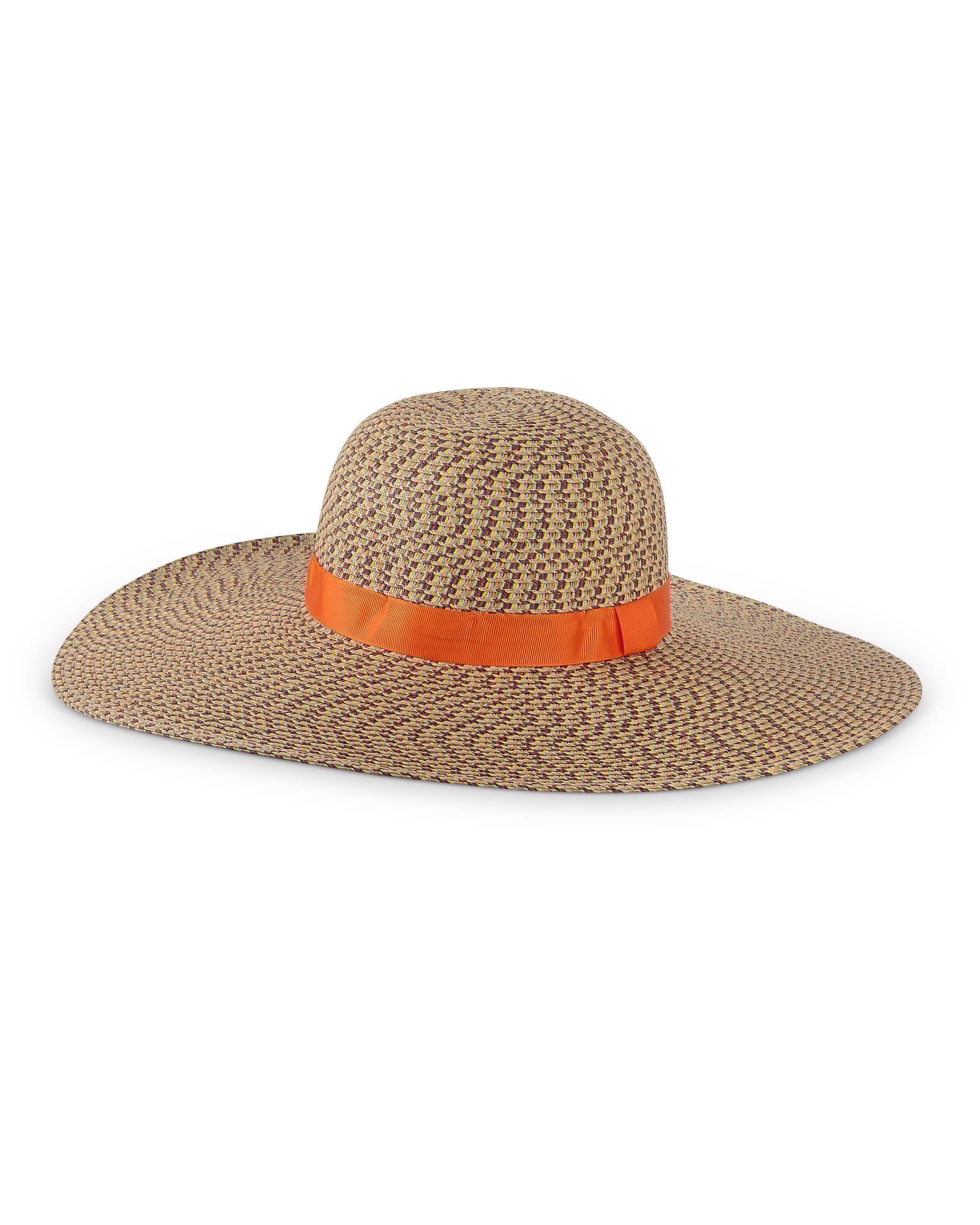 With a woven design and a natural finish for a traditional straw hat look, this hat features a bright pop of orange and a large, floppy brim to keep the sun from your eyes.