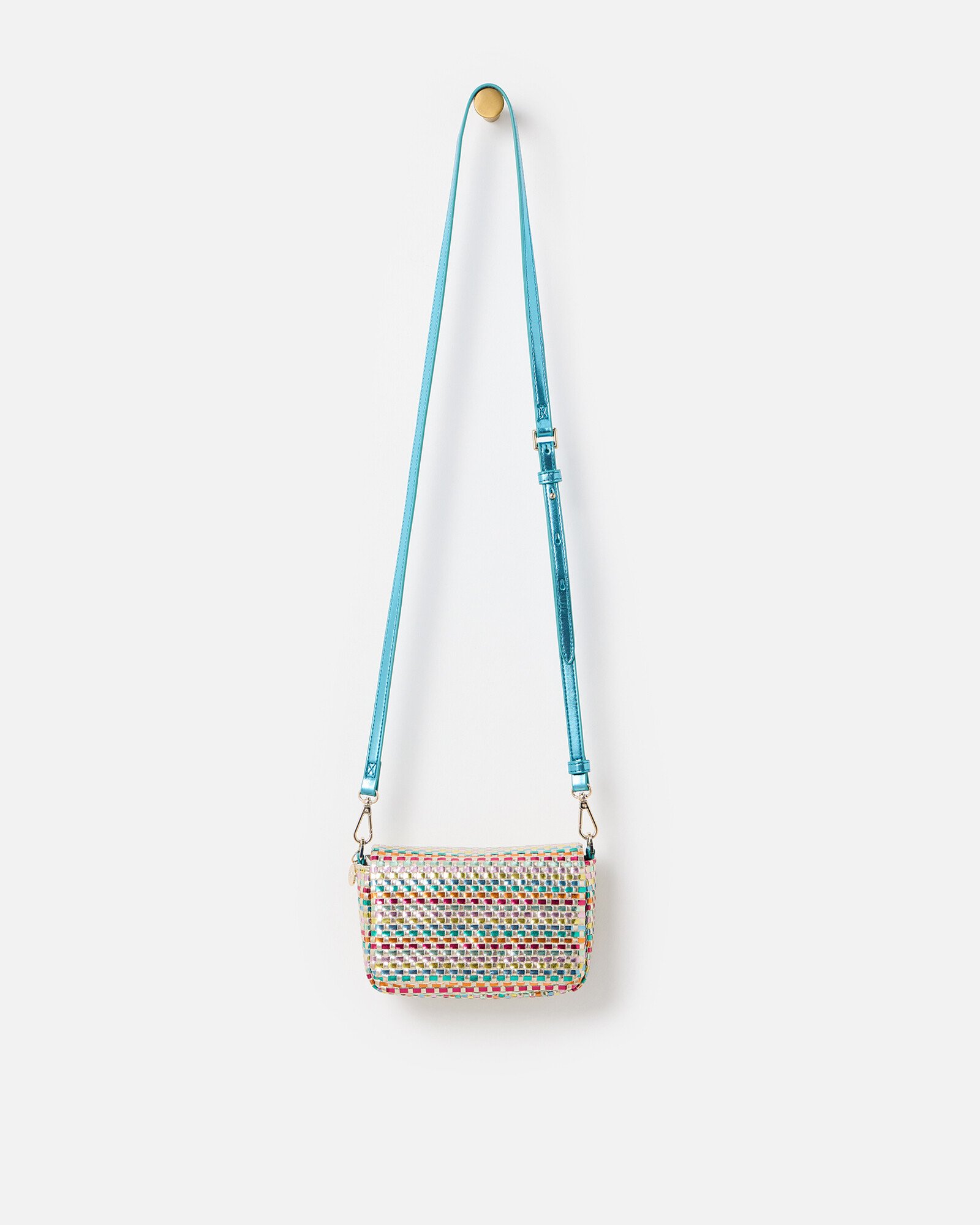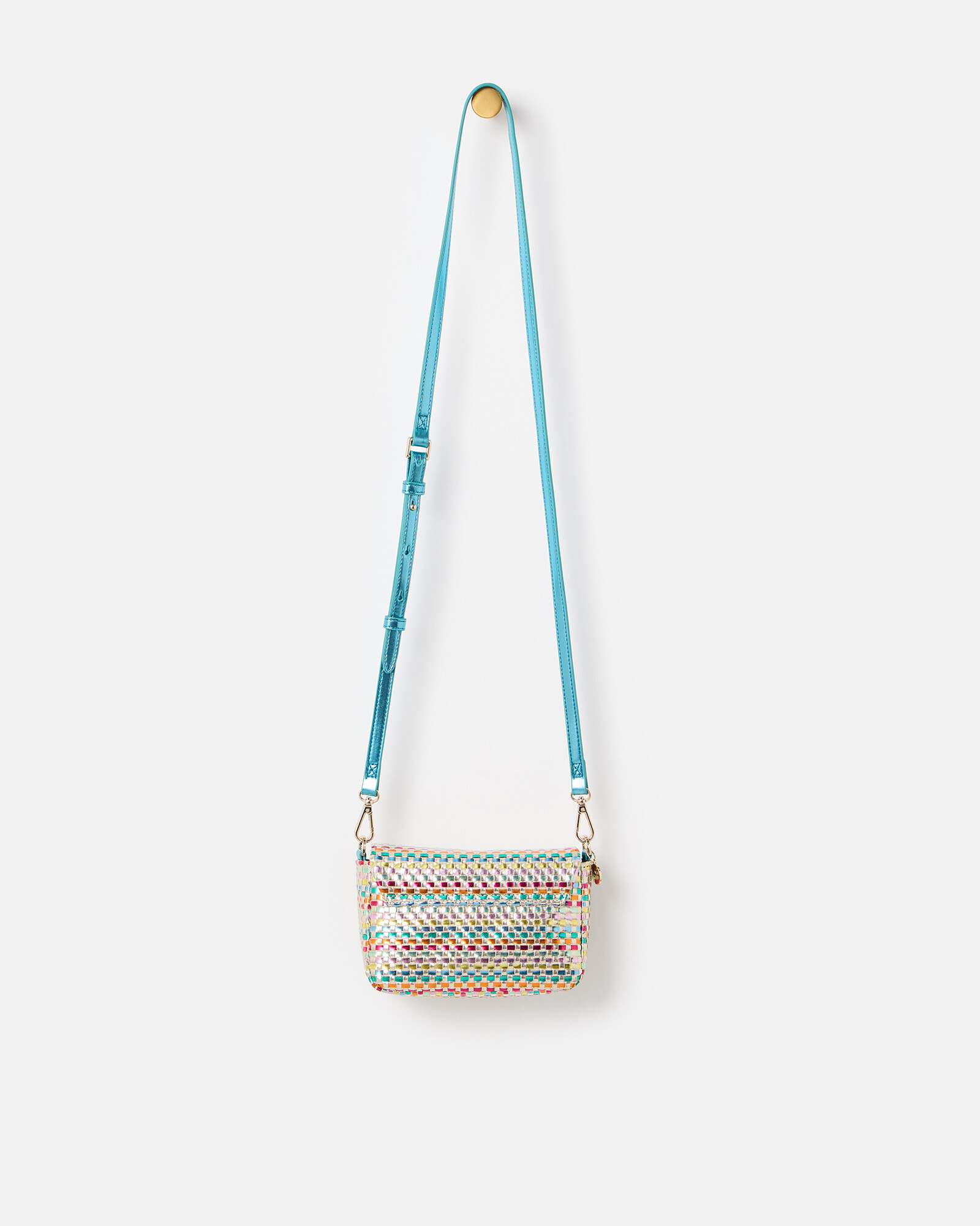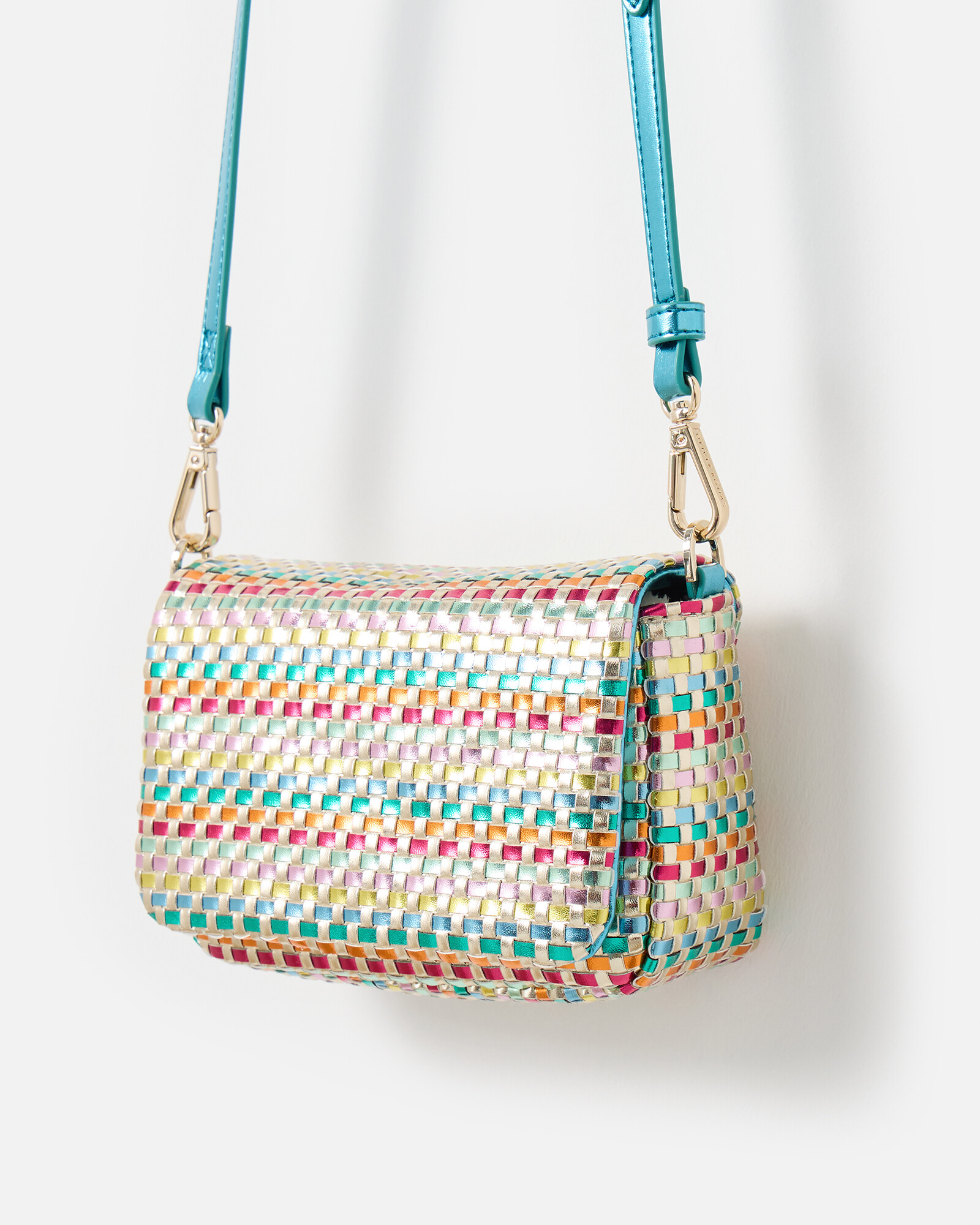 Metallic crossbody bag in a woven design featuring gold and rainbow coloured panels in shades of blue, pink yellow and orange. Designed with a magnetic flap closure and a blue metallic adjustable slim strap to wear across the body or remove to use as a clutch, it is a perfect colour-pop accessory to complement your wedding guest attire and holiday outfits.