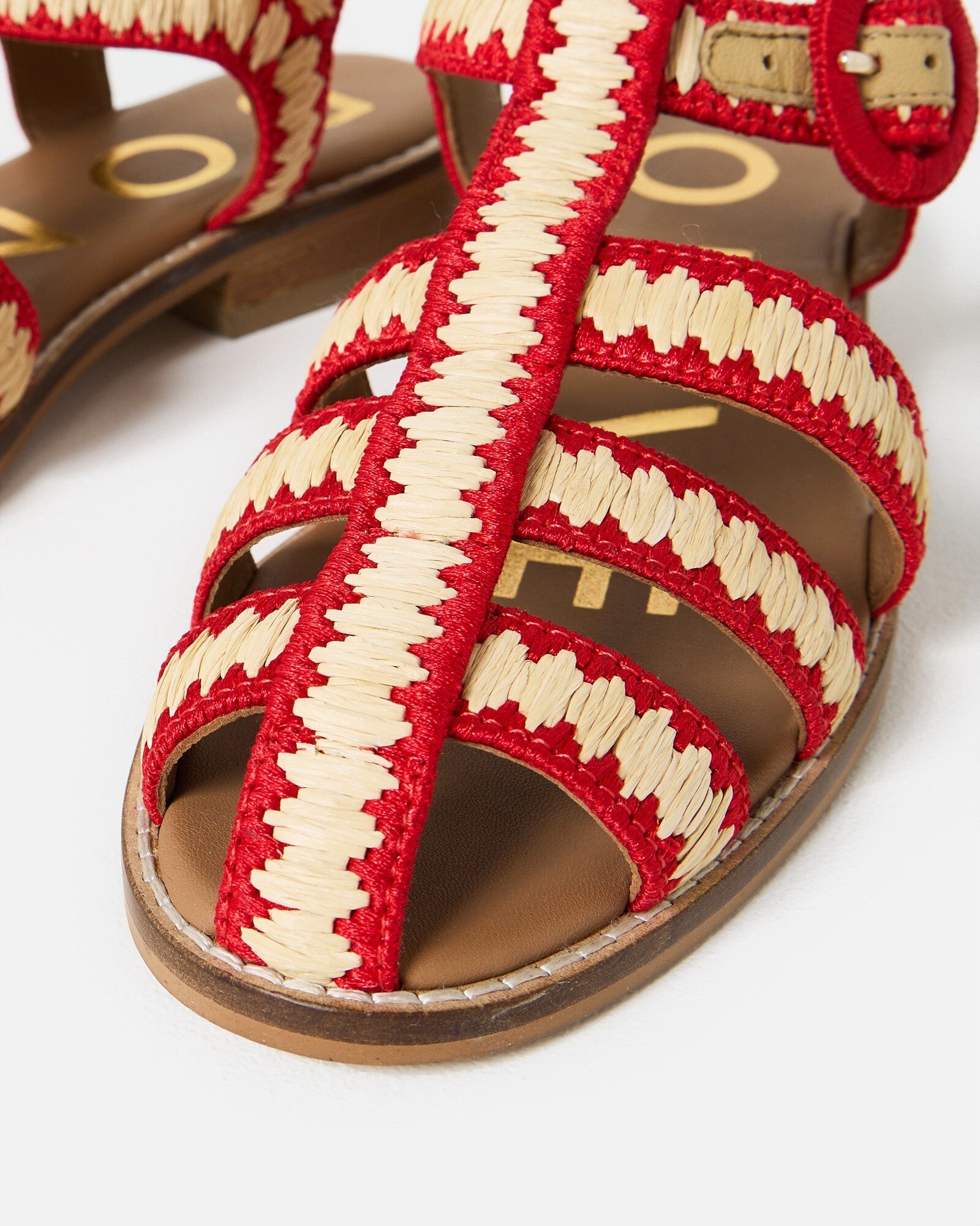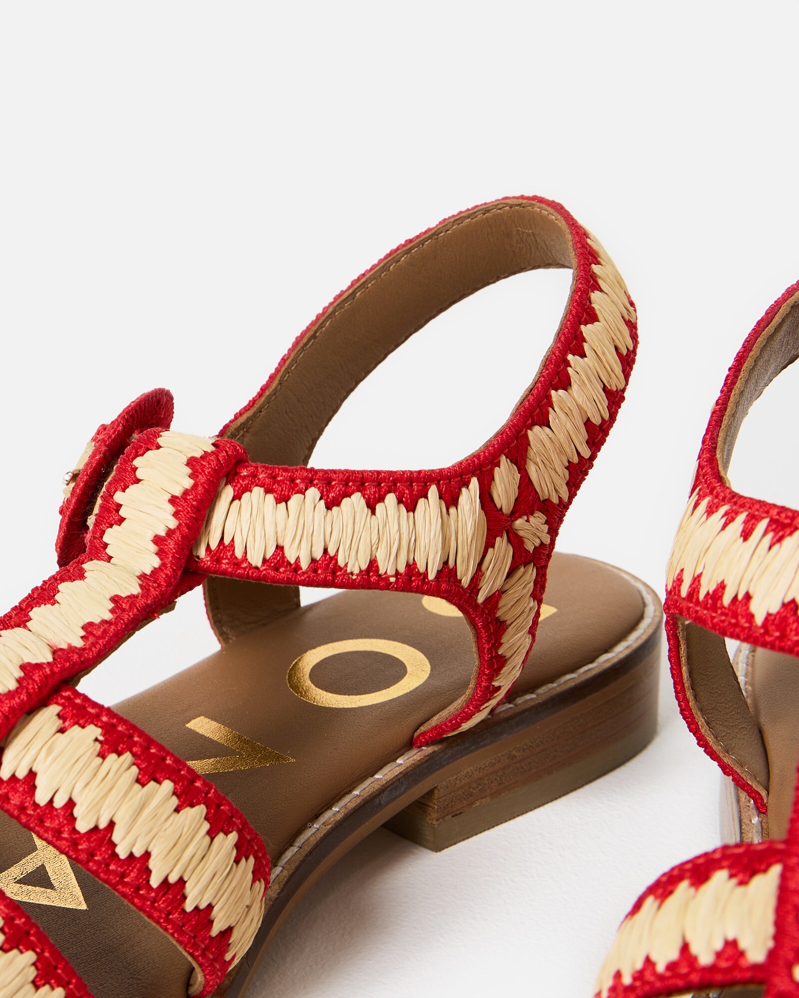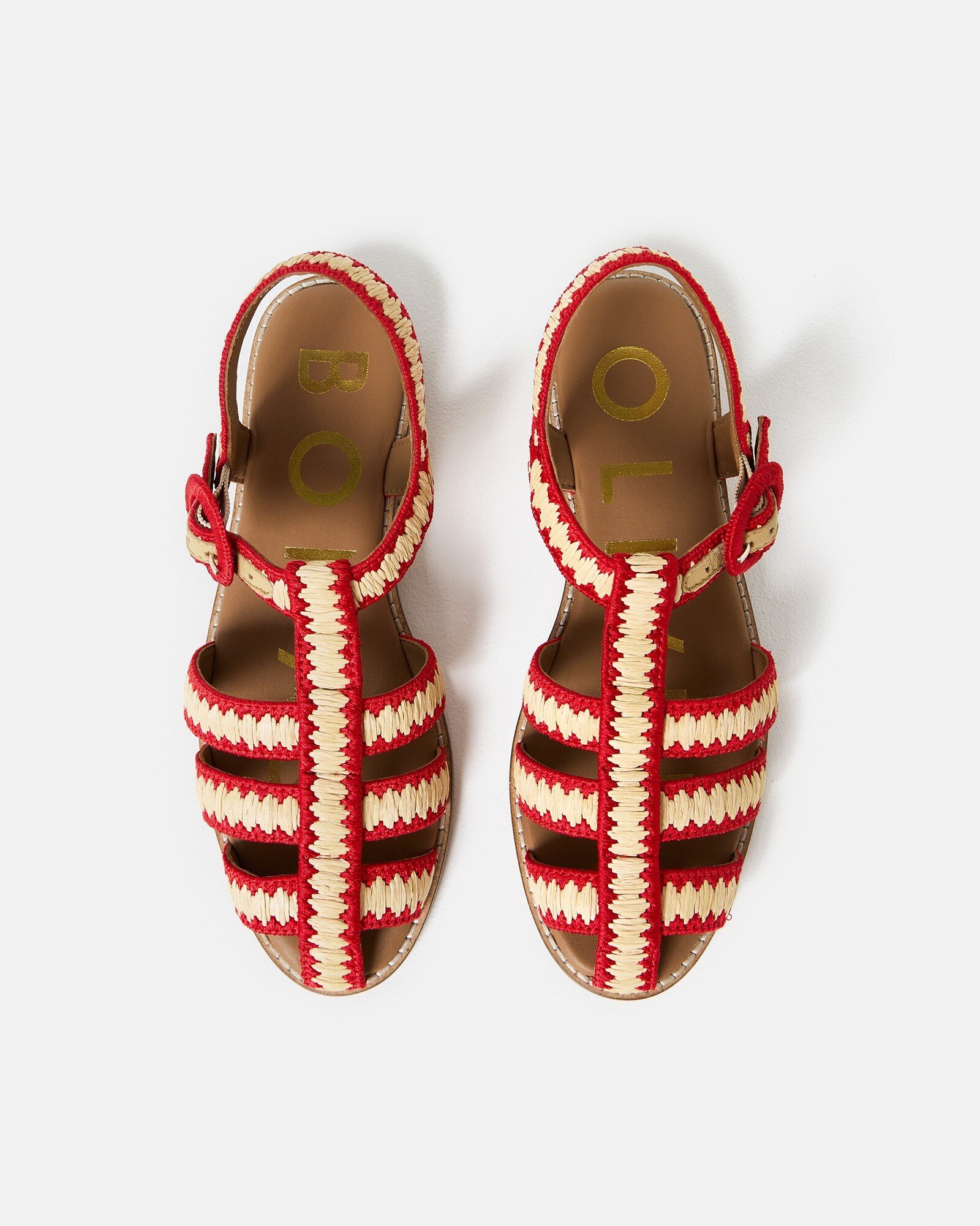 Ready for all-day summer stepping, our summer fisherman sandals will take you from seaside to sightseeing. With three straps across the foot and a closed-toe design, they're woven in natural and red paper raffia for a pop of colour. Fastening at the ankle with a paper-covered loop and gold buckle, the leather sole has been designed with a wood-effect base and padded footbed for happy feet. Alongside a gold metallic OB logo on each sole, we've added a small block heel for a little height.