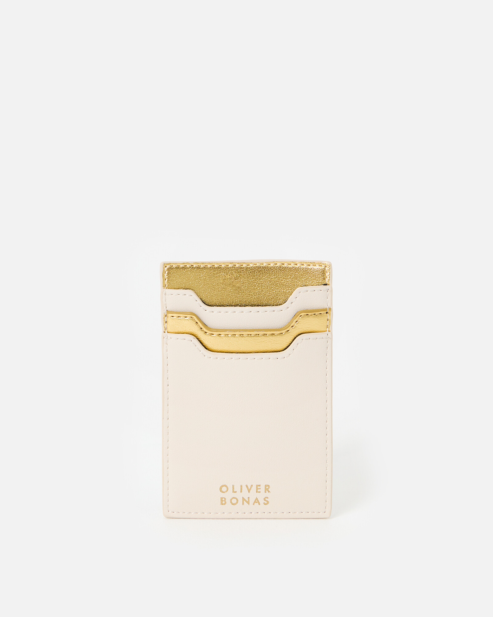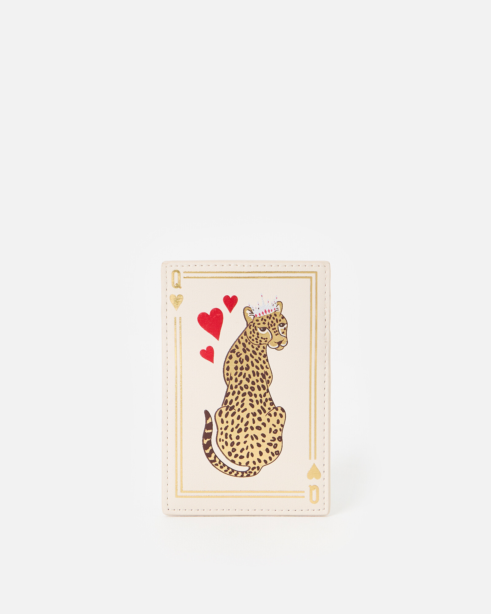 Cream card holder with a leopard illustration inspired by a queen playing card with gold foil detailing. Designed with alternating cream and gold card slots and embossed OB logo.