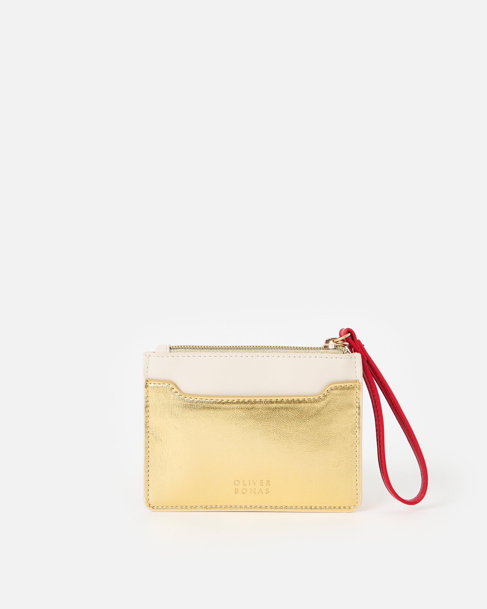 Cream zipped pouch with a leopard illustration inspired by a queen playing card with gold foil detailing. Designed with a gold logo charm, red handle and an exterior card slot on the back.