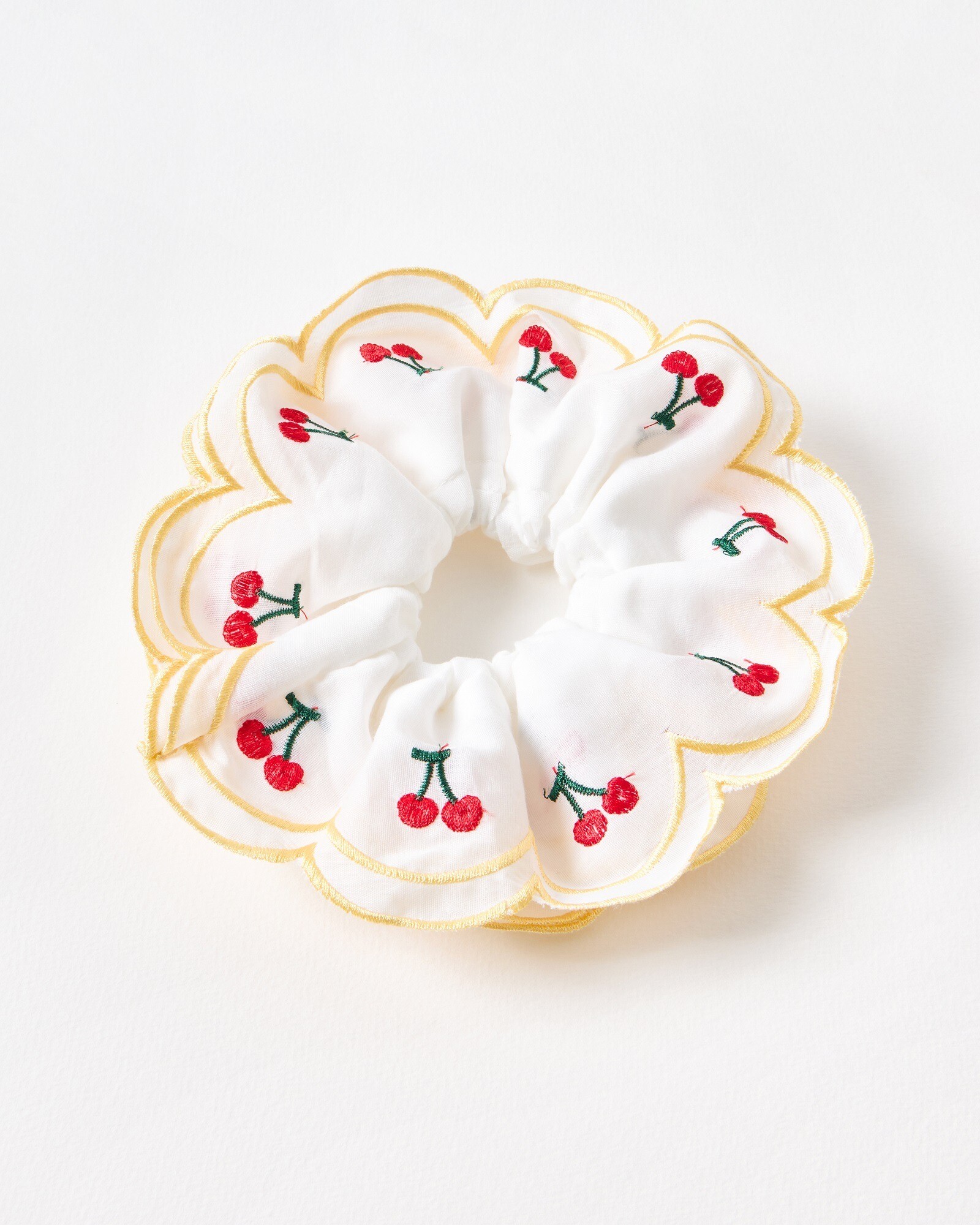 Elevate your everyday bun or ponytail with our white oversized hair scrunchie with embroidered cherry motifs and a contrasting yellow trim.