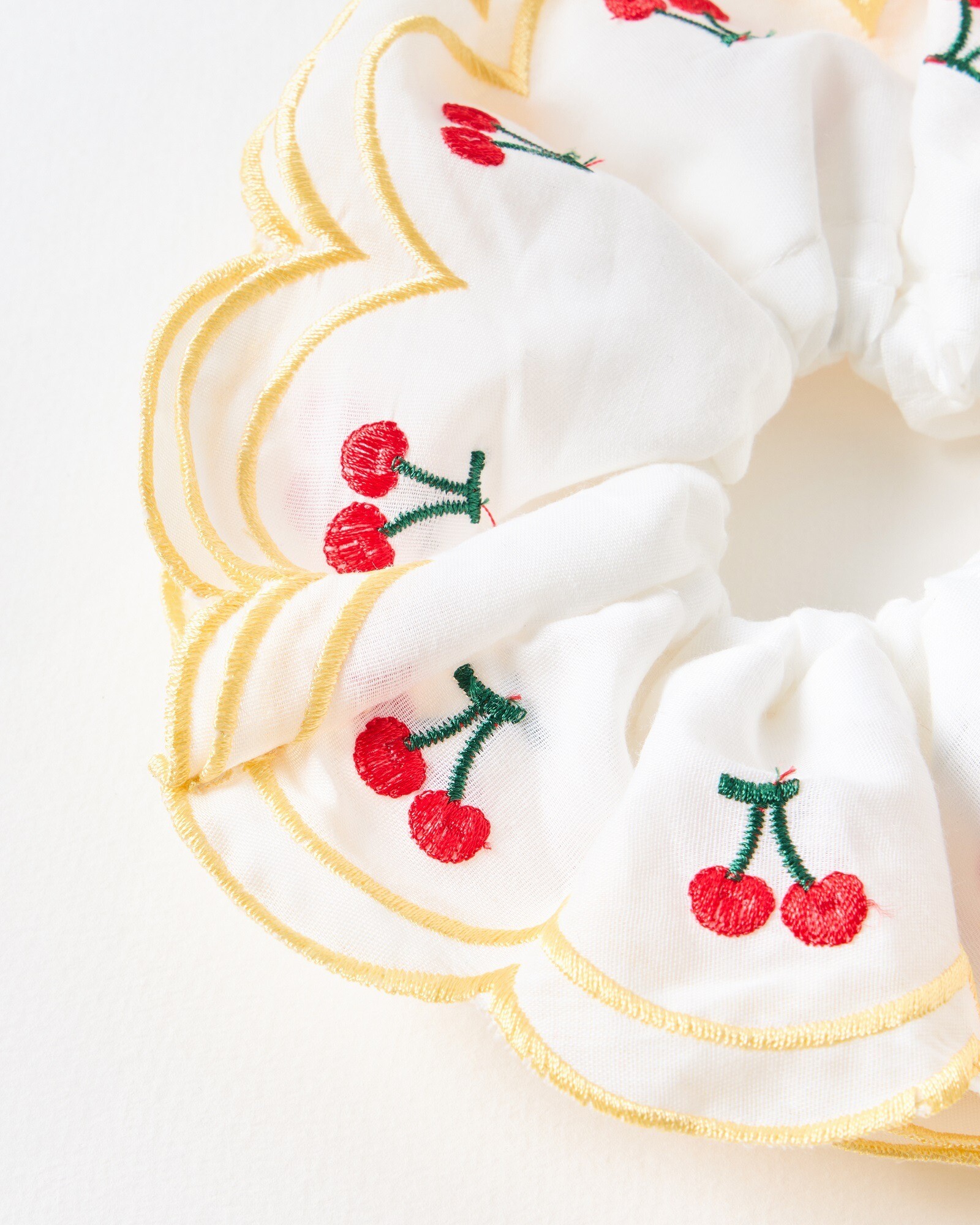 Ripley White Cherry Embroidered Frill Large Hair Scrunchie