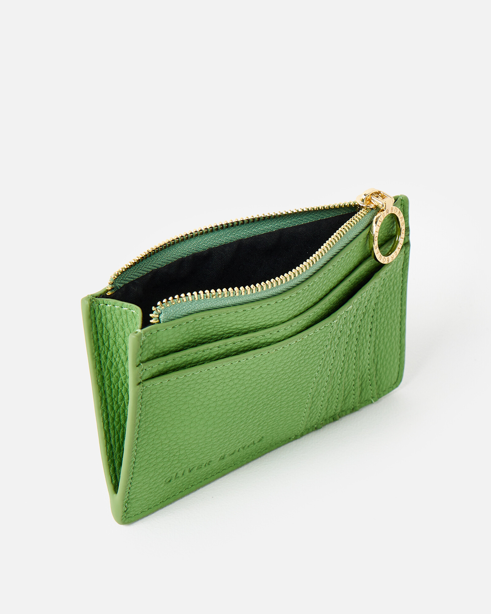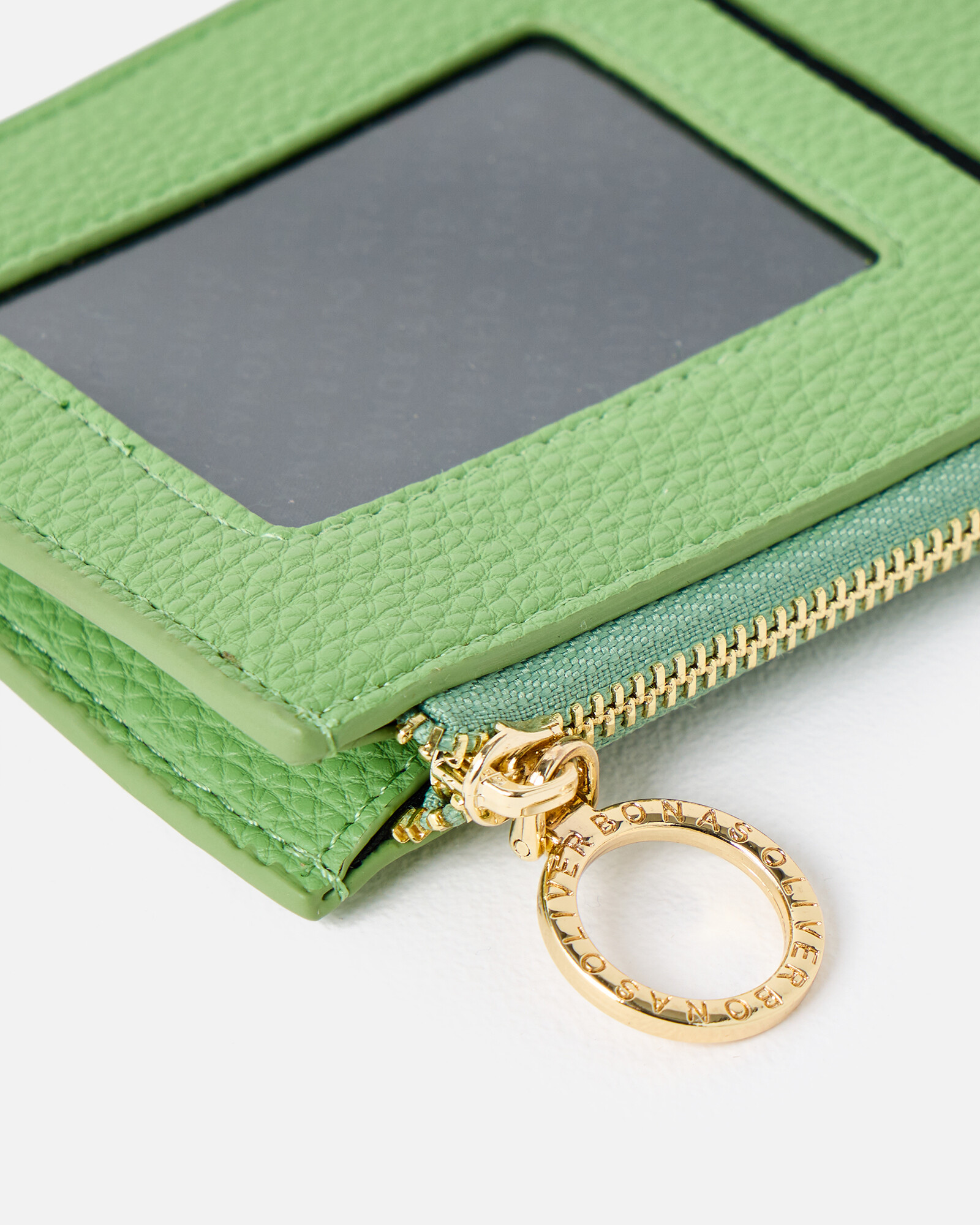 Khaki green card holder with curved card slots on the front, a zipped pocket with a gold logo charm and a clear ID slot on the back.
