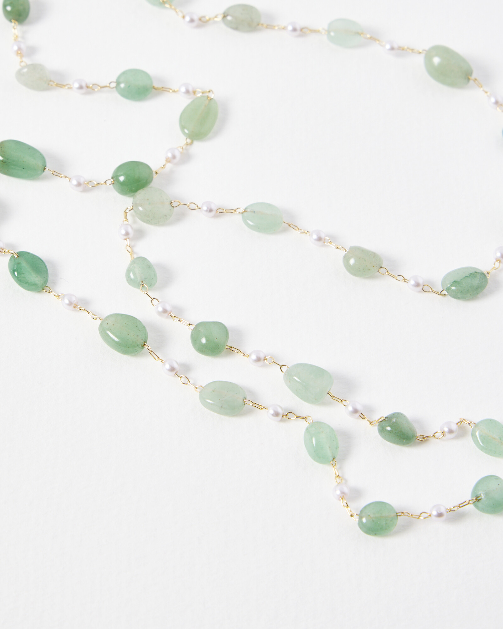 Dainty sunglasses chain made with sage green stones and small faux pearls.