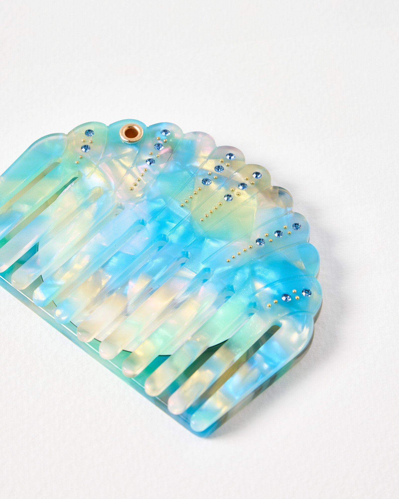 Tortoiseshell-style blue hair comb that folds out into a compact travel mirror.