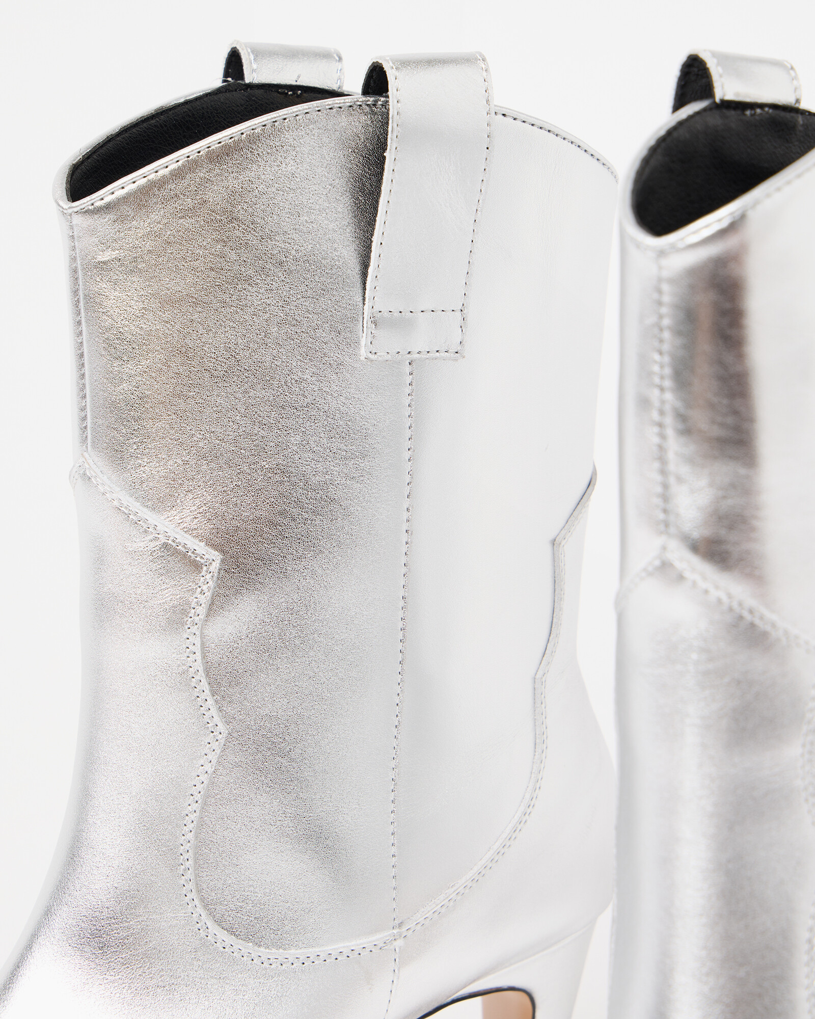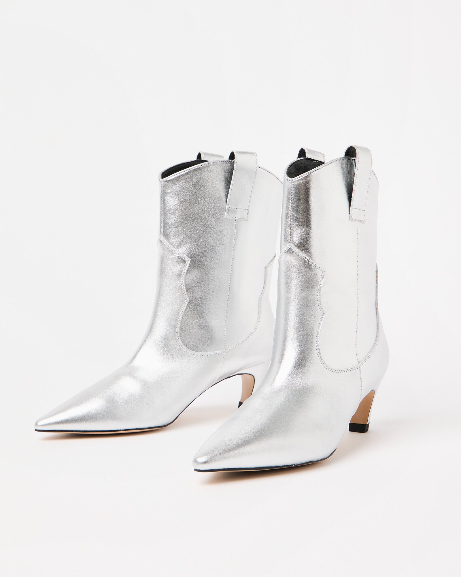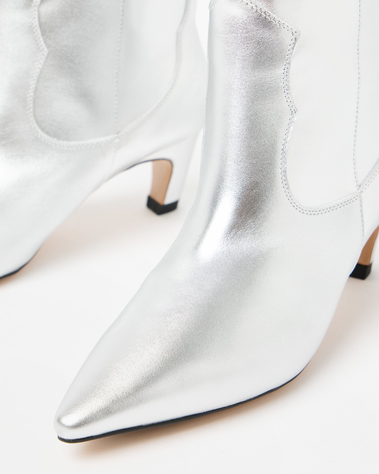 Western-inspired cowboy boots made from metallic silver leather, with a pointy toe and mid-high heel.