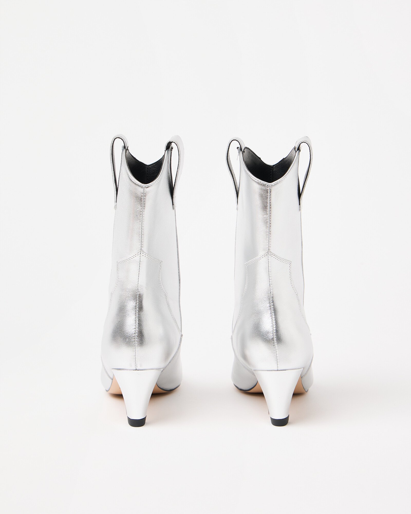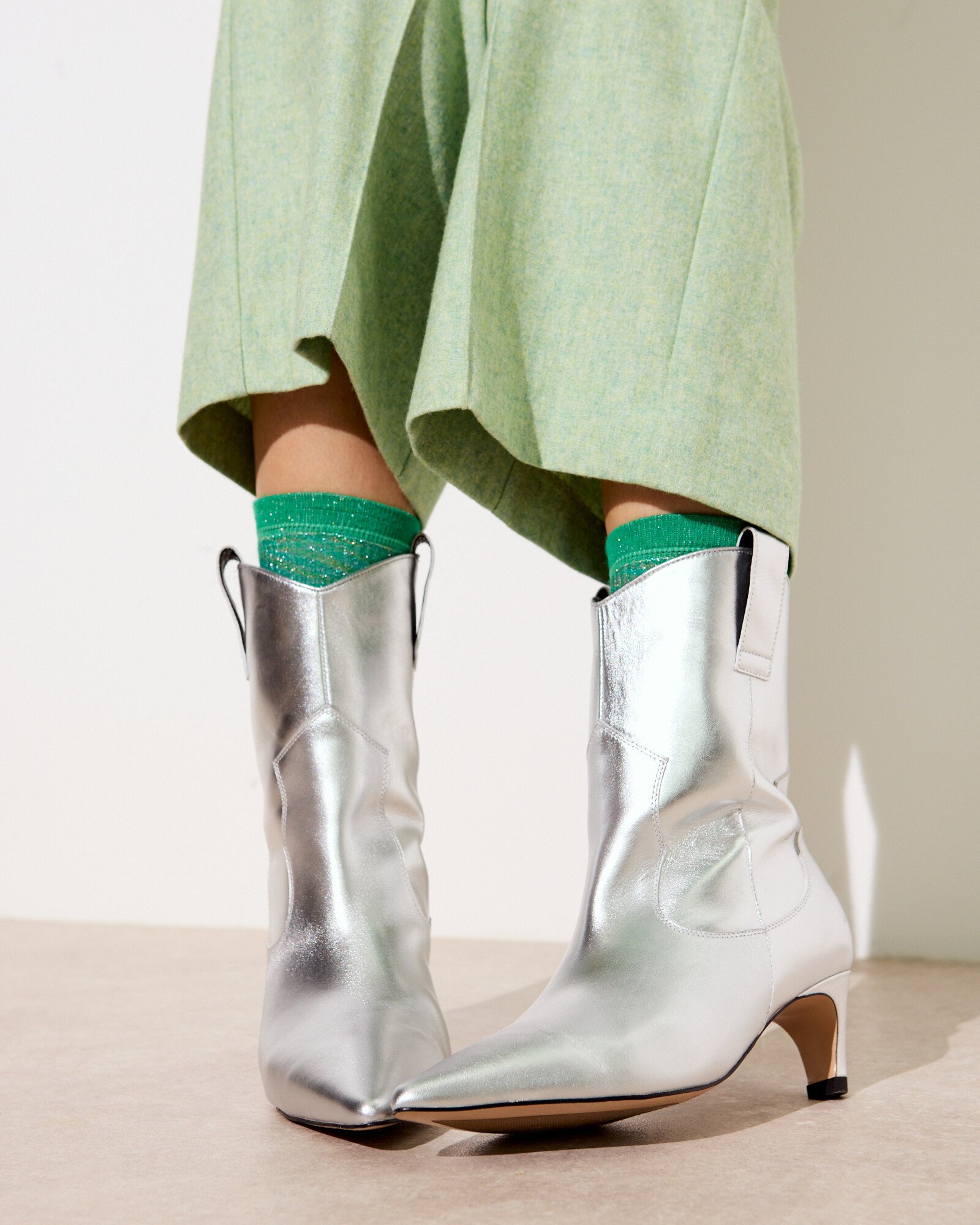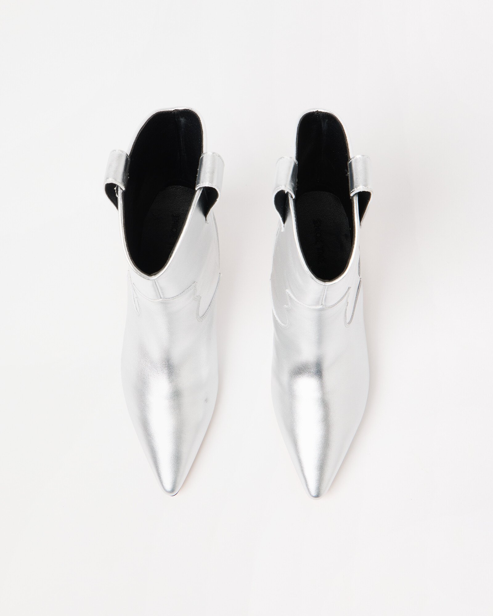 Western-inspired cowboy boots made from metallic silver leather, with a pointy toe and mid-high heel.