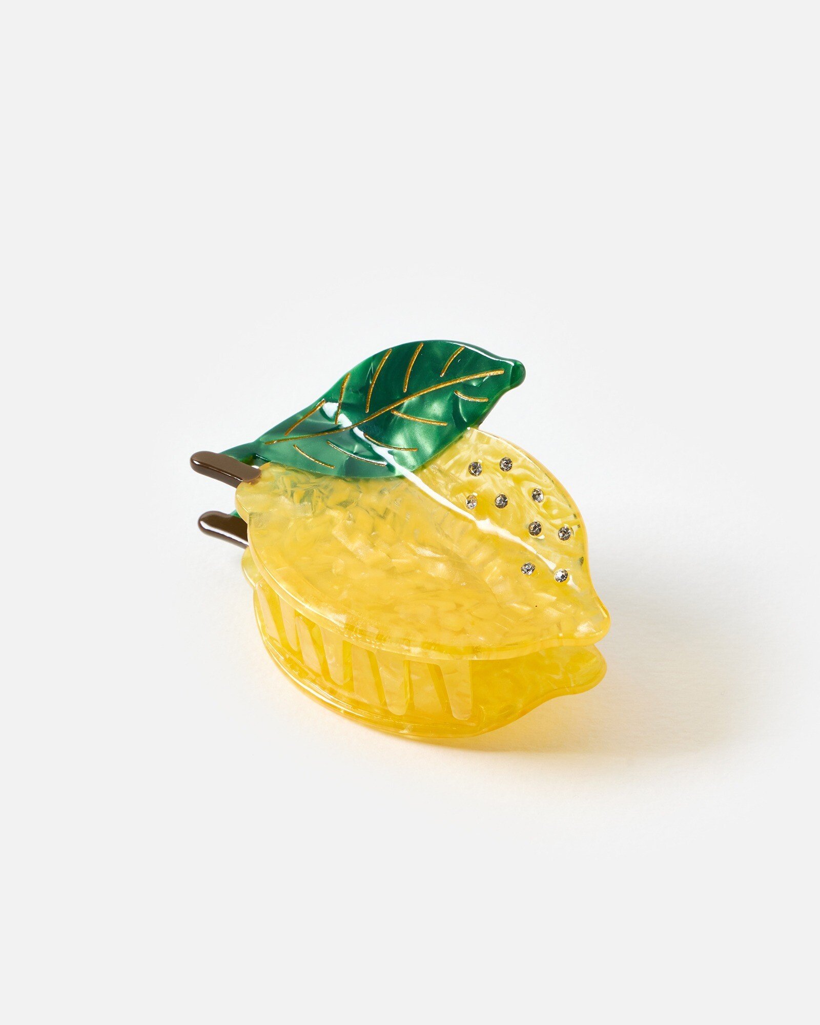 Add a fruity touch to your hairstyle with this playful lemon claw clip. In a vibrant yellow, it's embellished with gems and features gold embossed detailing on the leaf for added definition and sparkle.