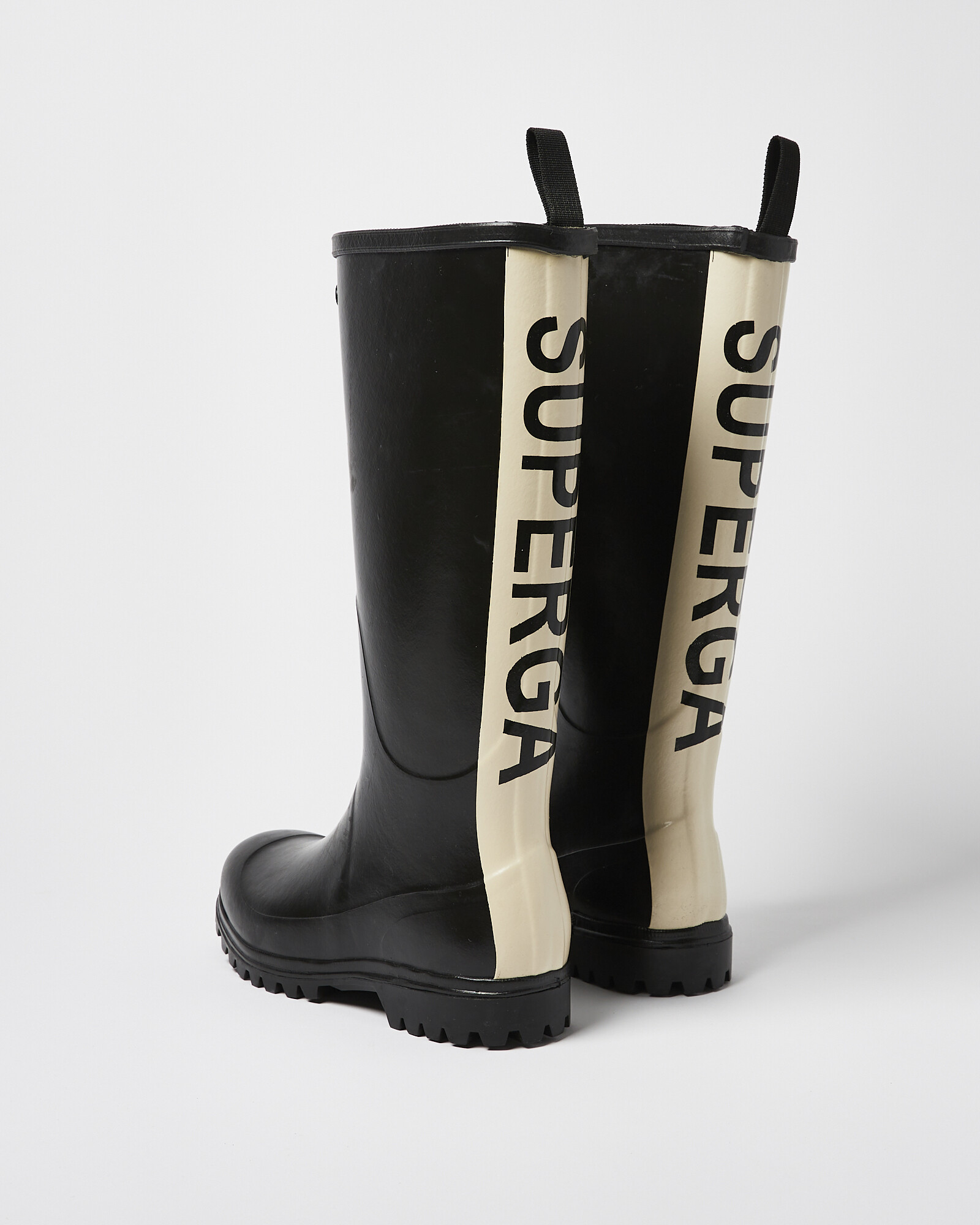 Keep dry on your winter walks with these black wellington boots by Superga. In a water resistant material, these boots have a cream strip down the back with the Superga logo largely printed on top. Thick soles and a rounded toe create a comfortable fit and are complete with a toggle at the back of the under the knee length openings for your ease.