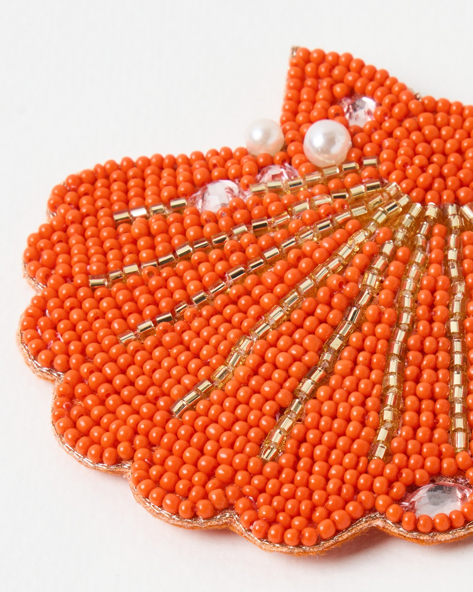 Give your hair look a touch of seaside charm with our beaded orange shell hair clip. Embellished with gold metallic beads, clear gems and faux pearls for a subtle shimmer.