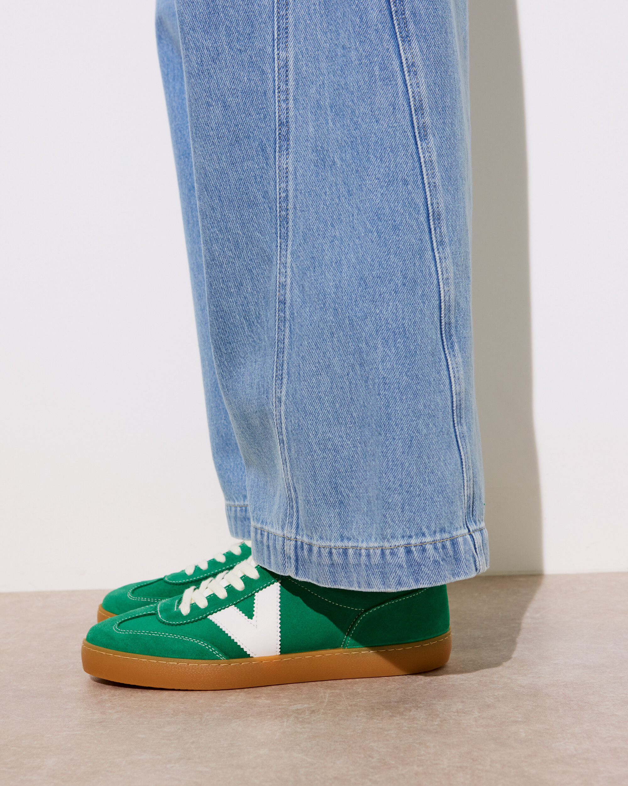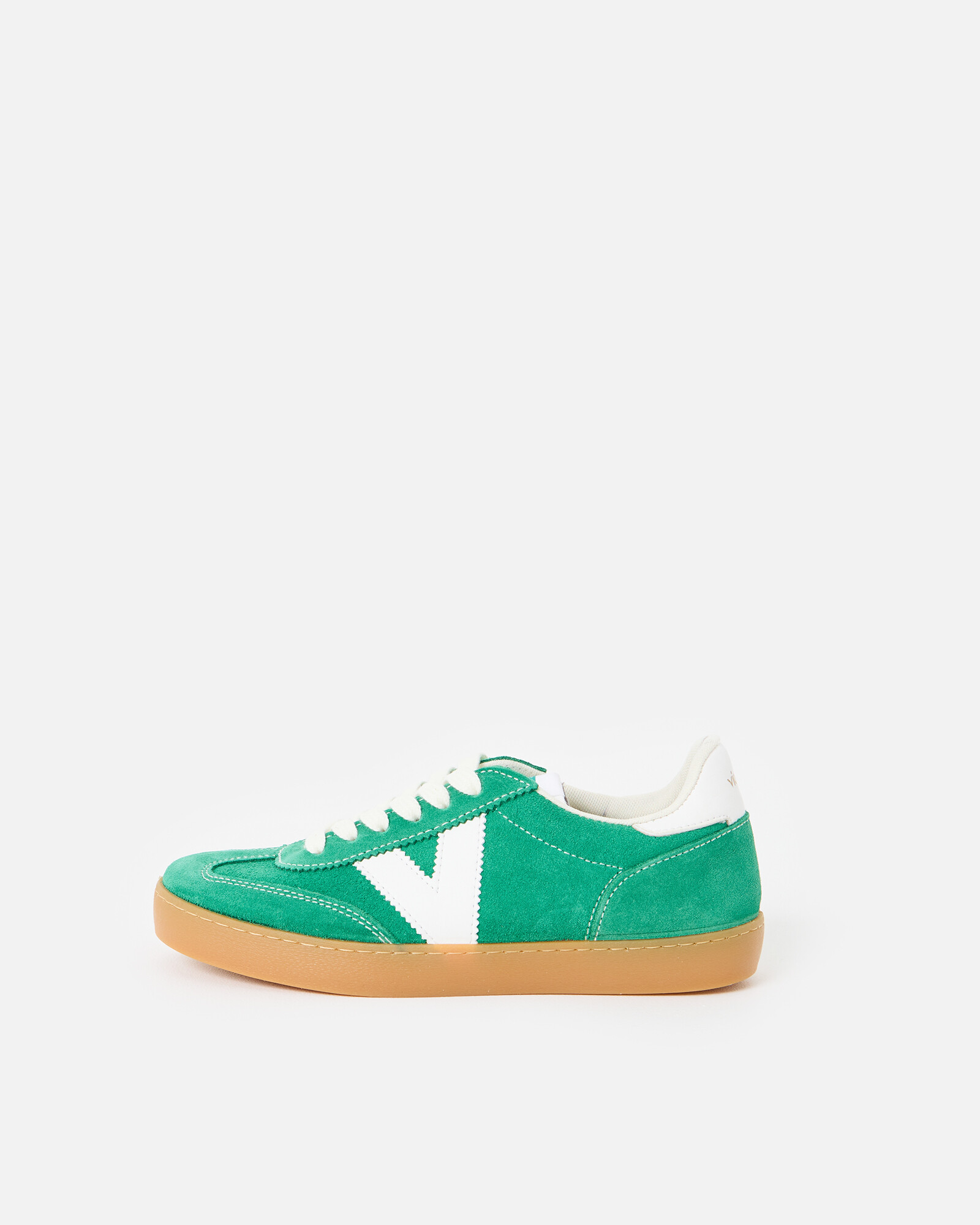 Green suede Victoria trainers with a retro-inspired gum sole, white leather V and contrasting white stitching.