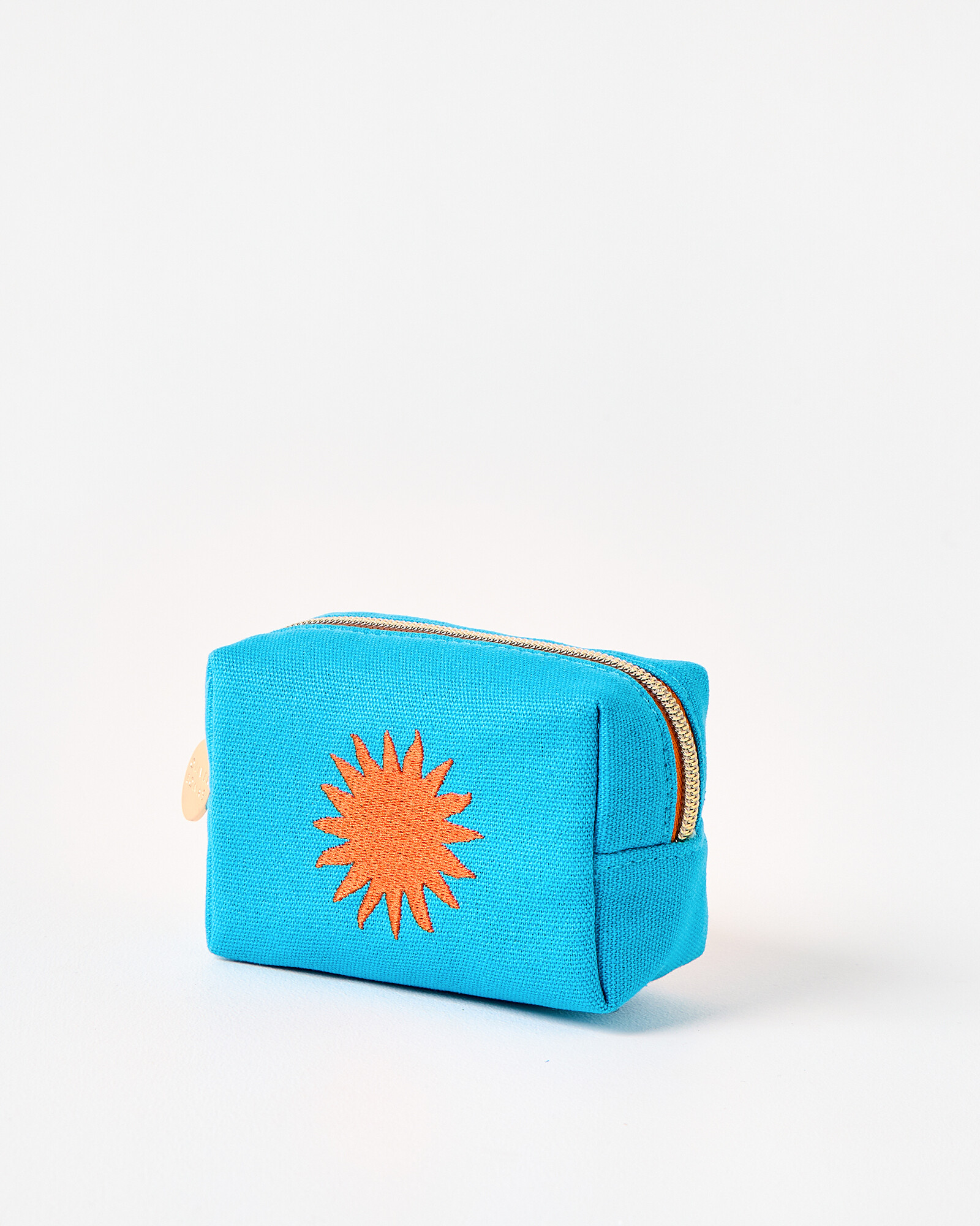 Small blue makeup bag in a boxy profile, with an embroidered orange sun motif, zip closure and golden disc pull with Oliver Bonas engraving. Lined with a tonal blue material and a slip pocket for organisation. Use to store small cosmetics and beauty tools for your travels.