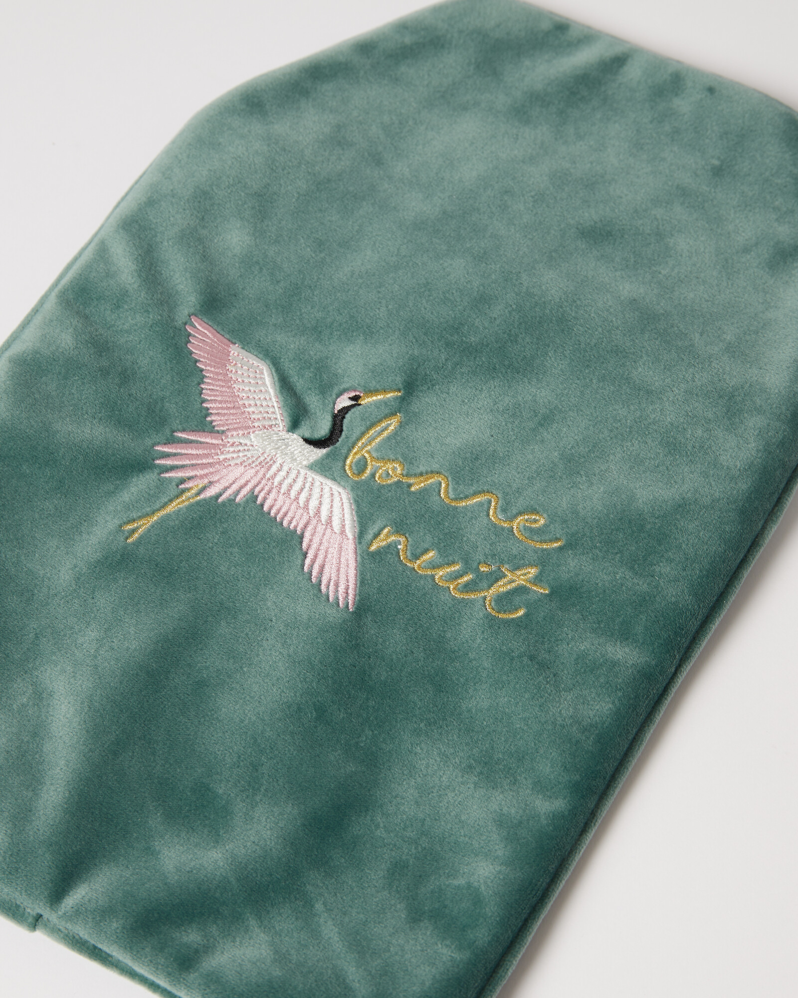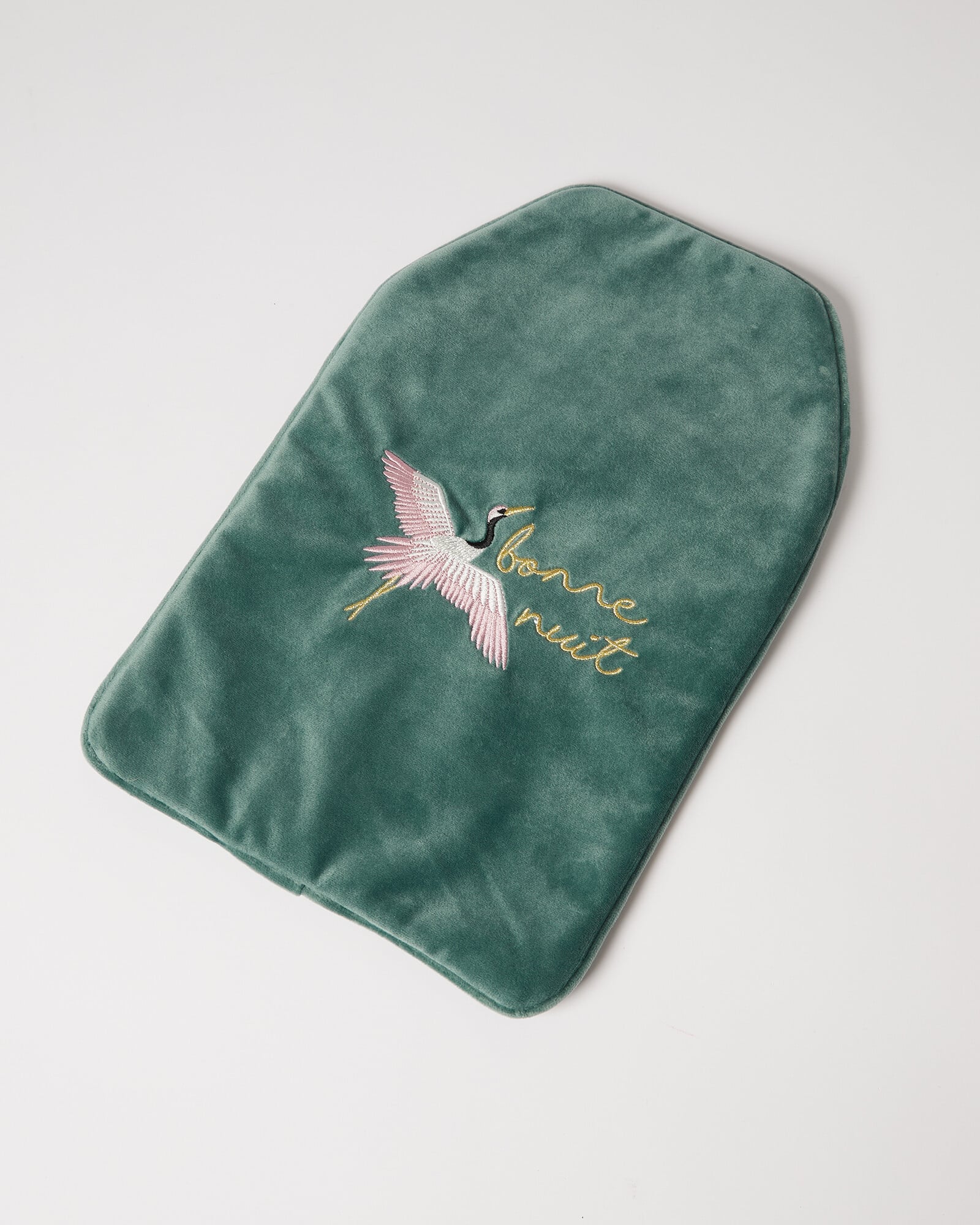 Float away to sweet dreams with this luxe hot water bottle, featuring a green velvet cover with a crane motif and 'bonne nuit' embroidery.